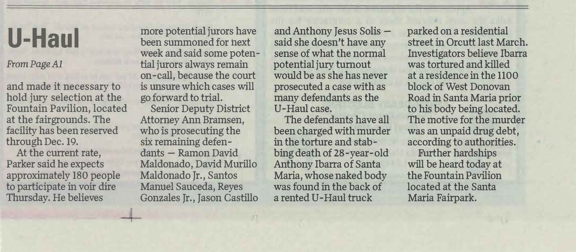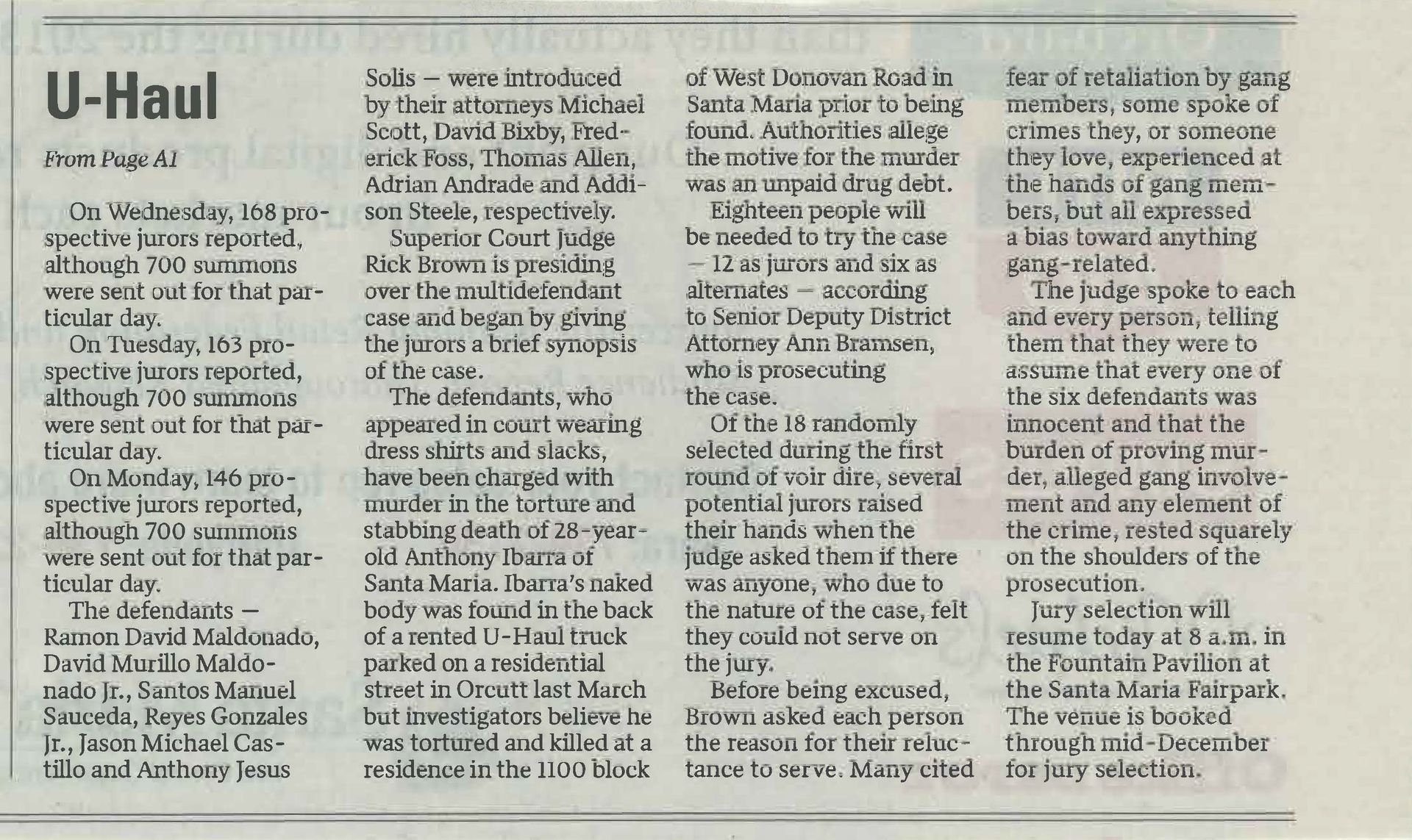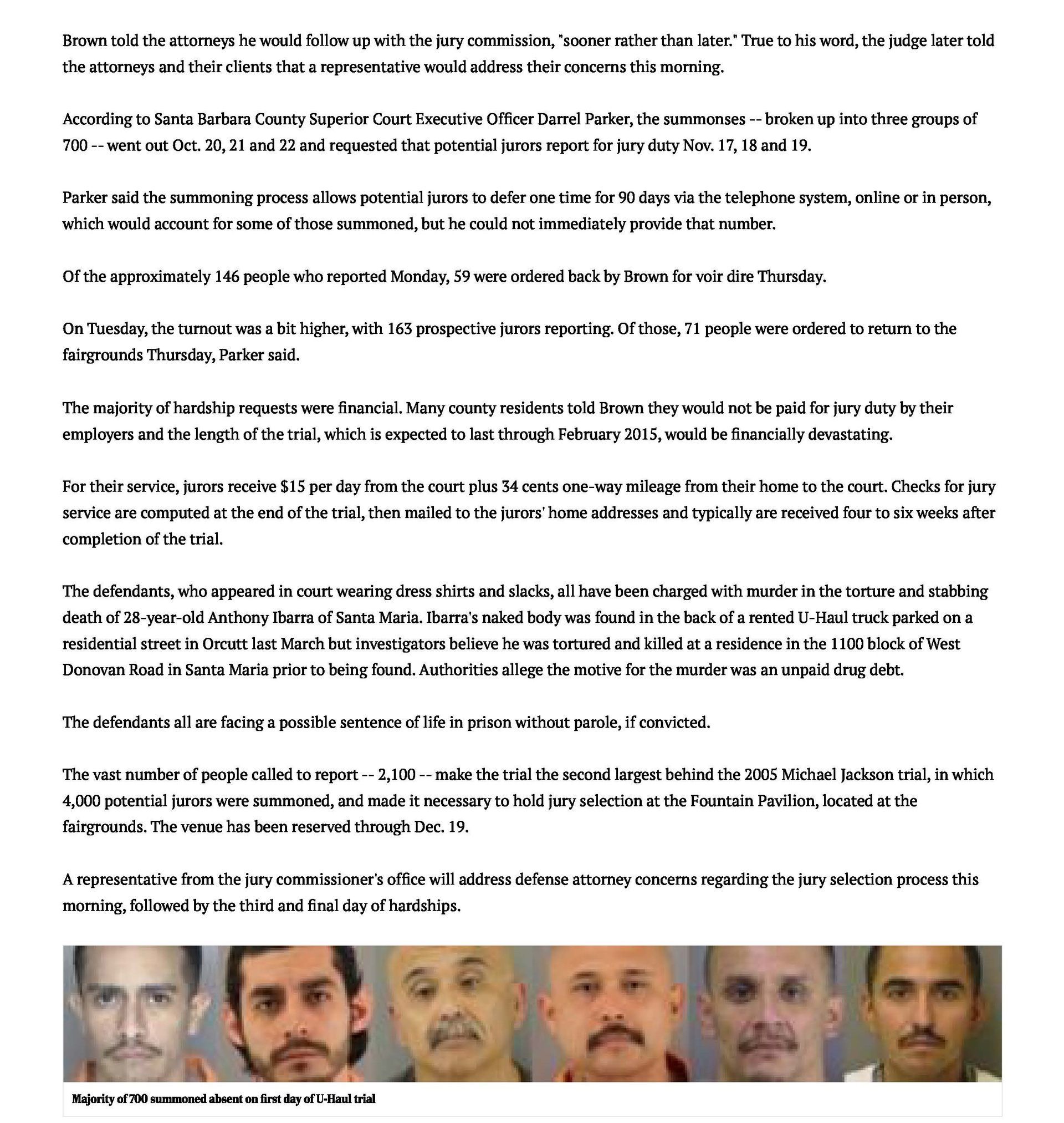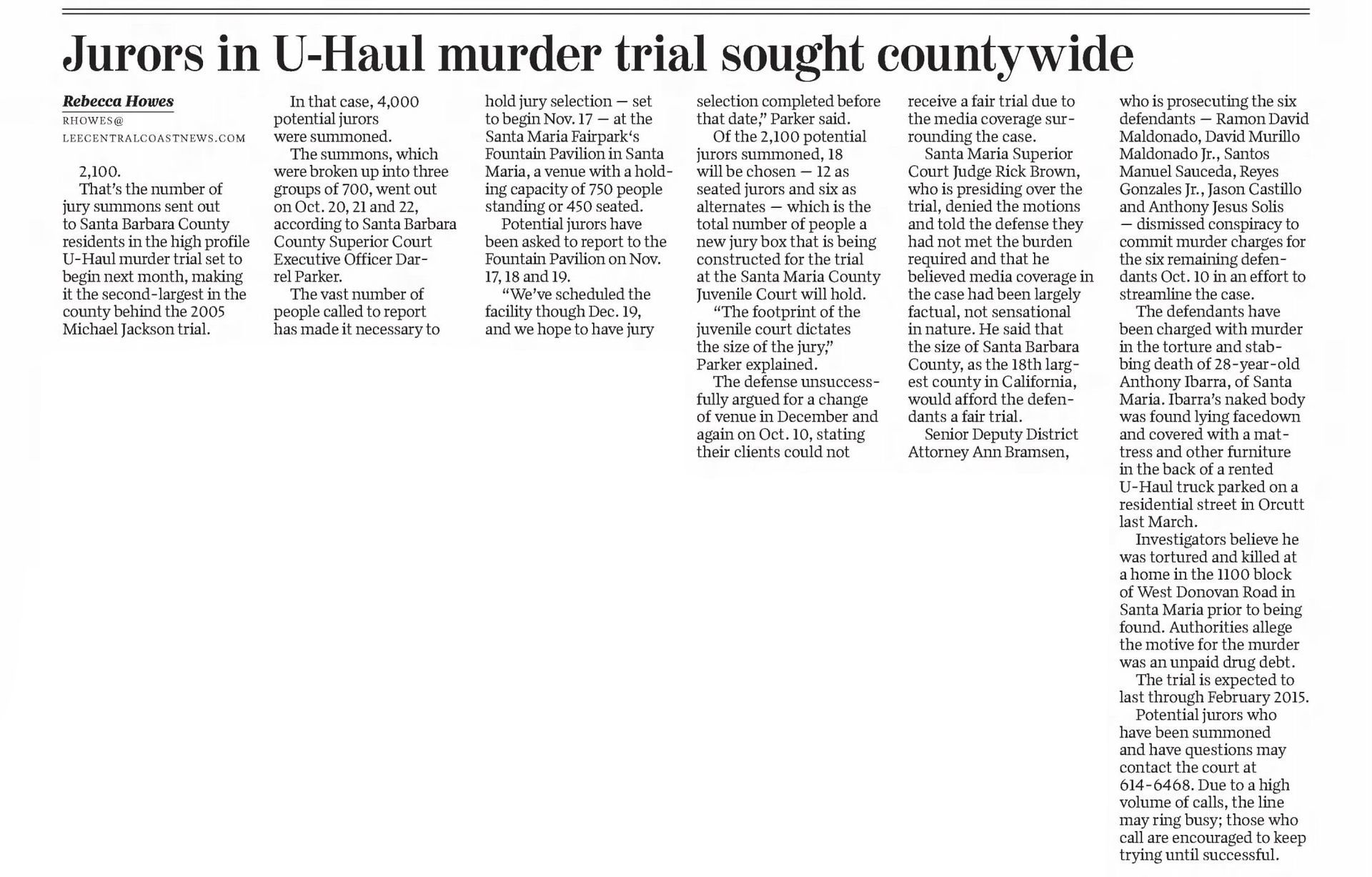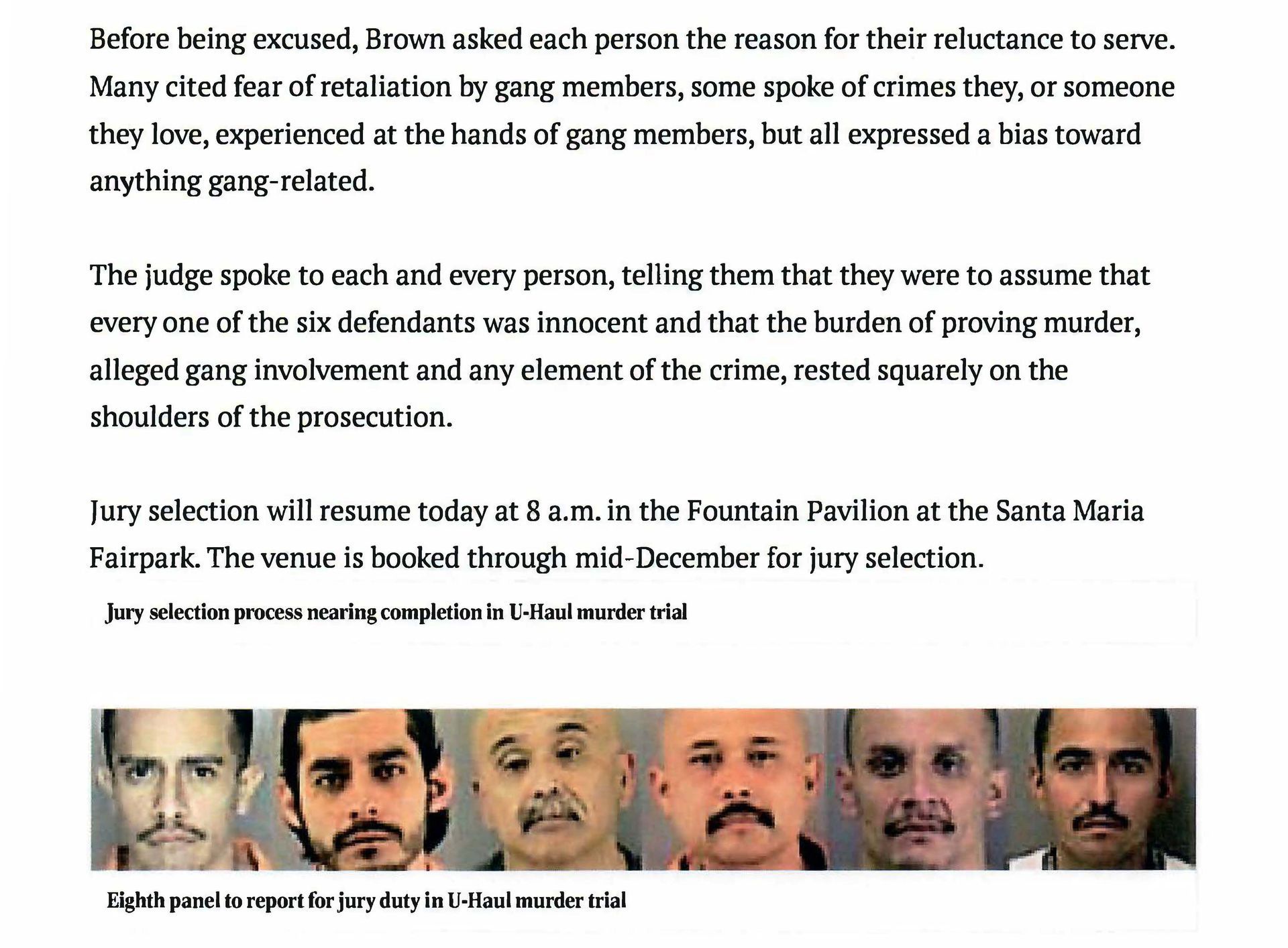 This was a particularly long and grueling murder trial. The press dubbed the case "The U-Haul Murder Trial" because the decedent's body was discovered in an abandoned U-Haul truck with his blood dripping out of the back of the truck. There were originally 13 co-defendants, not all of which were charged with murder. The plea negotiations parred it down to six co-defendants, all charged with murder, all with special circumstances that included torture and gang murder. All six defendants were facing LWOPP sentences. It was largest number of co-defendants in a murder trial ever in Santa Barbara County, and probably the state. There wasn't a courtroom in the county large enough for the trial. The largest courtroom in the county is at the Juvenile Court in Santa Maria, however it didn't have a jury box because juveniles do not have a right to a jury trial. The courtroom was modified by having a jury box built in it. However, even that was far too small for jury selection because of the several hundreds of prospective jurors would need to be called.