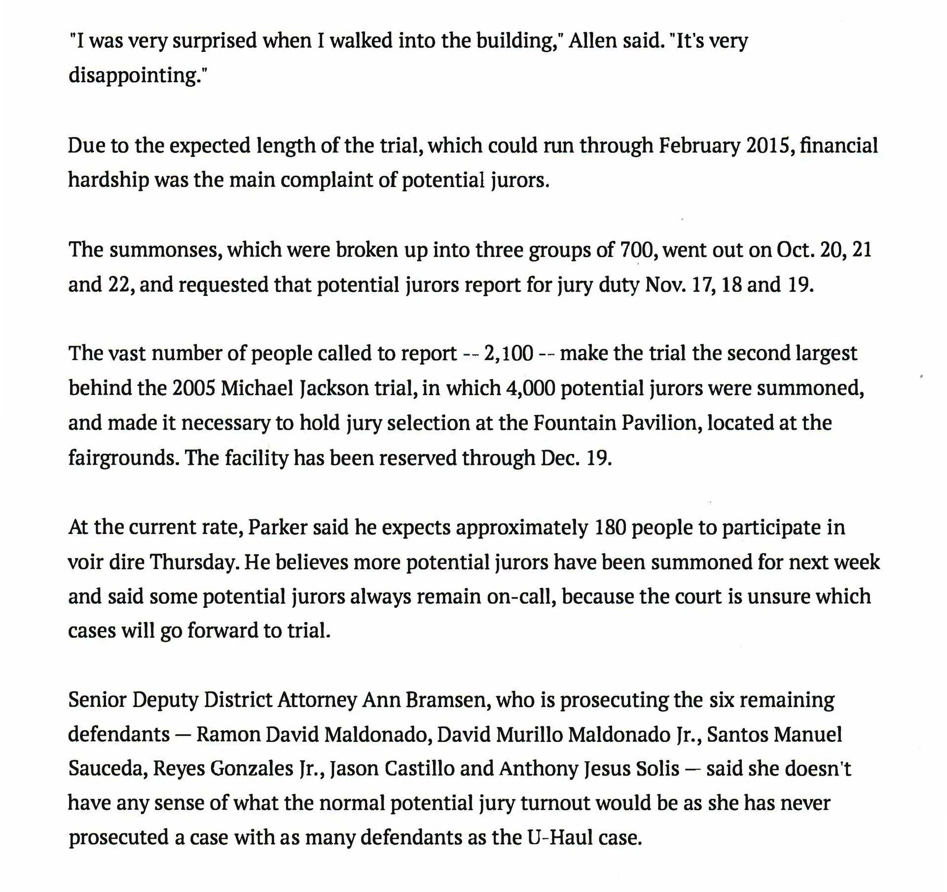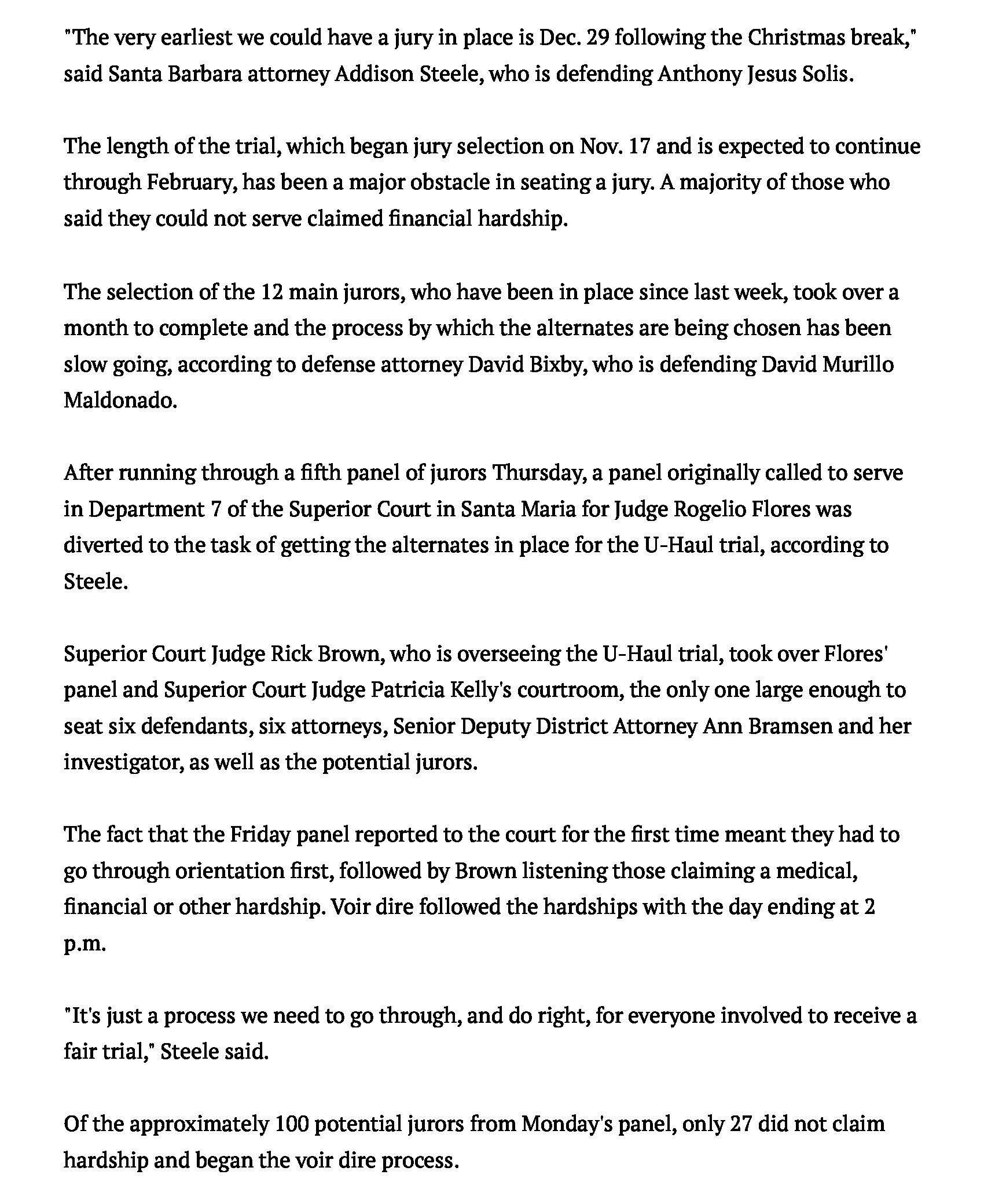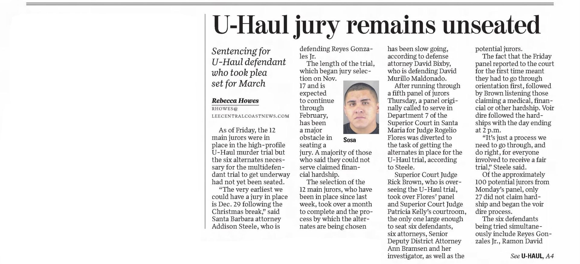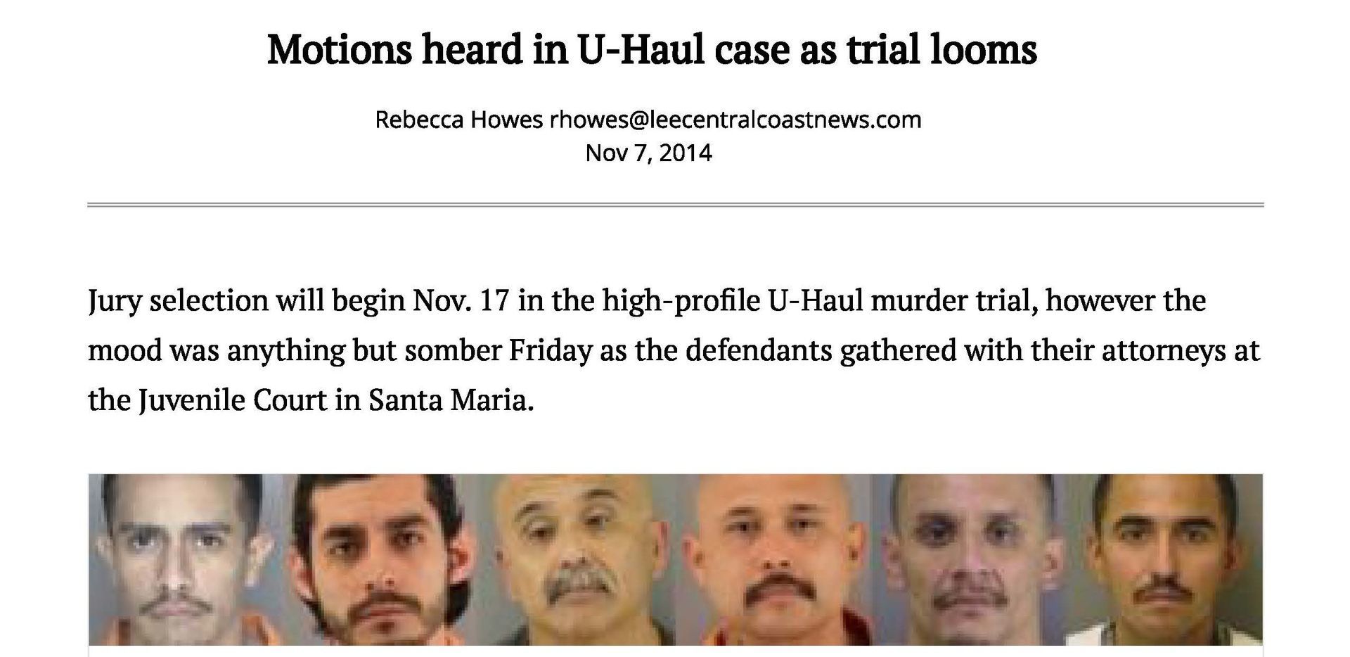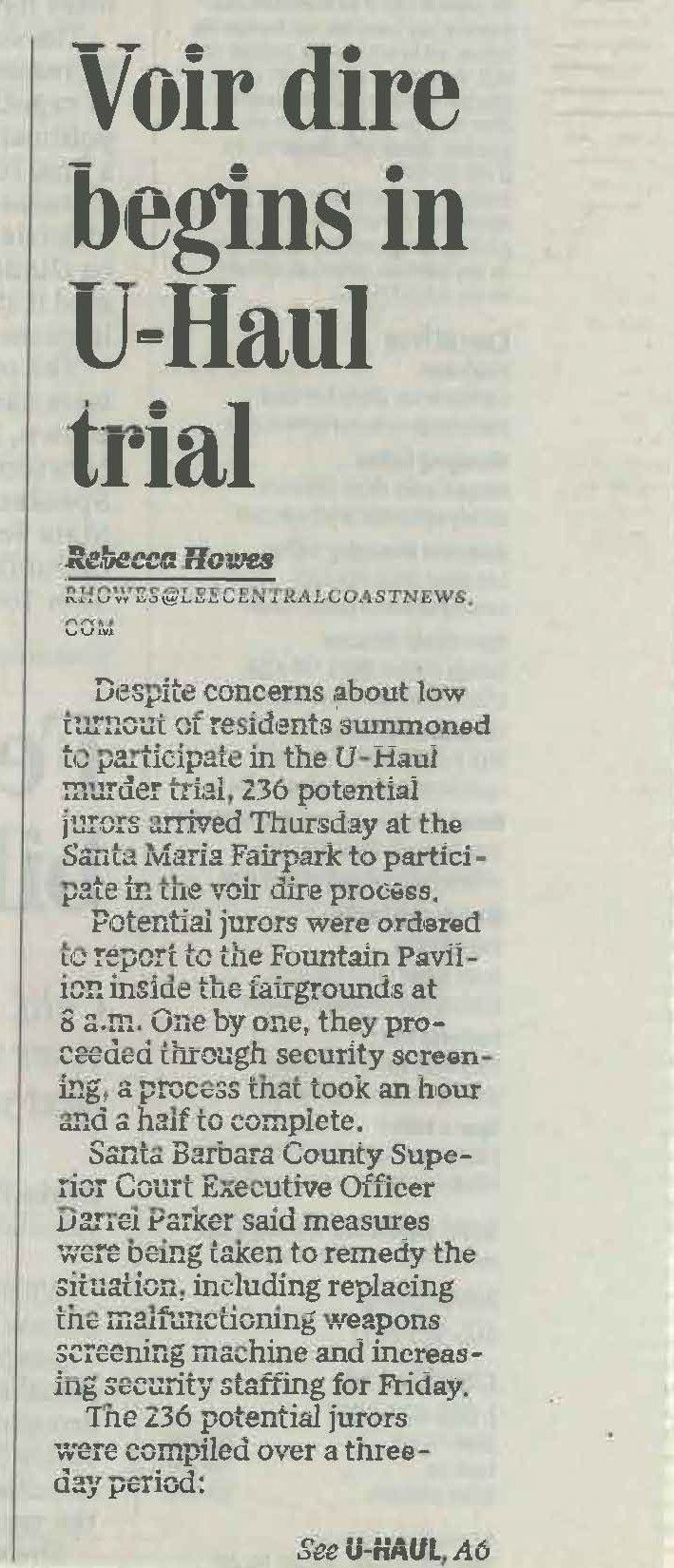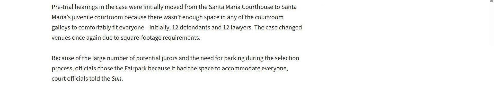 This was a particularly long and grueling murder trial. The press dubbed the case "The U-Haul Murder Trial" because the decedent's body was discovered in an abandoned U-Haul truck with his blood dripping out of the back of the truck. There were originally 13 co-defendants, not all of which were charged with murder. The plea negotiations parred it down to six co-defendants, all charged with murder, all with special circumstances that included torture and gang murder. All six defendants were facing LWOPP sentences. It was largest number of co-defendants in a murder trial ever in Santa Barbara County, and probably the state. There wasn't a courtroom in the county large enough for the trial. The largest courtroom in the county is at the Juvenile Court in Santa Maria, however it didn't have a jury box because juveniles do not have a right to a jury trial. The courtroom was modified by having a jury box built in it. However, even that was far too small for jury selection because of the several hundreds of prospective jurors would need to be called.