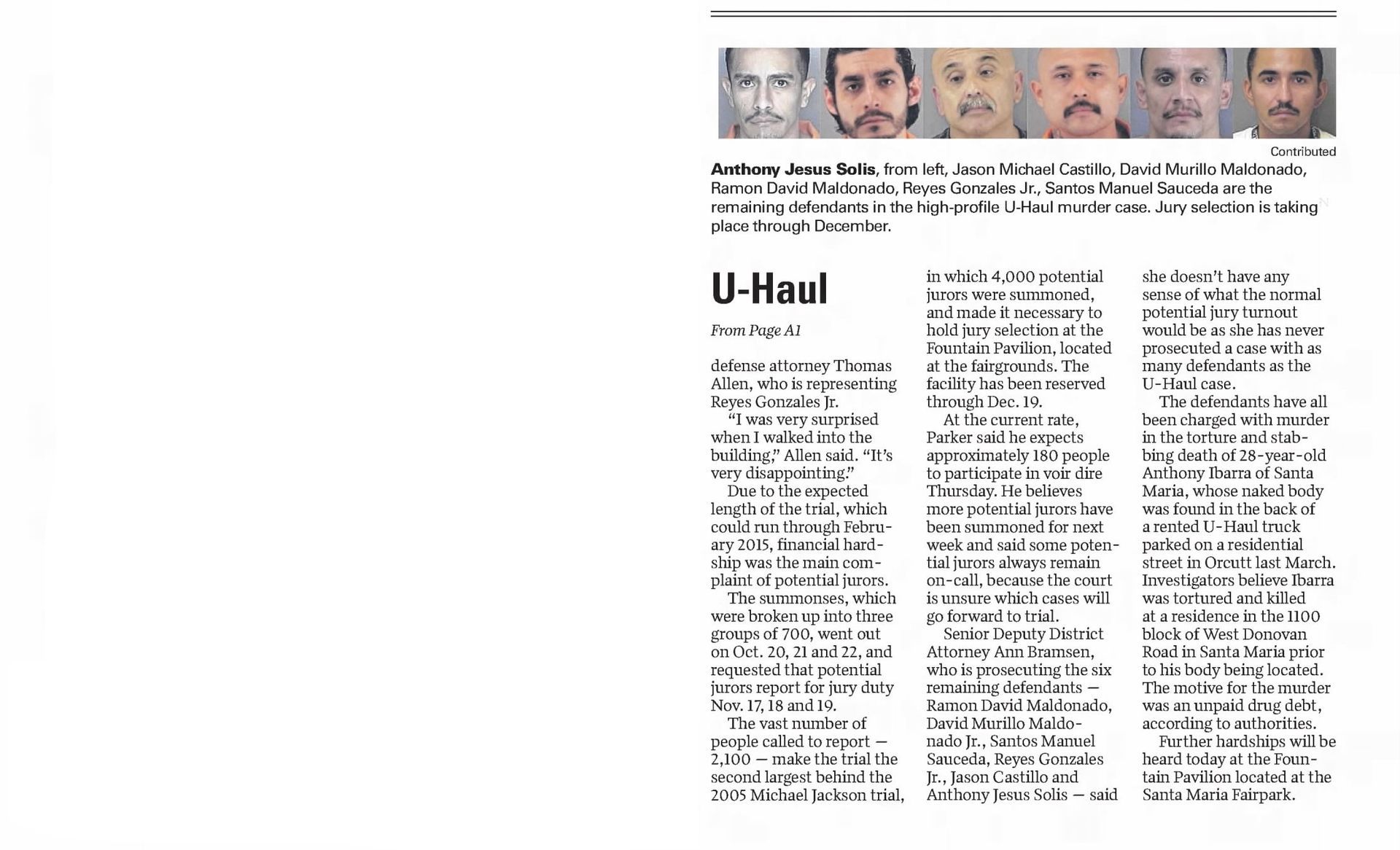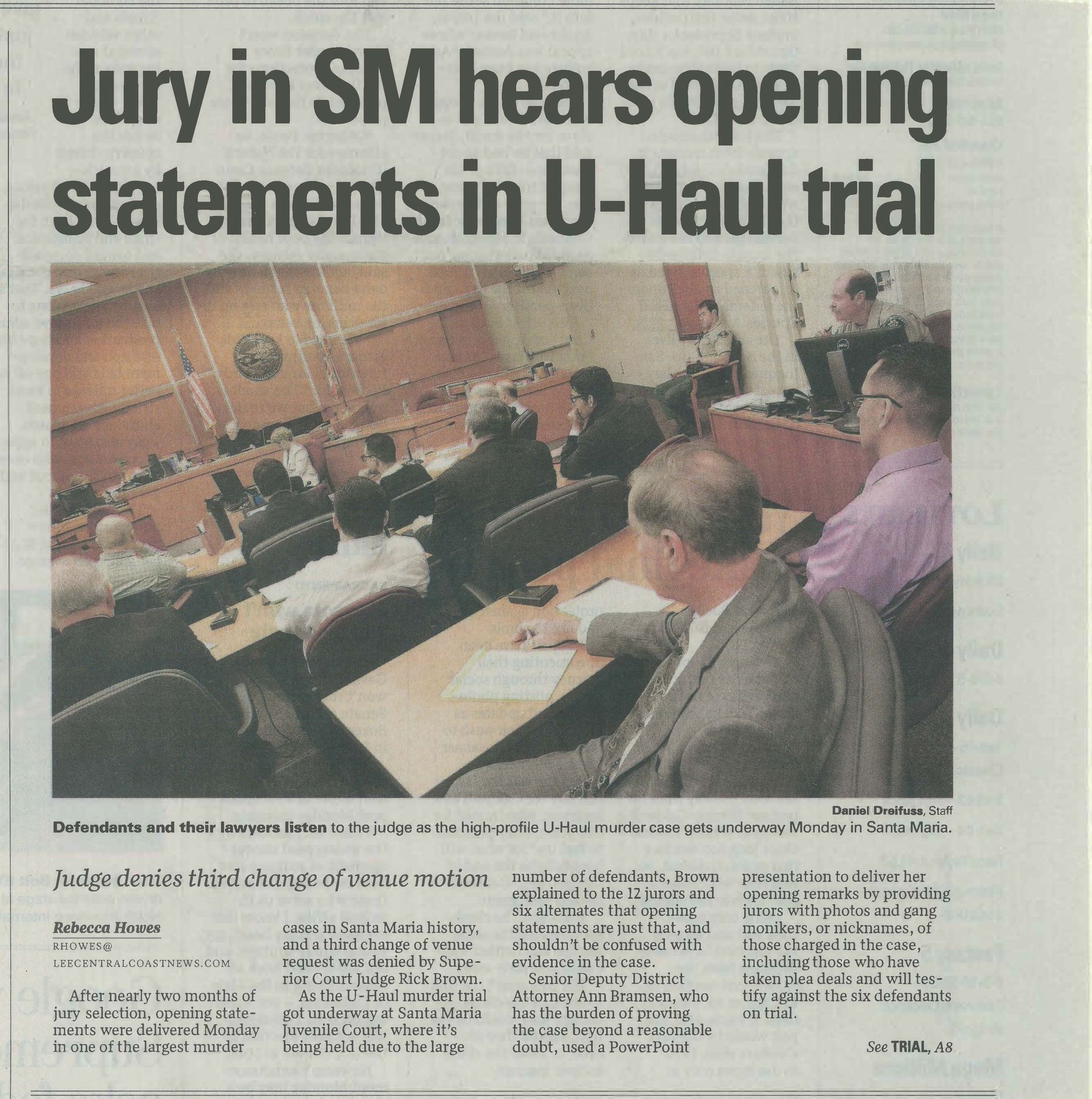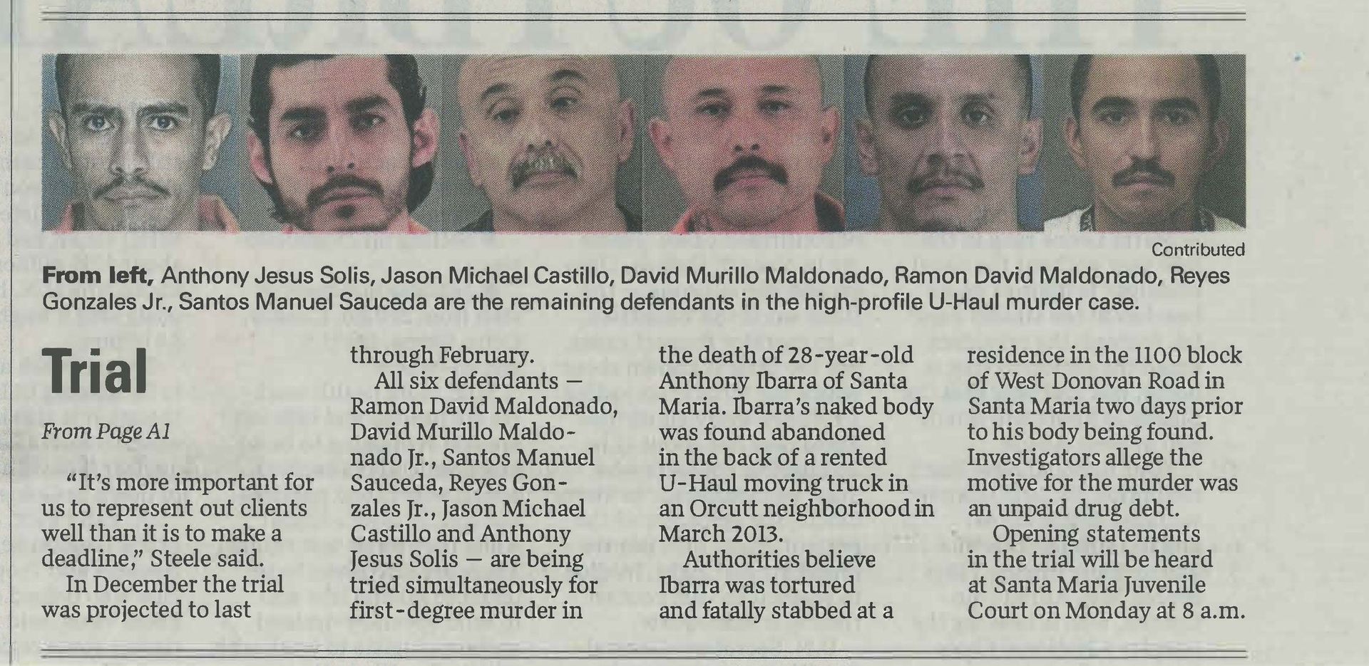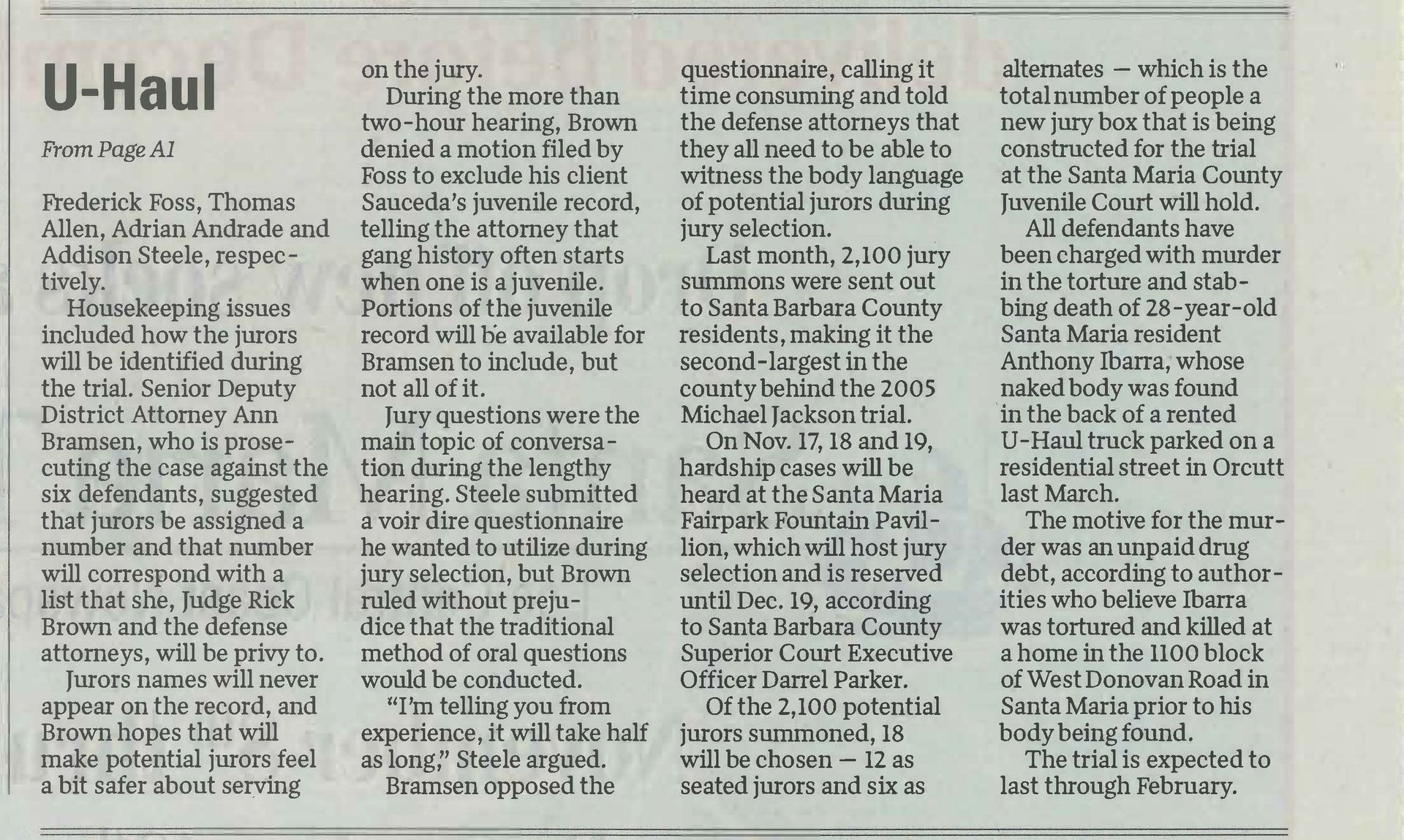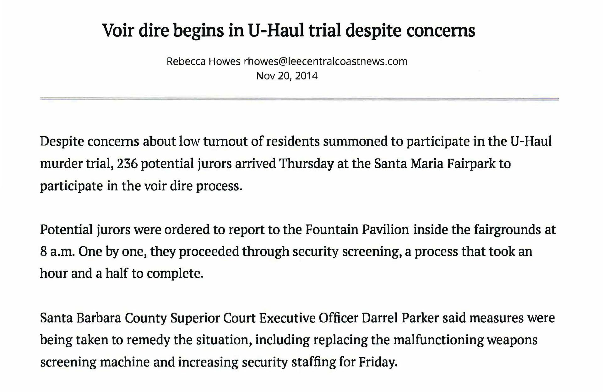This was a particularly long and grueling murder trial. The press dubbed the case "The U-Haul Murder Trial" because the decedent's body was discovered in an abandoned U-Haul truck with his blood dripping out of the back of the truck. There were originally 13 co-defendants, not all of which were charged with murder. The plea negotiations parred it down to six co-defendants, all charged with murder, all with special circumstances that included torture and gang murder. All six defendants were facing LWOPP sentences. It was largest number of co-defendants in a murder trial ever in Santa Barbara County, and probably the state. There wasn't a courtroom in the county large enough for the trial. The largest courtroom in the county is at the Juvenile Court in Santa Maria, however it didn't have a jury box because juveniles do not have a right to a jury trial. The courtroom was modified by having a jury box built in it. However, even that was far too small for jury selection because of the several hundreds of prospective jurors would need to be called.