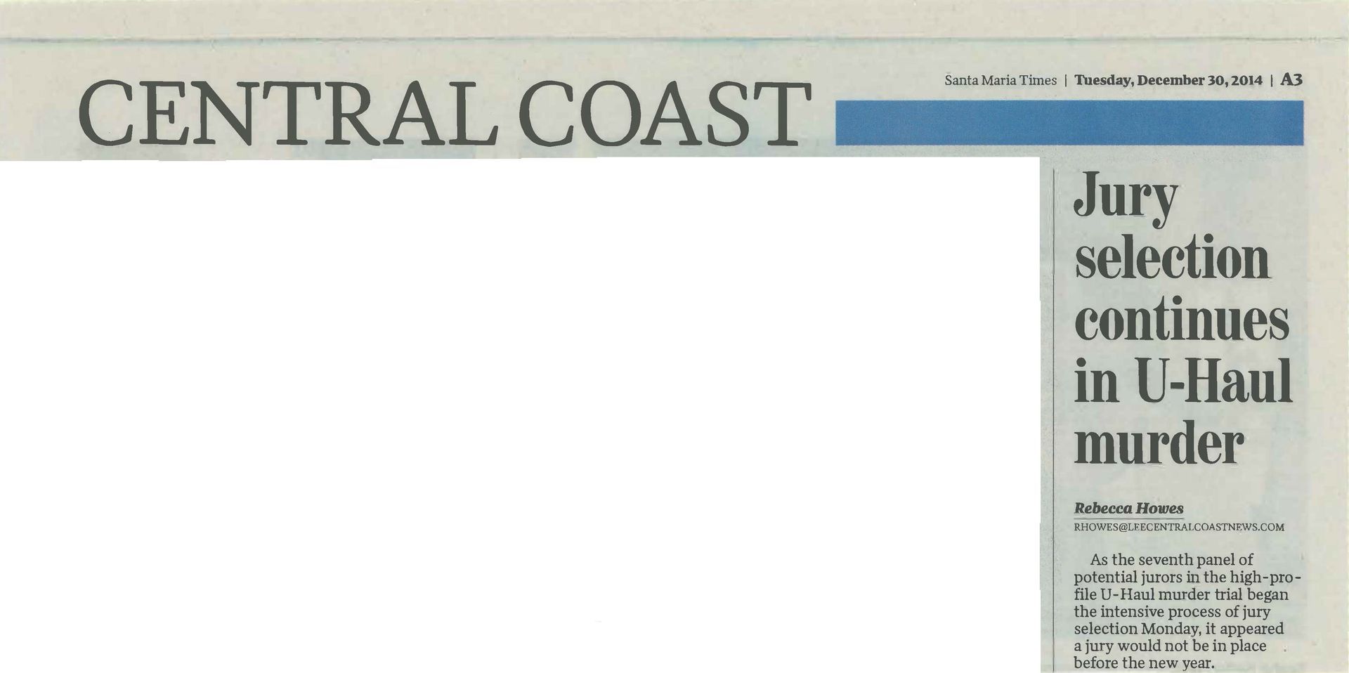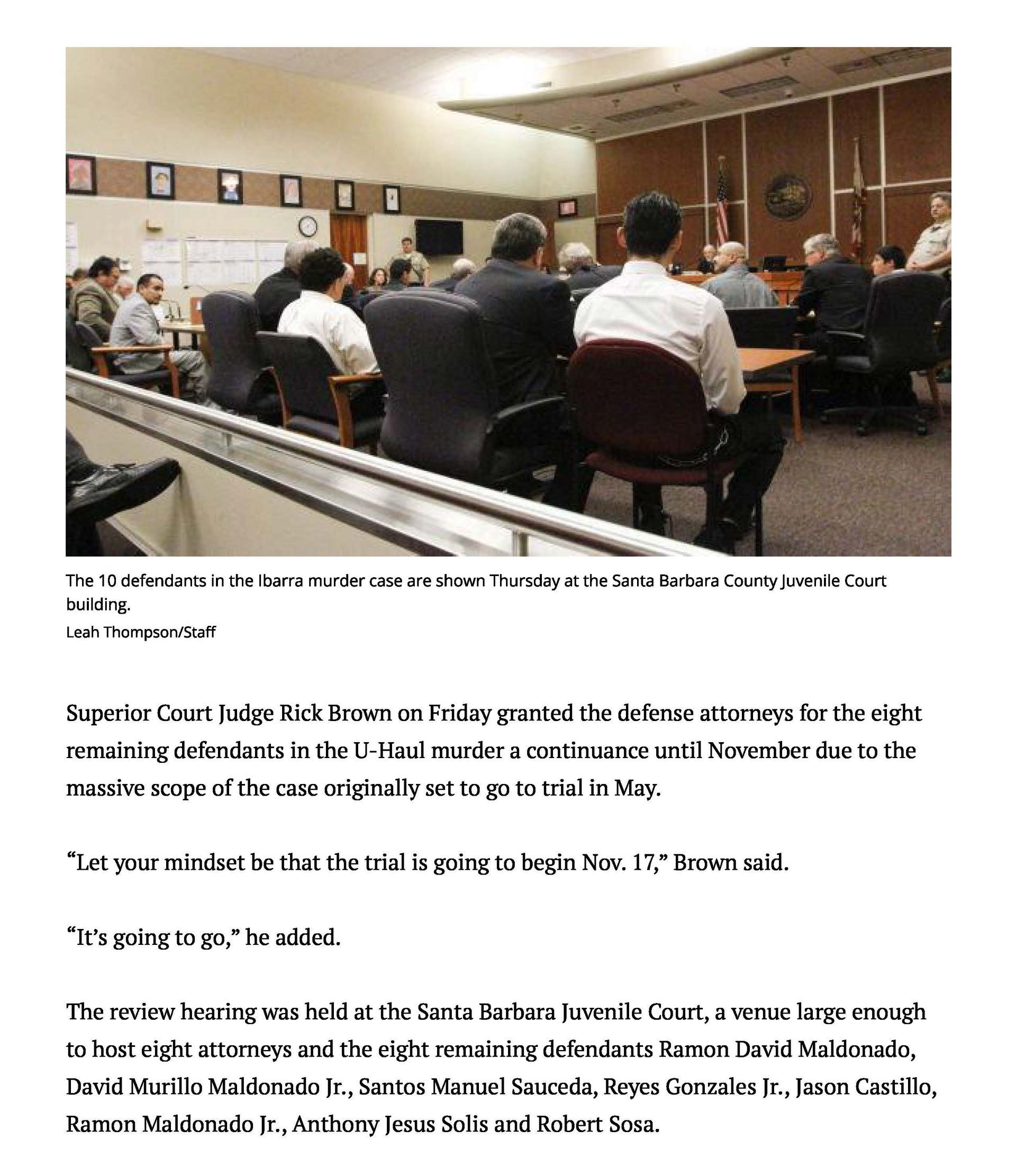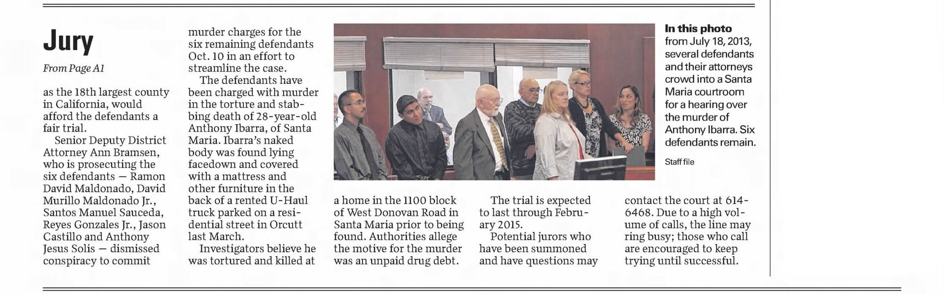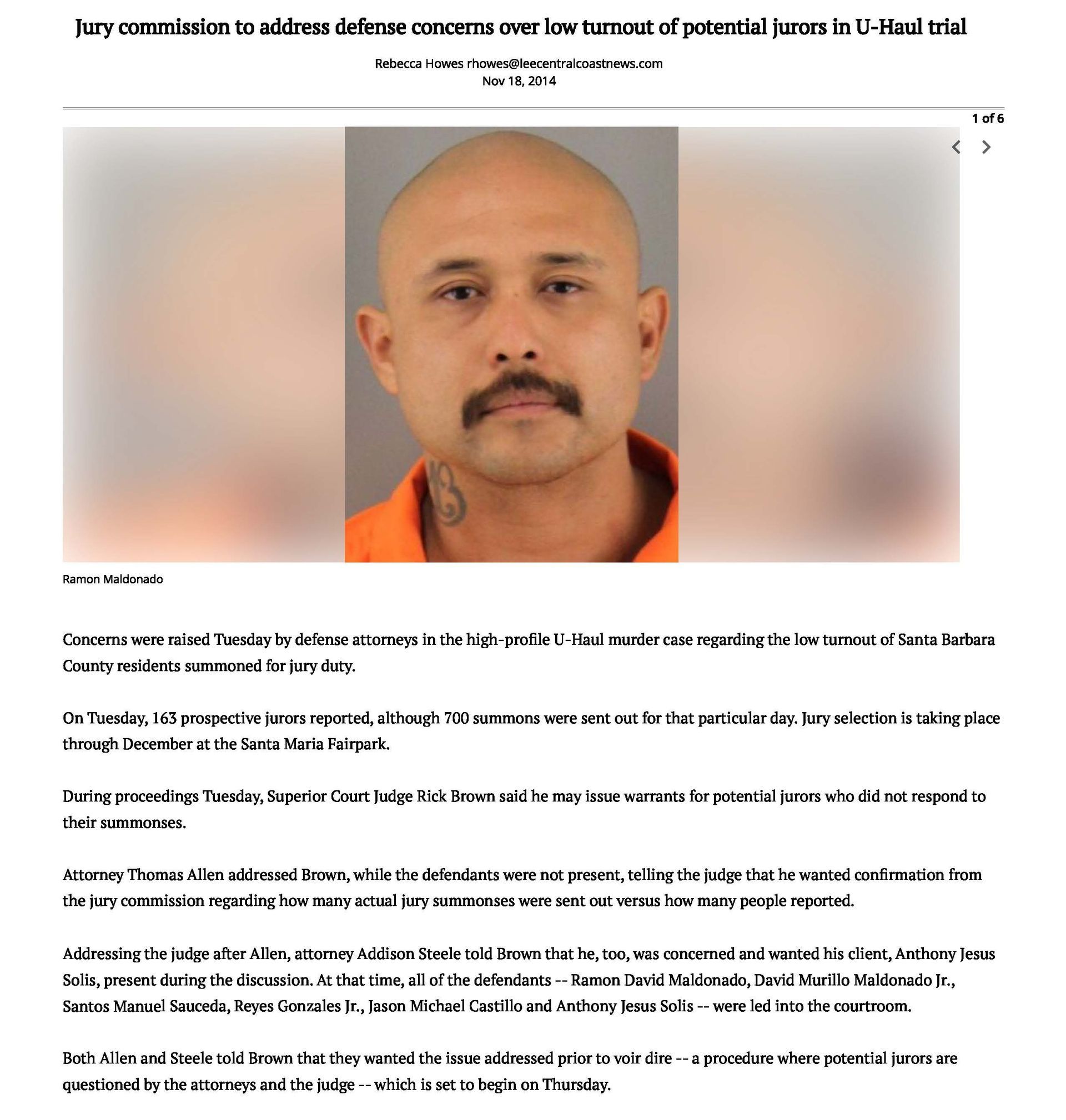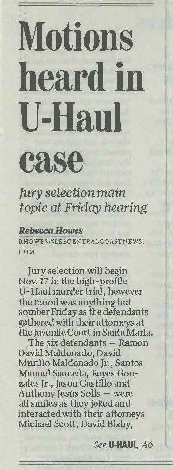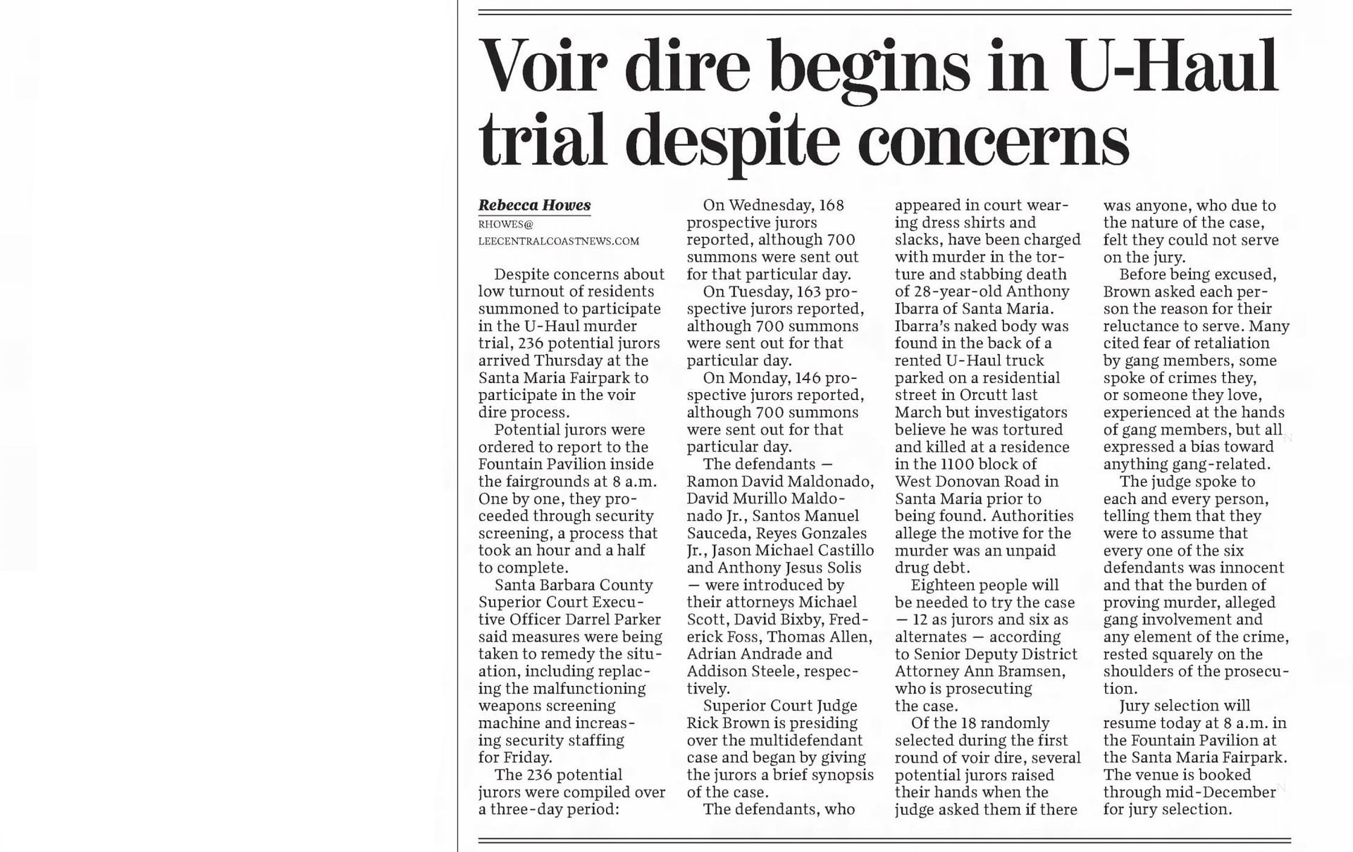 This was a particularly long and grueling murder trial. The press dubbed the case "The U-Haul Murder Trial" because the decedent's body was discovered in an abandoned U-Haul truck with his blood dripping out of the back of the truck. There were originally 13 co-defendants, not all of which were charged with murder. The plea negotiations parred it down to six co-defendants, all charged with murder, all with special circumstances that included torture and gang murder. All six defendants were facing LWOPP sentences. It was largest number of co-defendants in a murder trial ever in Santa Barbara County, and probably the state. There wasn't a courtroom in the county large enough for the trial. The largest courtroom in the county is at the Juvenile Court in Santa Maria, however it didn't have a jury box because juveniles do not have a right to a jury trial. The courtroom was modified by having a jury box built in it. However, even that was far too small for jury selection because of the several hundreds of prospective jurors would need to be called.