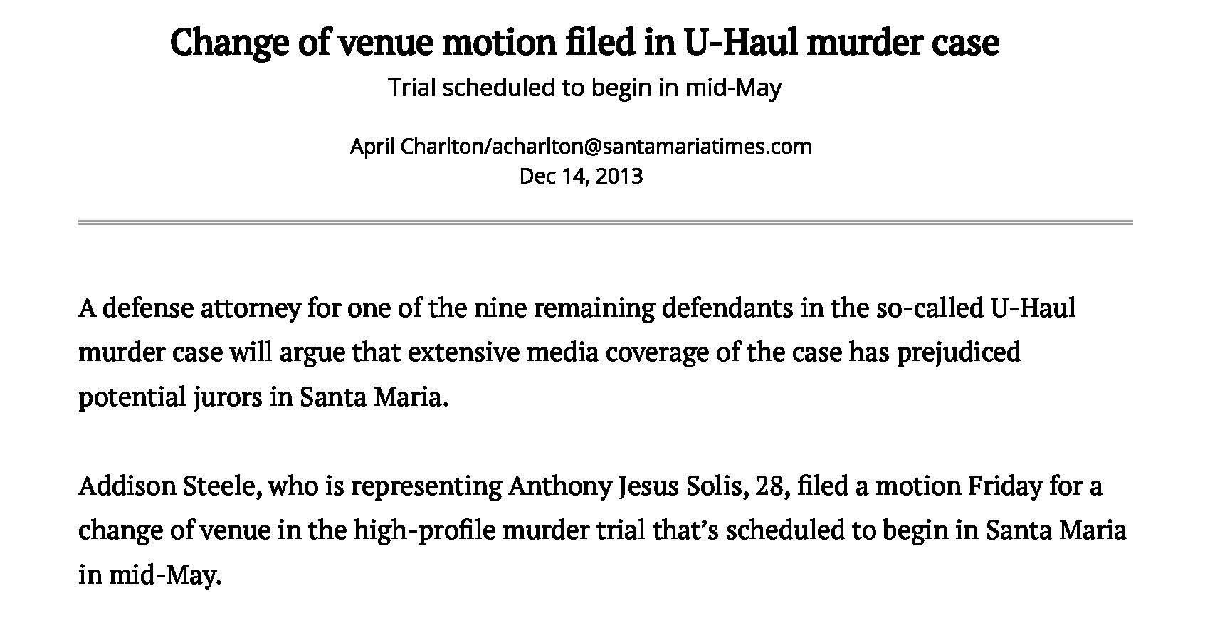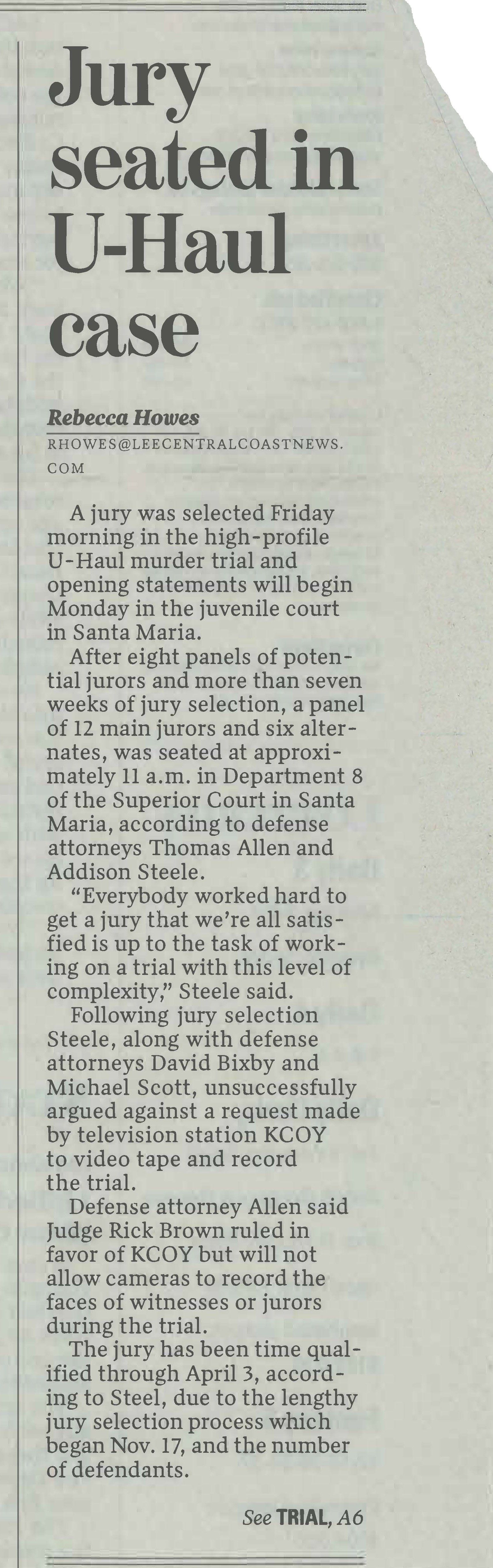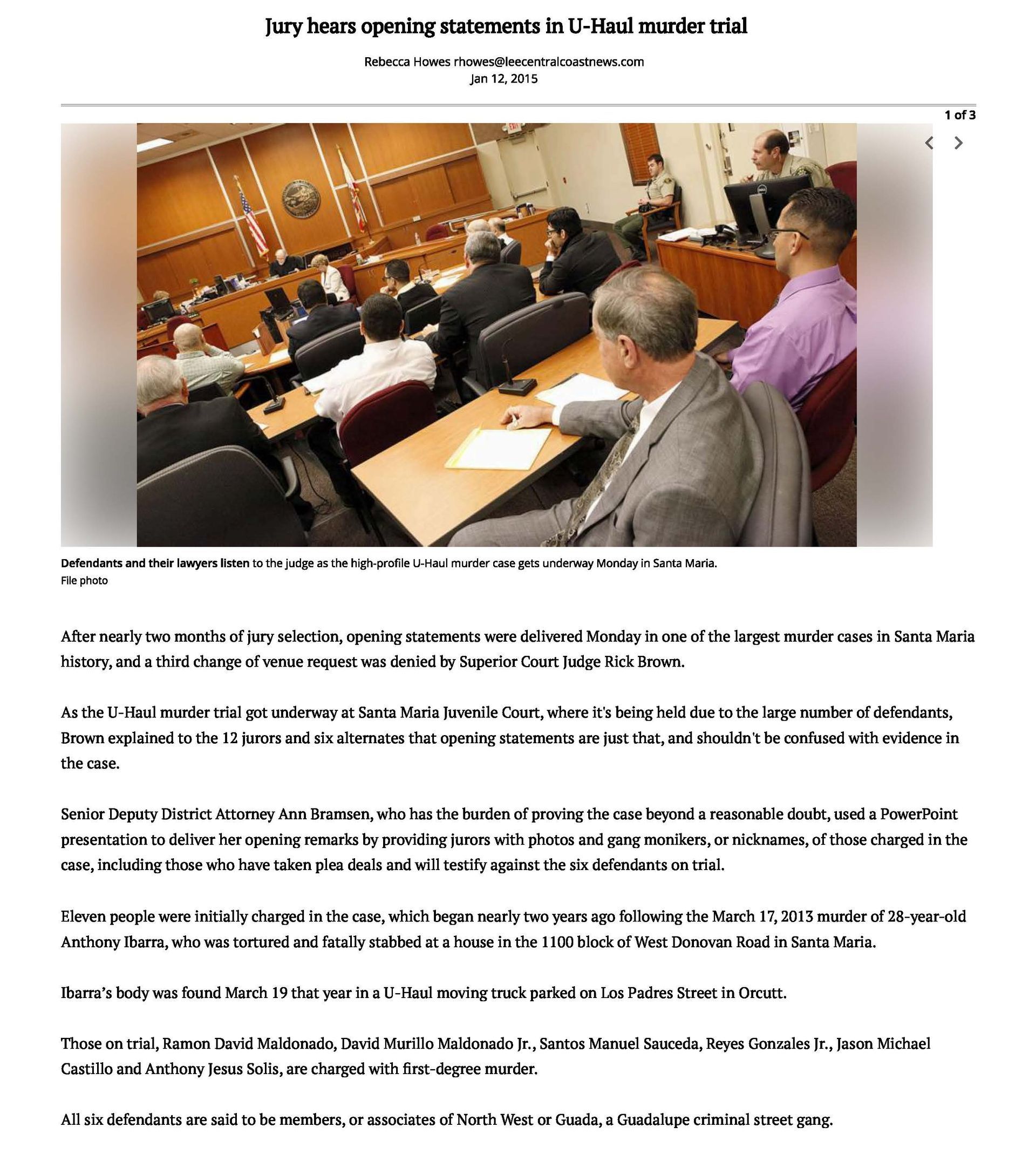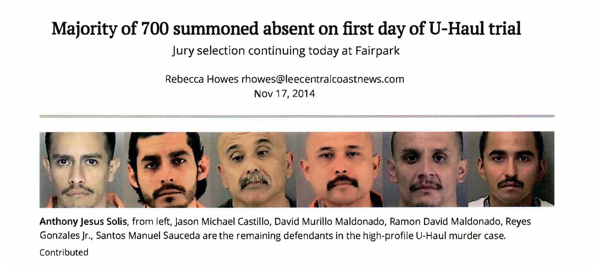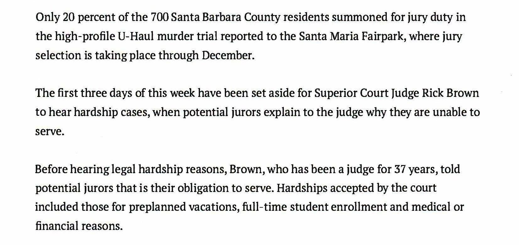 This was a particularly long and grueling murder trial. The press dubbed the case "The U-Haul Murder Trial" because the decedent's body was discovered in an abandoned U-Haul truck with his blood dripping out of the back of the truck. There were originally 13 co-defendants, not all of which were charged with murder. The plea negotiations parred it down to six co-defendants, all charged with murder, all with special circumstances that included torture and gang murder. All six defendants were facing LWOPP sentences. It was largest number of co-defendants in a murder trial ever in Santa Barbara County, and probably the state. There wasn't a courtroom in the county large enough for the trial. The largest courtroom in the county is at the Juvenile Court in Santa Maria, however it didn't have a jury box because juveniles do not have a right to a jury trial. The courtroom was modified by having a jury box built in it. However, even that was far too small for jury selection because of the several hundreds of prospective jurors would need to be called.