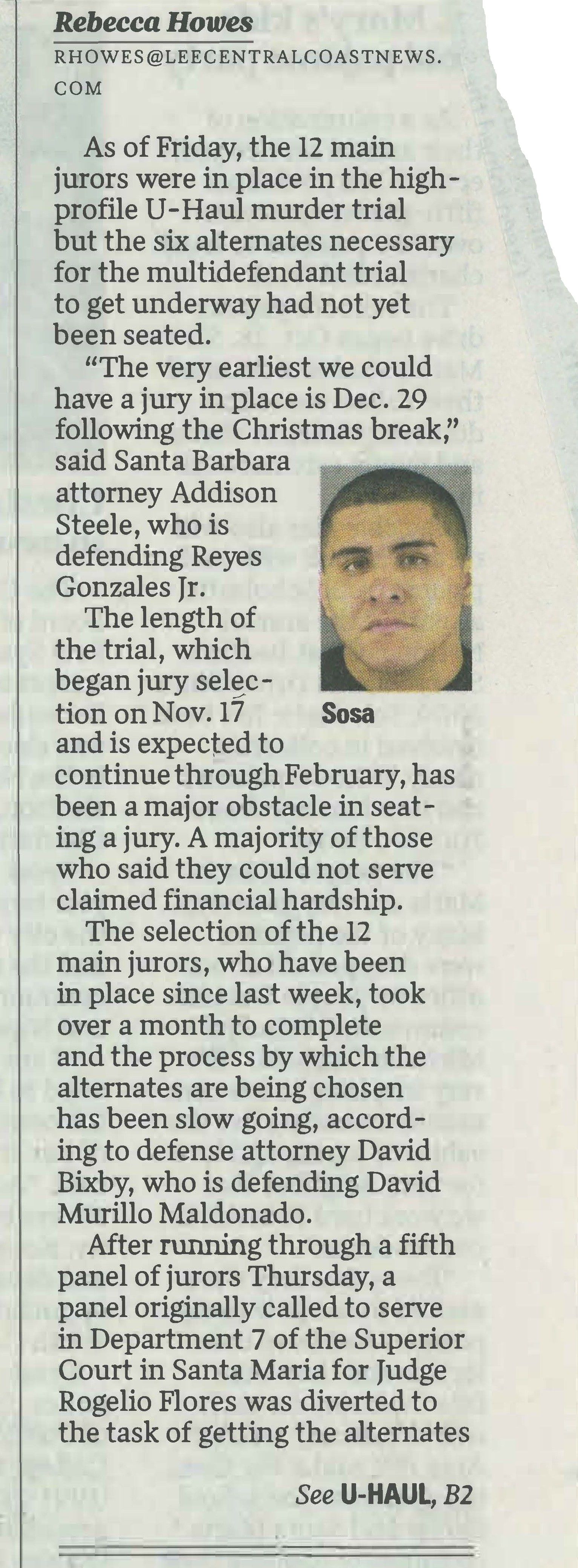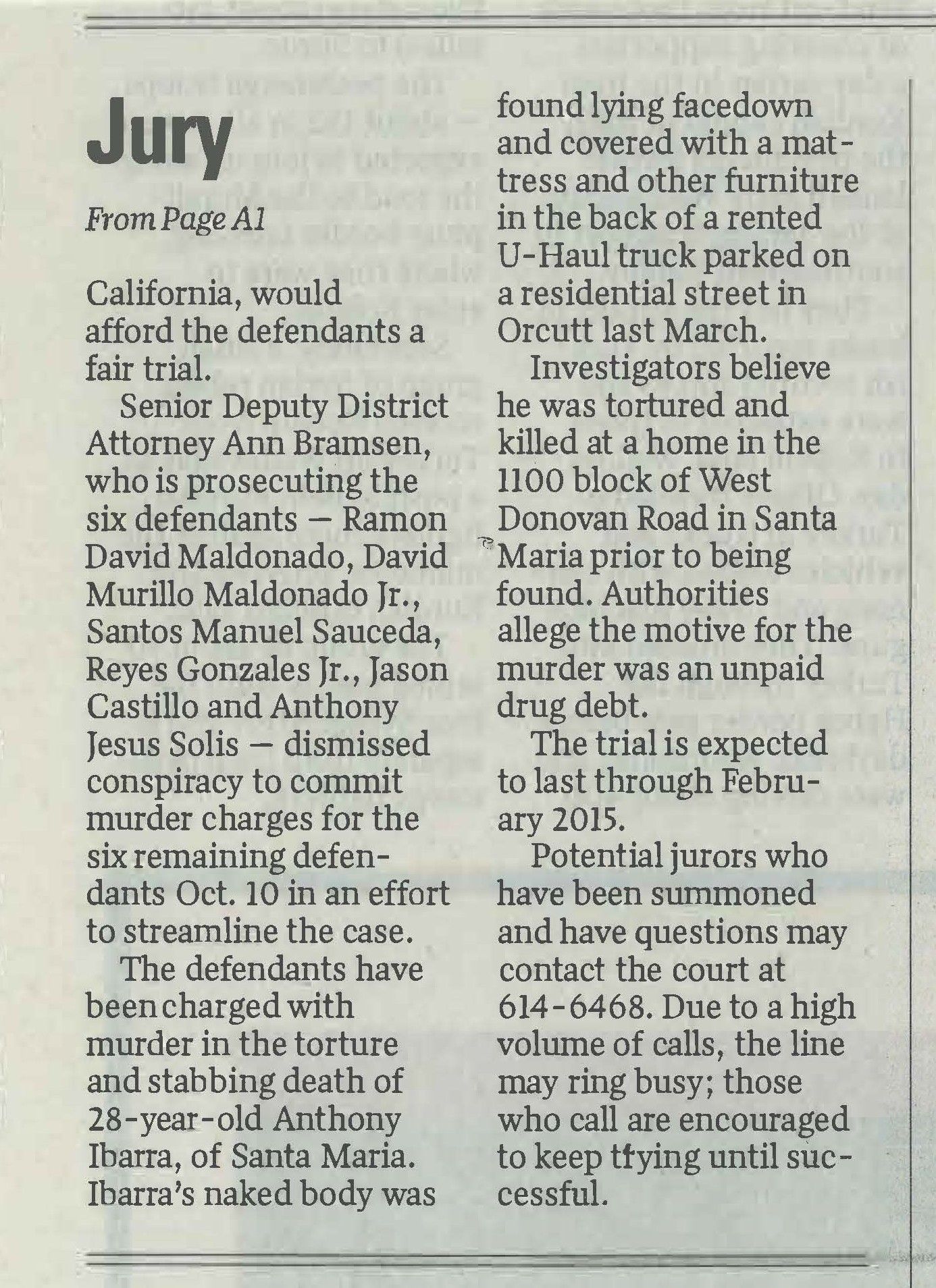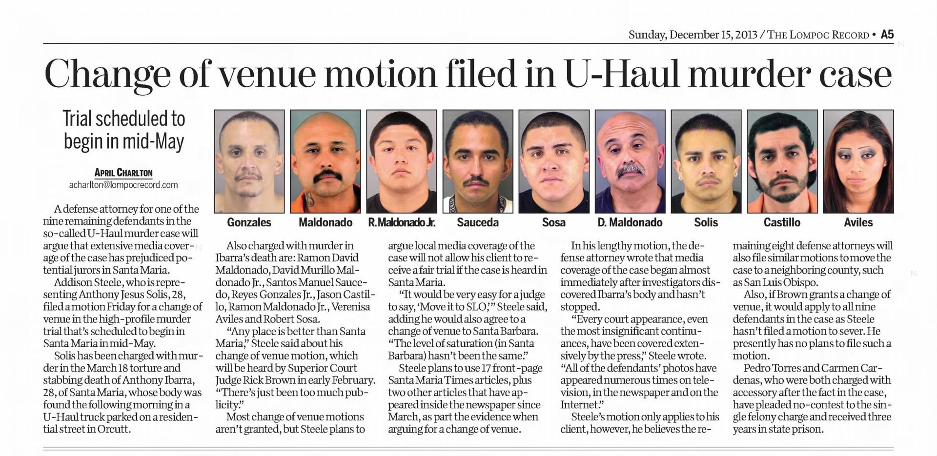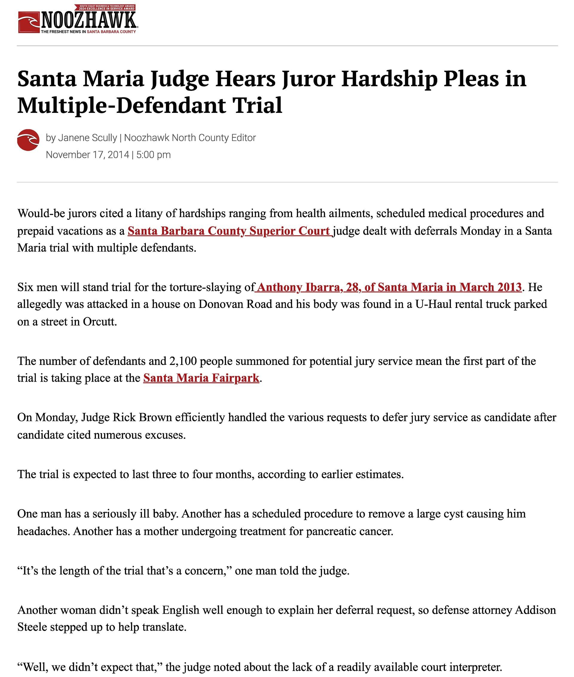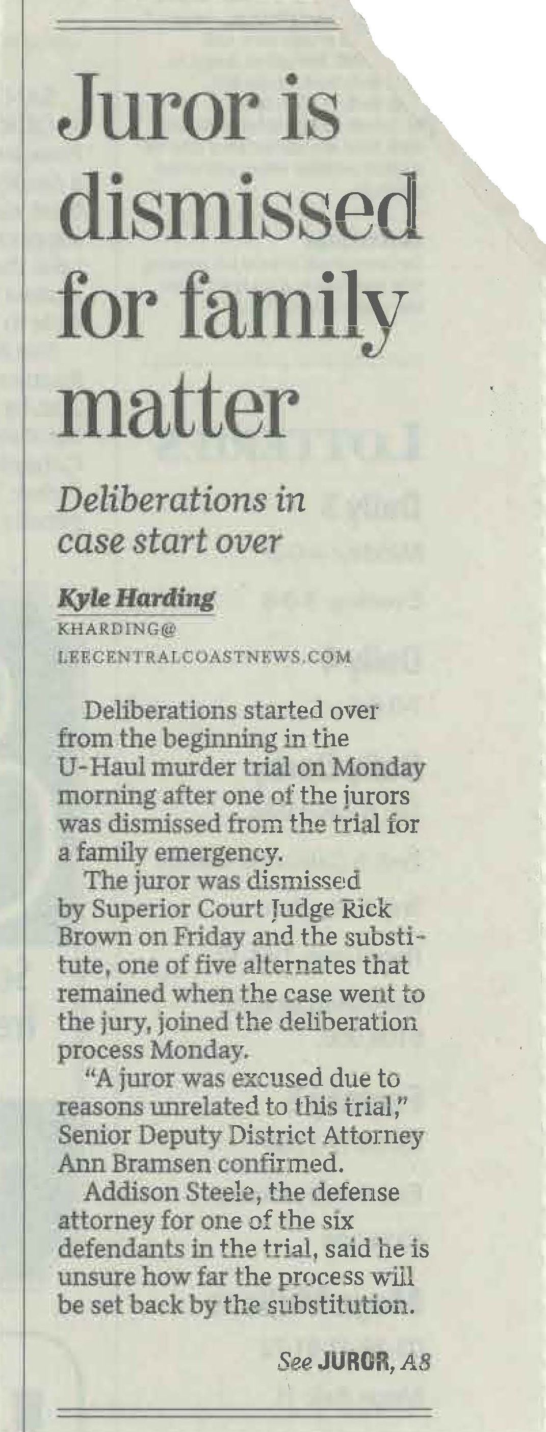 This was a particularly long and grueling murder trial. The press dubbed the case "The U-Haul Murder Trial" because the decedent's body was discovered in an abandoned U-Haul truck with his blood dripping out of the back of the truck. There were originally 13 co-defendants, not all of which were charged with murder. The plea negotiations parred it down to six co-defendants, all charged with murder, all with special circumstances that included torture and gang murder. All six defendants were facing LWOPP sentences. It was largest number of co-defendants in a murder trial ever in Santa Barbara County, and probably the state. There wasn't a courtroom in the county large enough for the trial. The largest courtroom in the county is at the Juvenile Court in Santa Maria, however it didn't have a jury box because juveniles do not have a right to a jury trial. The courtroom was modified by having a jury box built in it. However, even that was far too small for jury selection because of the several hundreds of prospective jurors would need to be called.