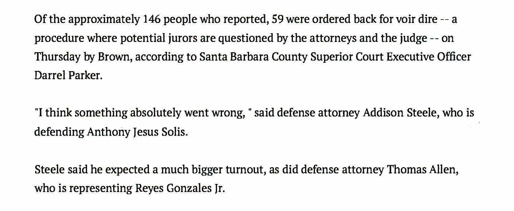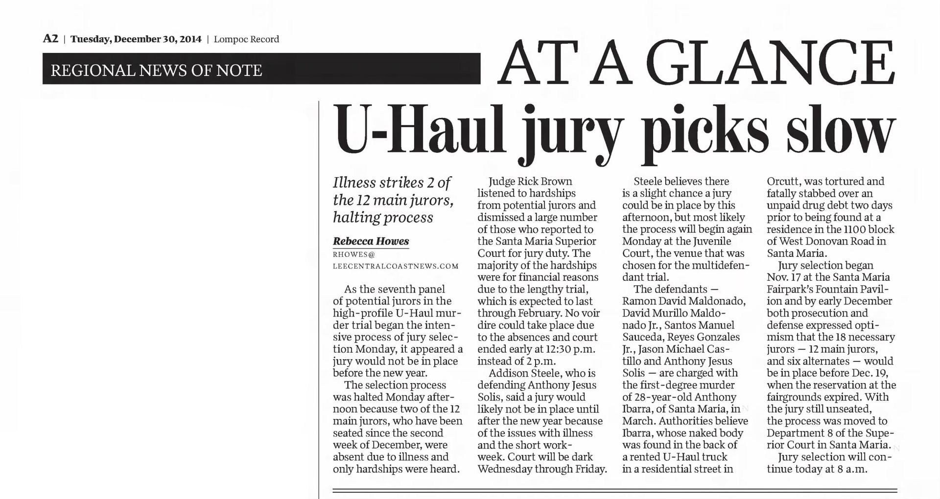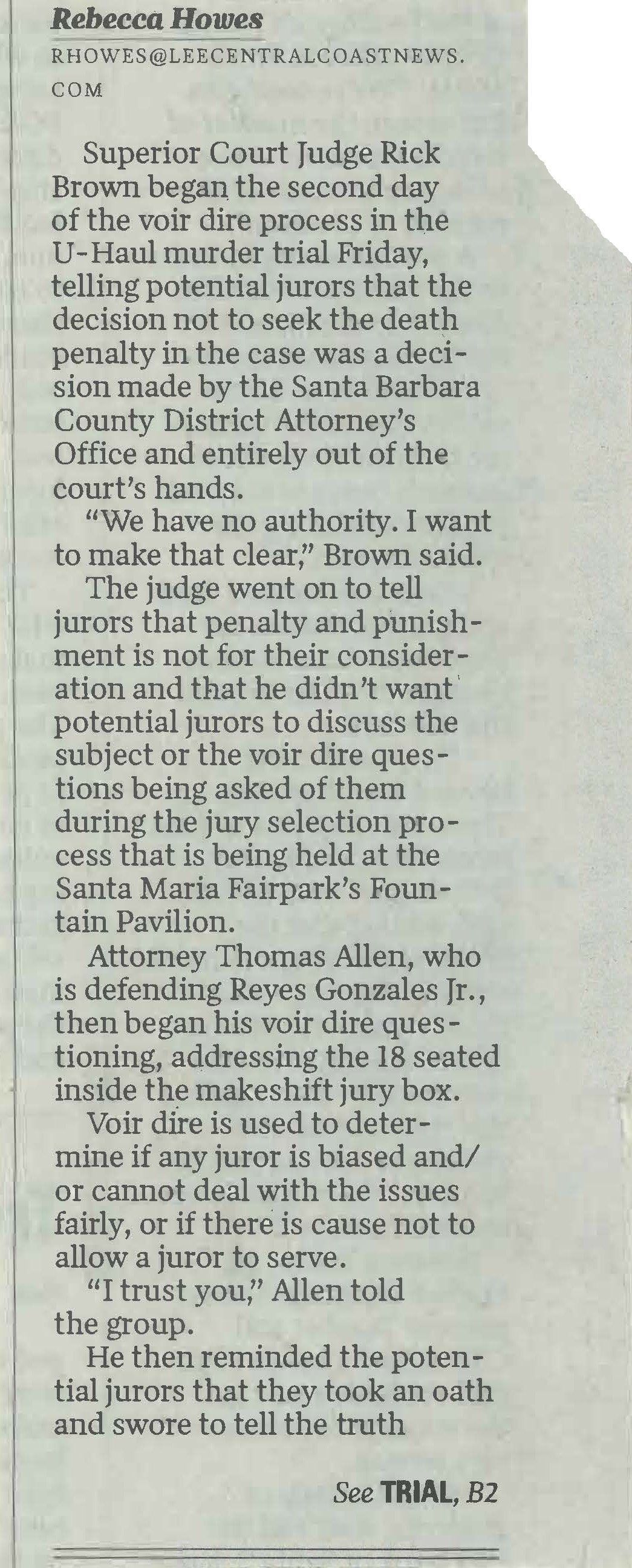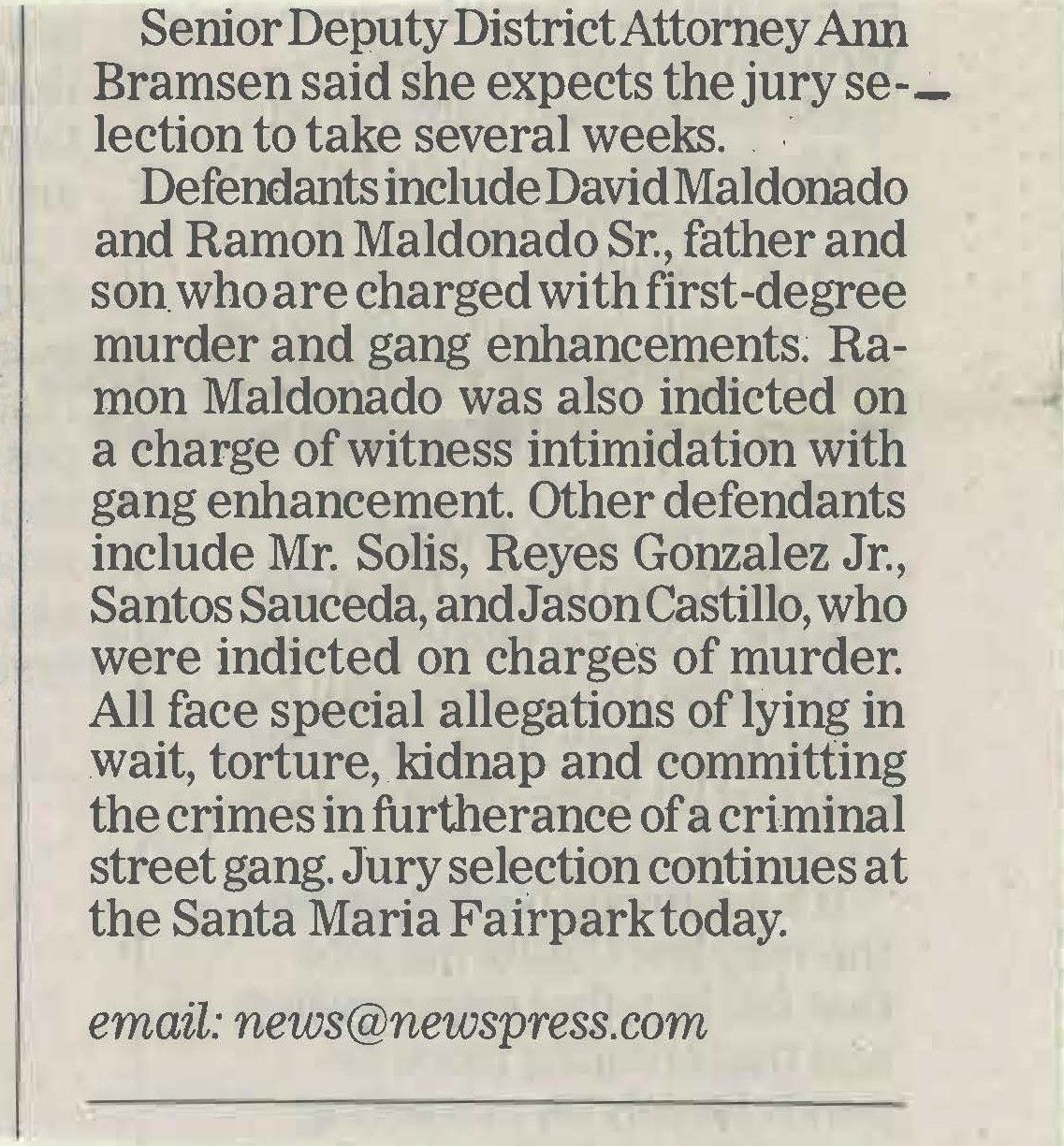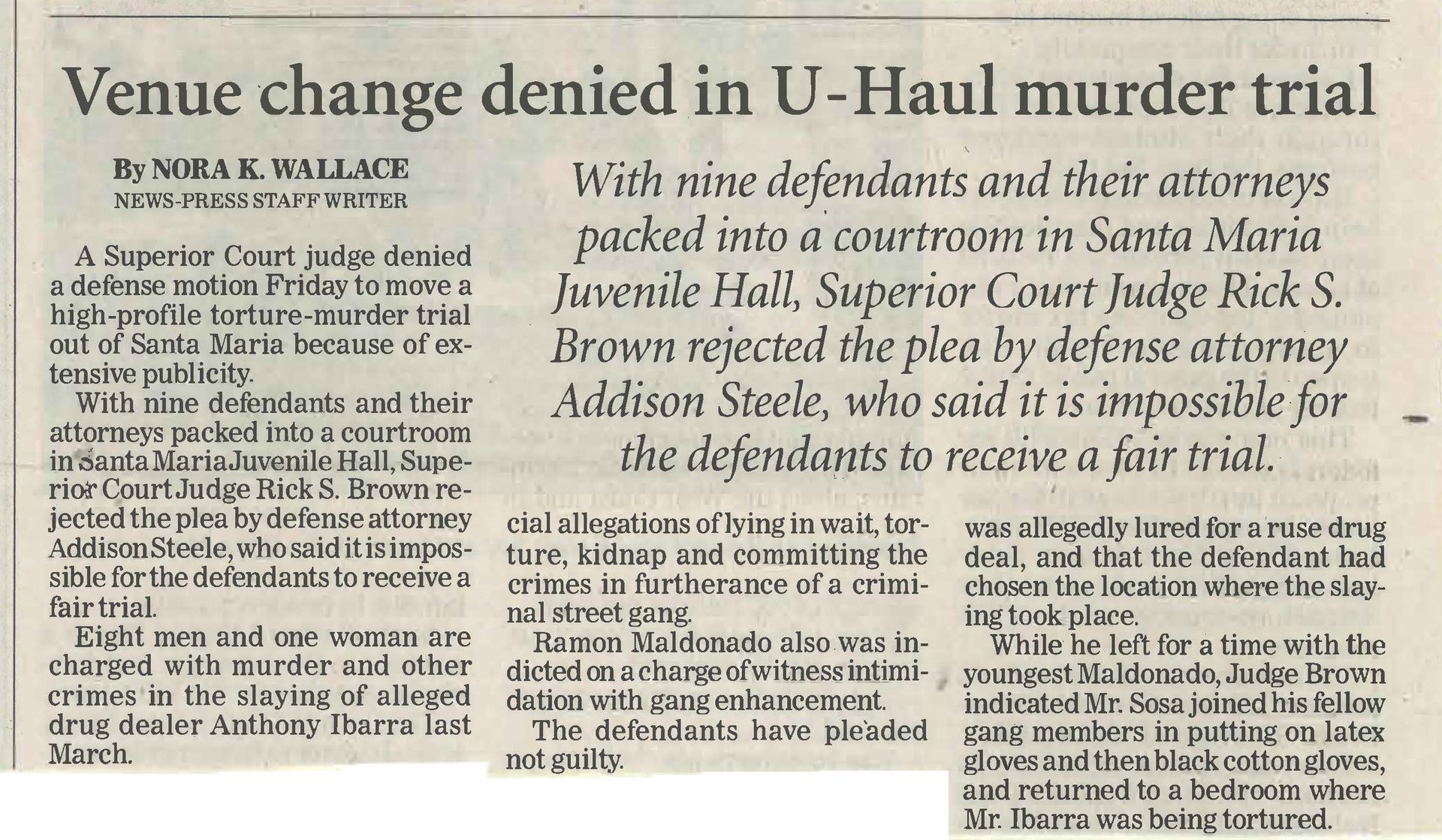 This was a particularly long and grueling murder trial. The press dubbed the case "The U-Haul Murder Trial" because the decedent's body was discovered in an abandoned U-Haul truck with his blood dripping out of the back of the truck. There were originally 13 co-defendants, not all of which were charged with murder. The plea negotiations parred it down to six co-defendants, all charged with murder, all with special circumstances that included torture and gang murder. All six defendants were facing LWOPP sentences. It was largest number of co-defendants in a murder trial ever in Santa Barbara County, and probably the state. There wasn't a courtroom in the county large enough for the trial. The largest courtroom in the county is at the Juvenile Court in Santa Maria, however it didn't have a jury box because juveniles do not have a right to a jury trial. The courtroom was modified by having a jury box built in it. However, even that was far too small for jury selection because of the several hundreds of prospective jurors would need to be called.