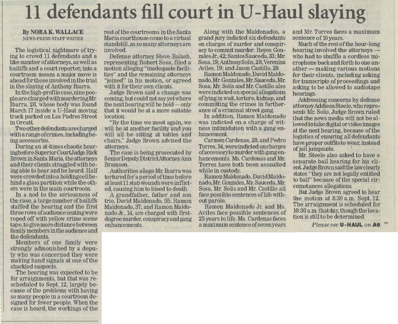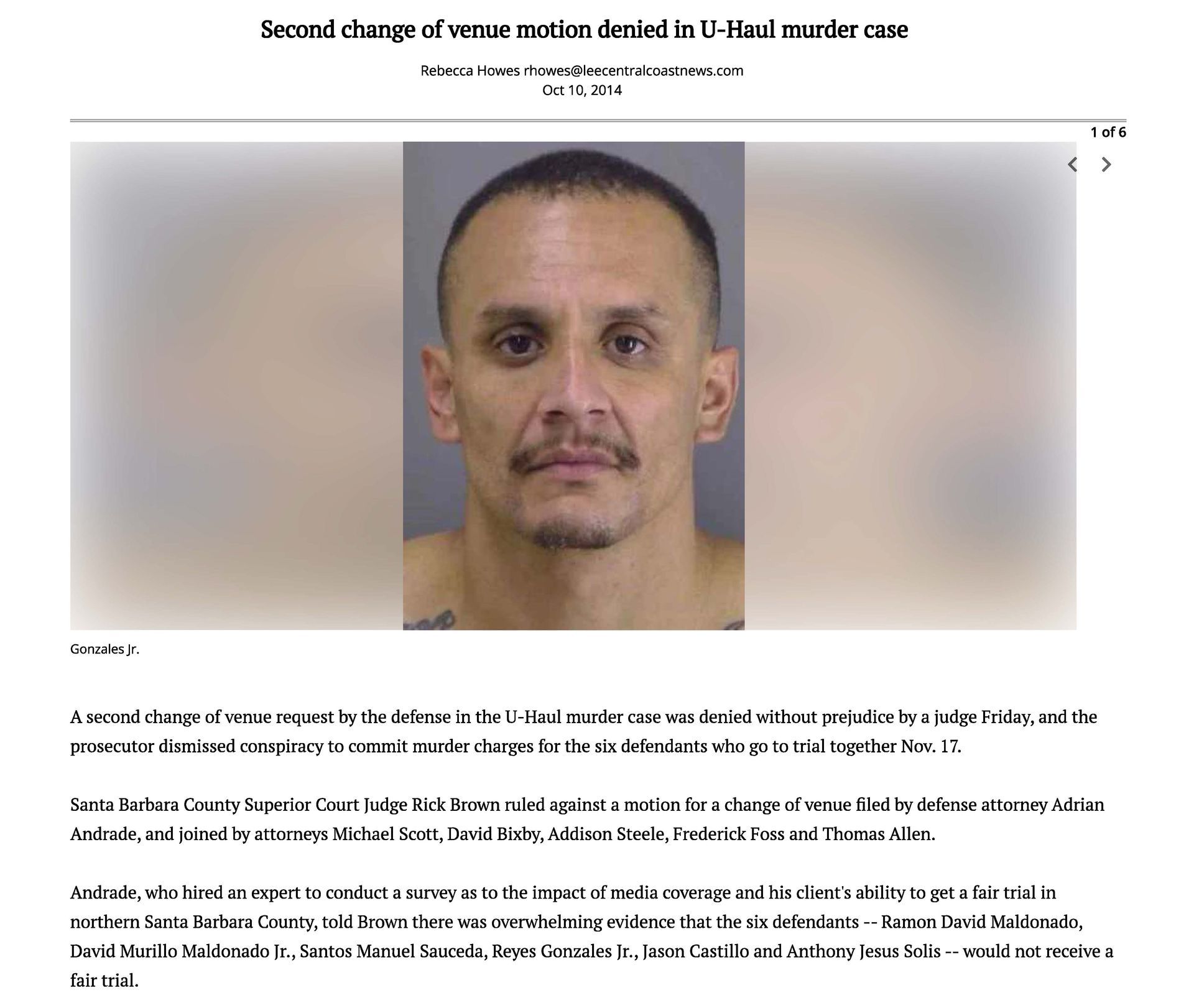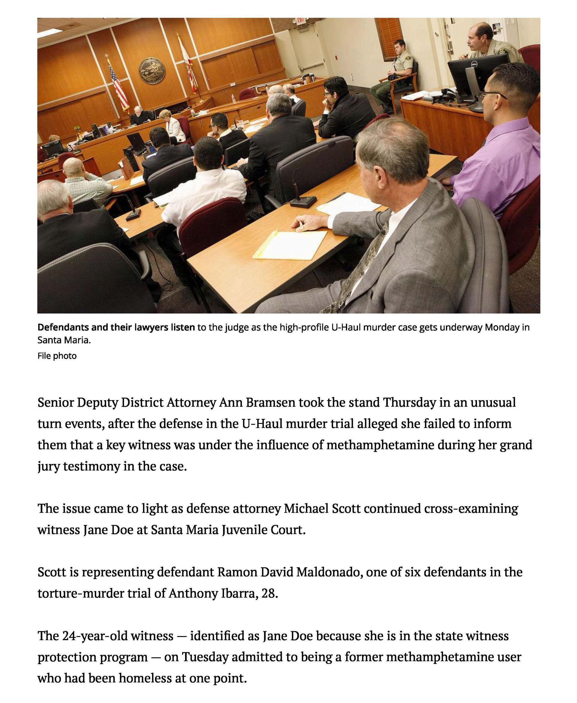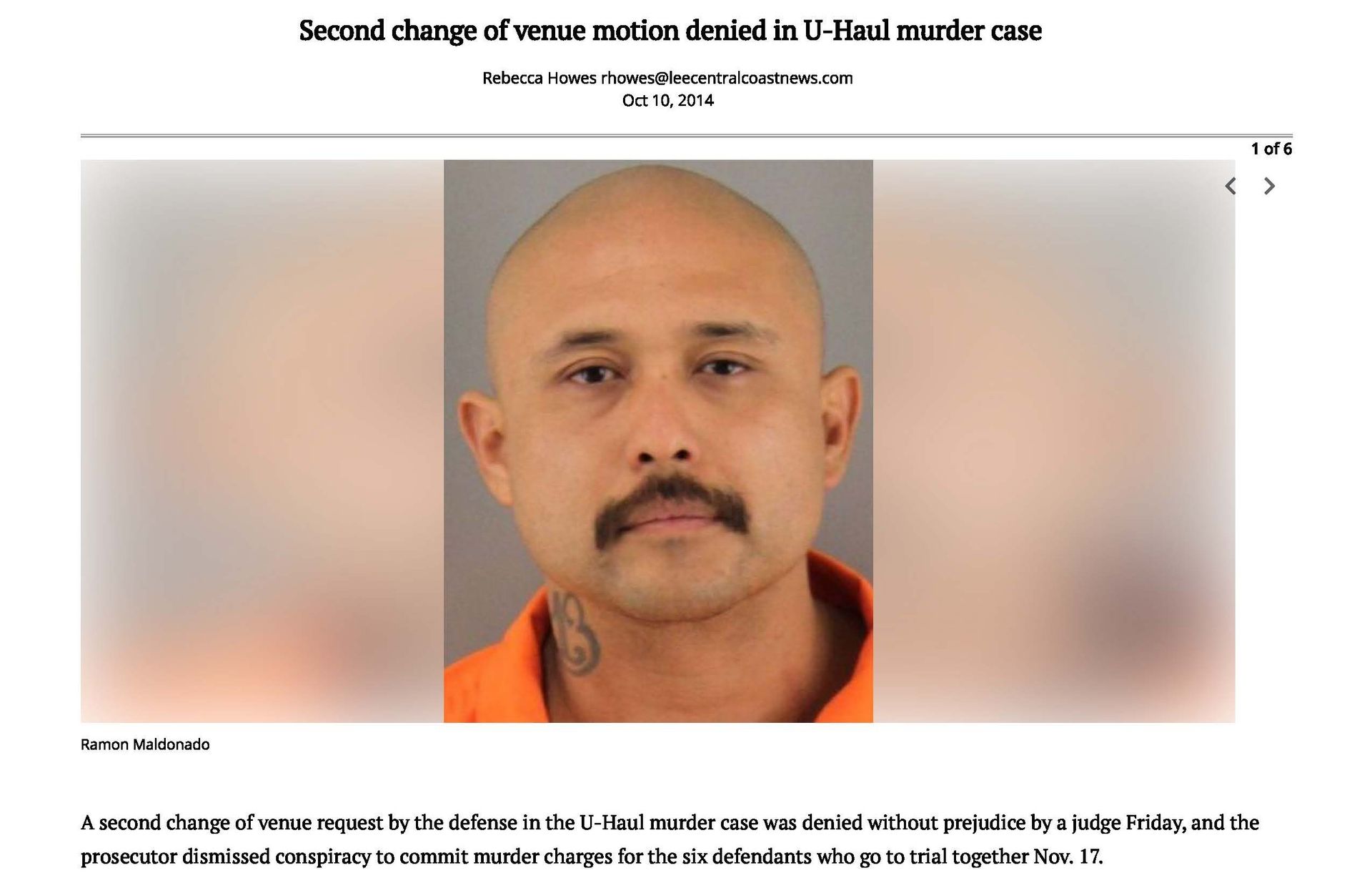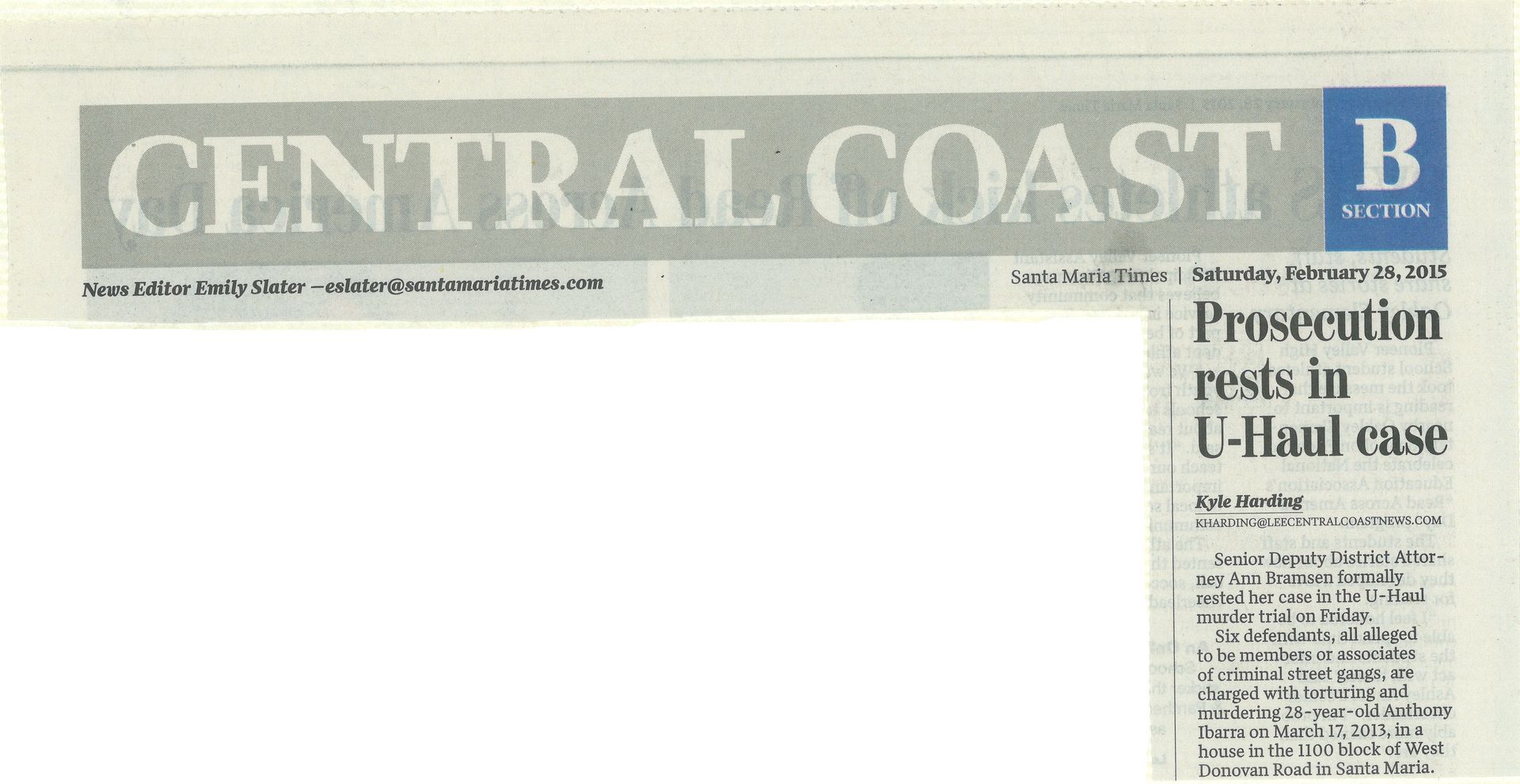This was a particularly long and grueling murder trial. The press dubbed the case "The U-Haul Murder Trial" because the decedent's body was discovered in an abandoned U-Haul truck with his blood dripping out of the back of the truck. There were originally 13 co-defendants, not all of which were charged with murder. The plea negotiations parred it down to six co-defendants, all charged with murder, all with special circumstances that included torture and gang murder. All six defendants were facing LWOPP sentences. It was largest number of co-defendants in a murder trial ever in Santa Barbara County, and probably the state. There wasn't a courtroom in the county large enough for the trial. The largest courtroom in the county is at the Juvenile Court in Santa Maria, however it didn't have a jury box because juveniles do not have a right to a jury trial. The courtroom was modified by having a jury box built in it. However, even that was far too small for jury selection because of the several hundreds of prospective jurors would need to be called.