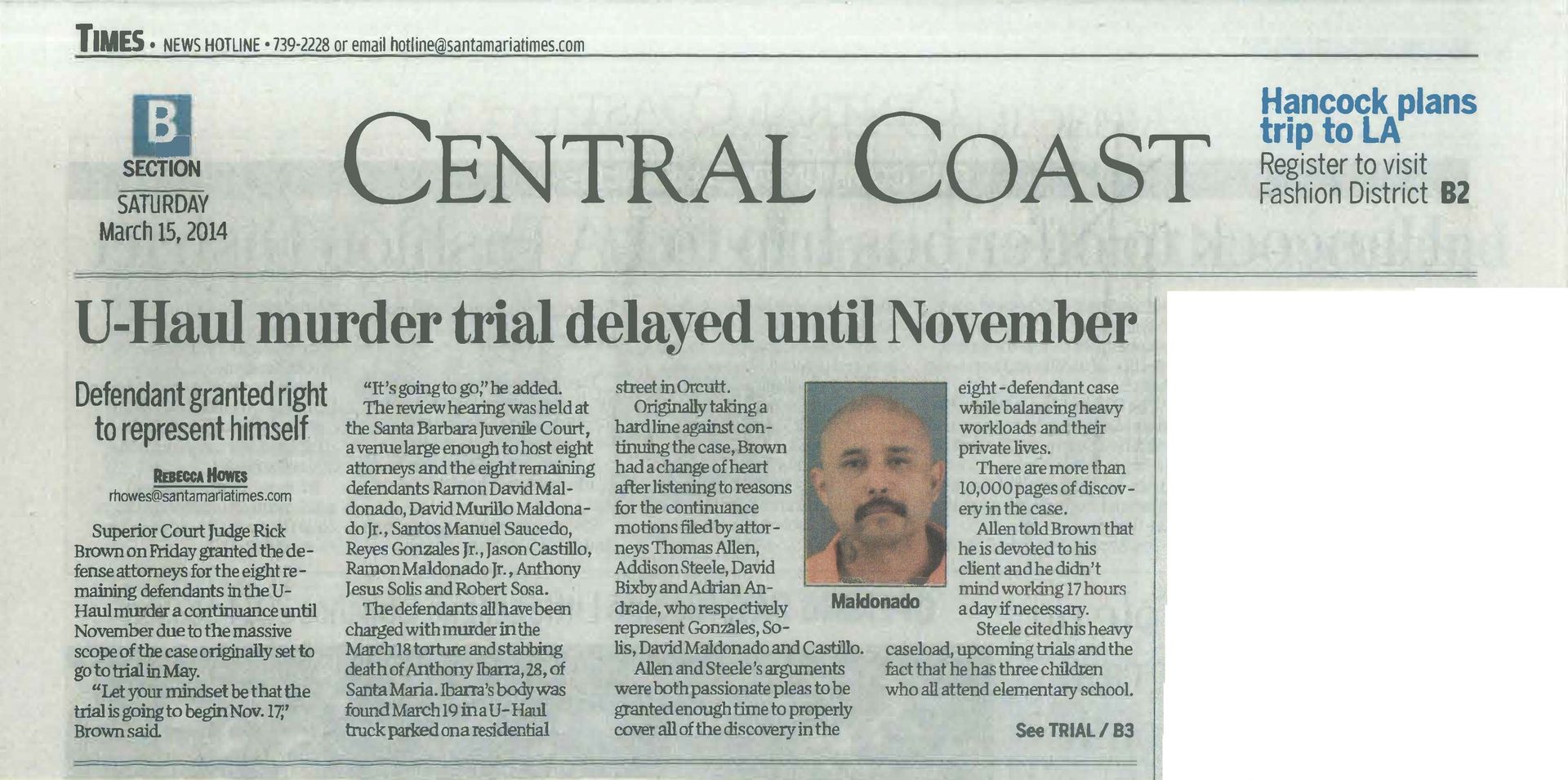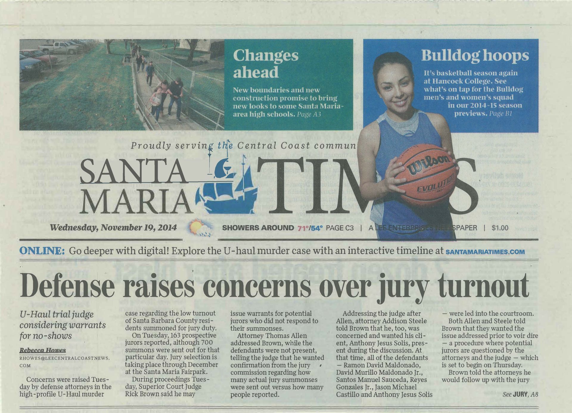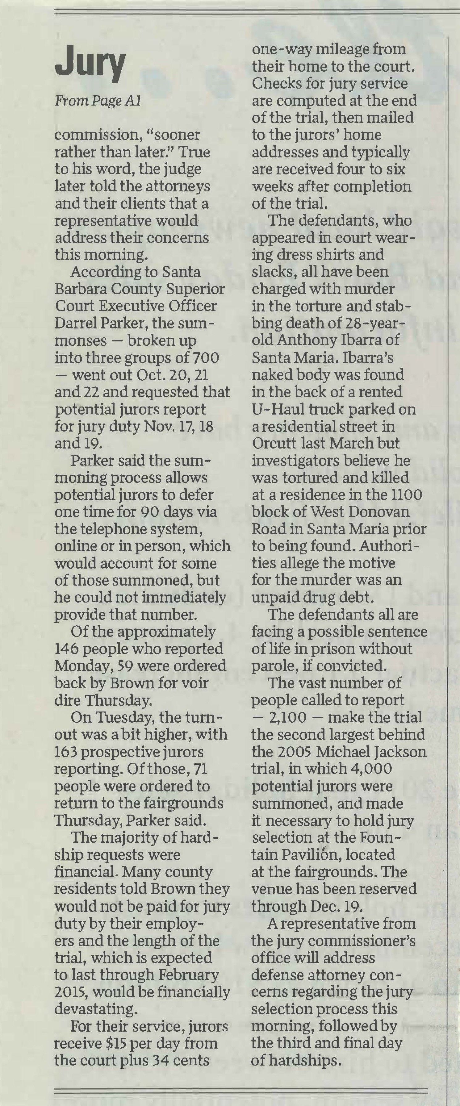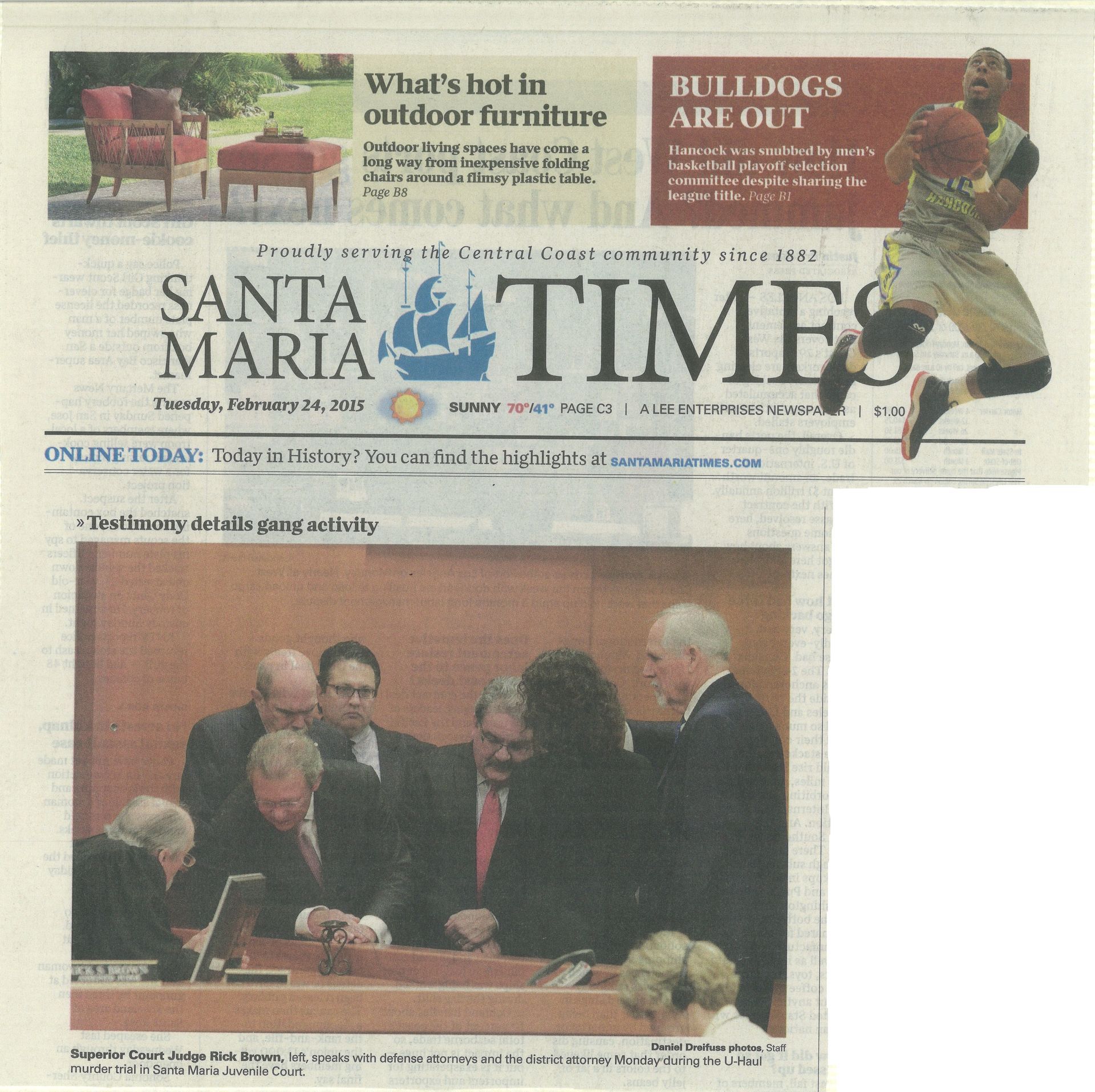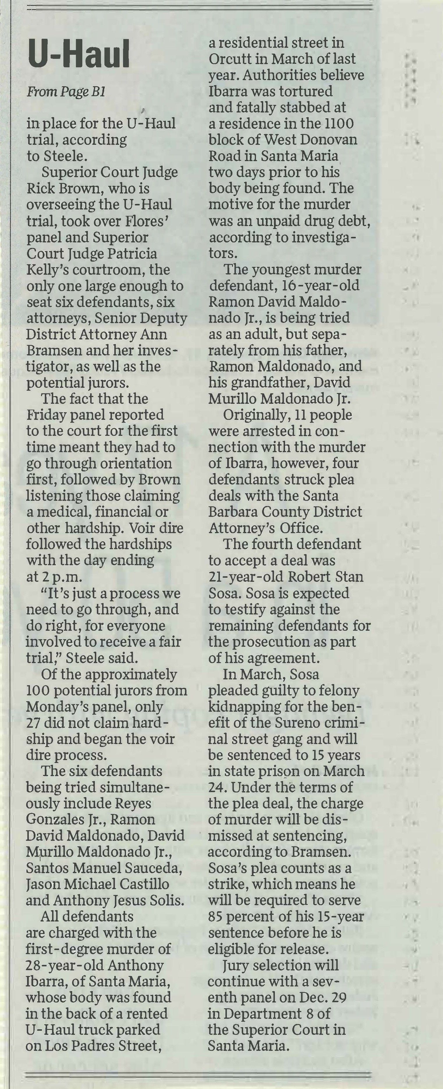 This was a particularly long and grueling murder trial. The press dubbed the case "The U-Haul Murder Trial" because the decedent's body was discovered in an abandoned U-Haul truck with his blood dripping out of the back of the truck. There were originally 13 co-defendants, not all of which were charged with murder. The plea negotiations parred it down to six co-defendants, all charged with murder, all with special circumstances that included torture and gang murder. All six defendants were facing LWOPP sentences. It was largest number of co-defendants in a murder trial ever in Santa Barbara County, and probably the state. There wasn't a courtroom in the county large enough for the trial. The largest courtroom in the county is at the Juvenile Court in Santa Maria, however it didn't have a jury box because juveniles do not have a right to a jury trial. The courtroom was modified by having a jury box built in it. However, even that was far too small for jury selection because of the several hundreds of prospective jurors would need to be called.