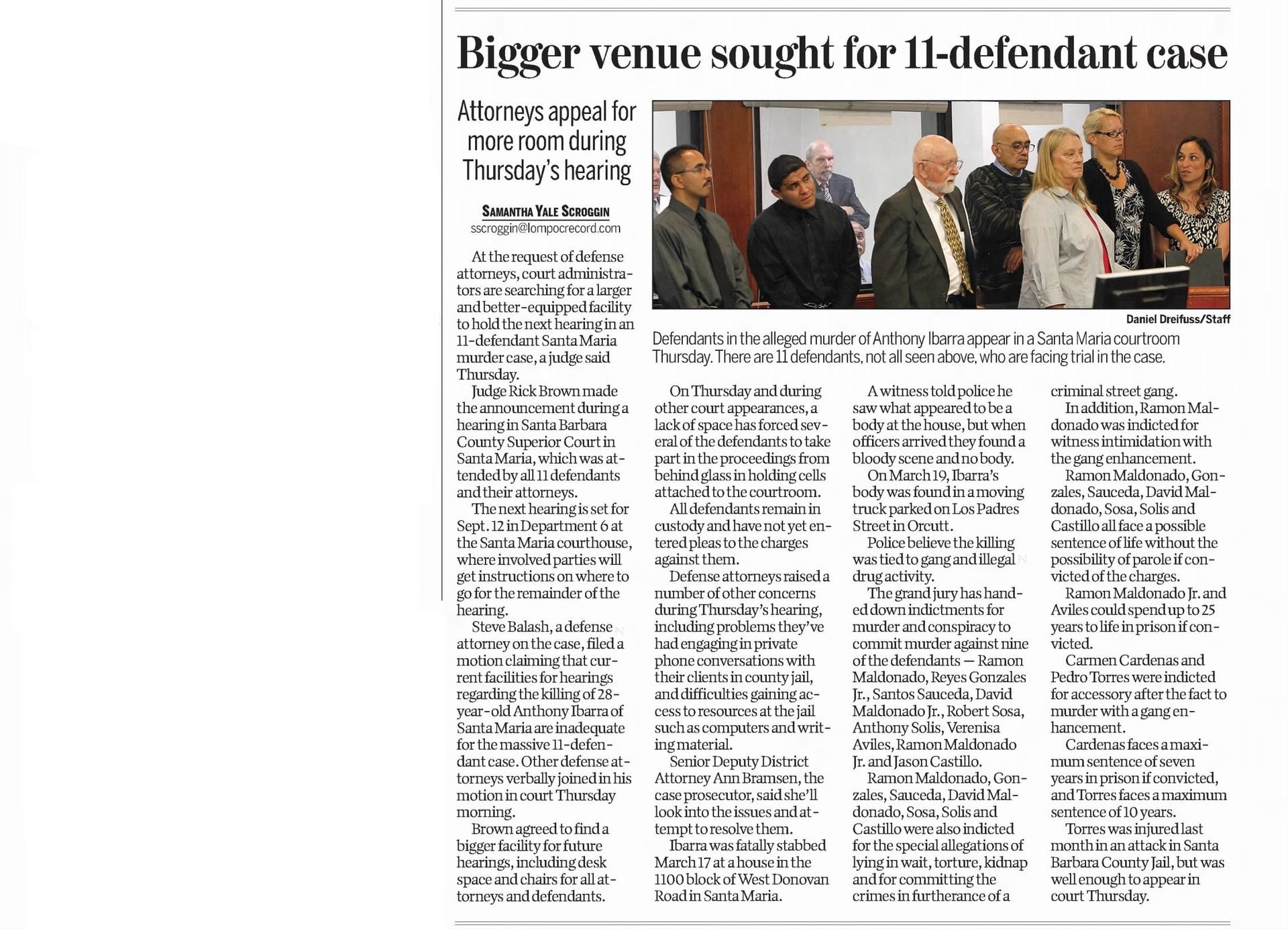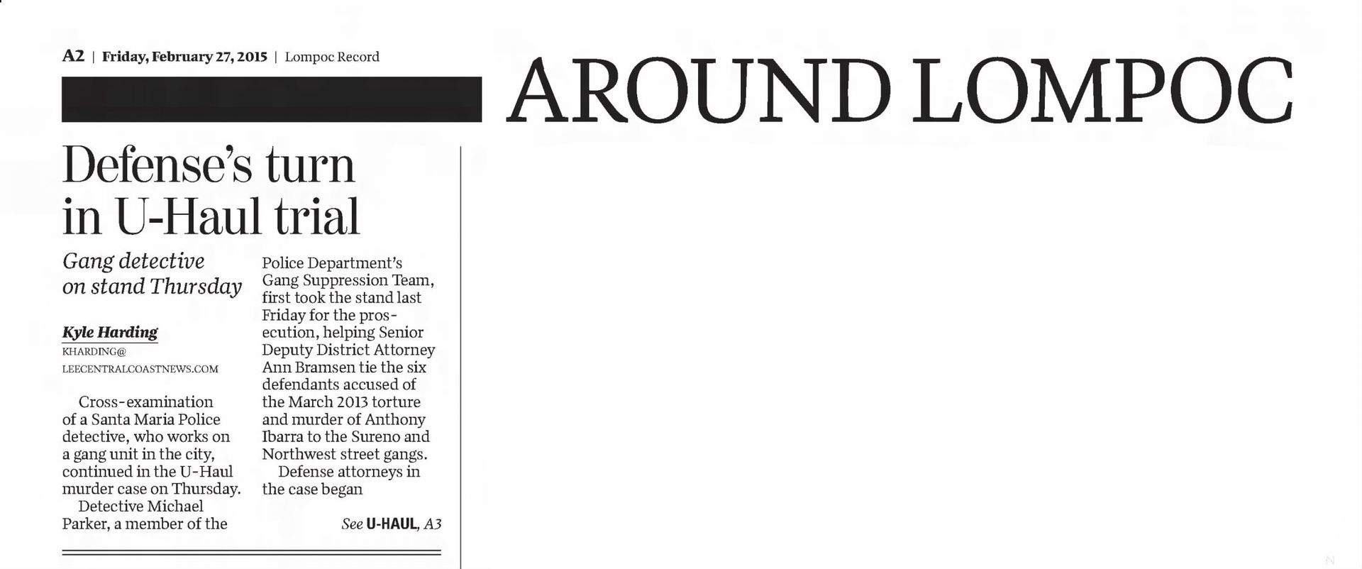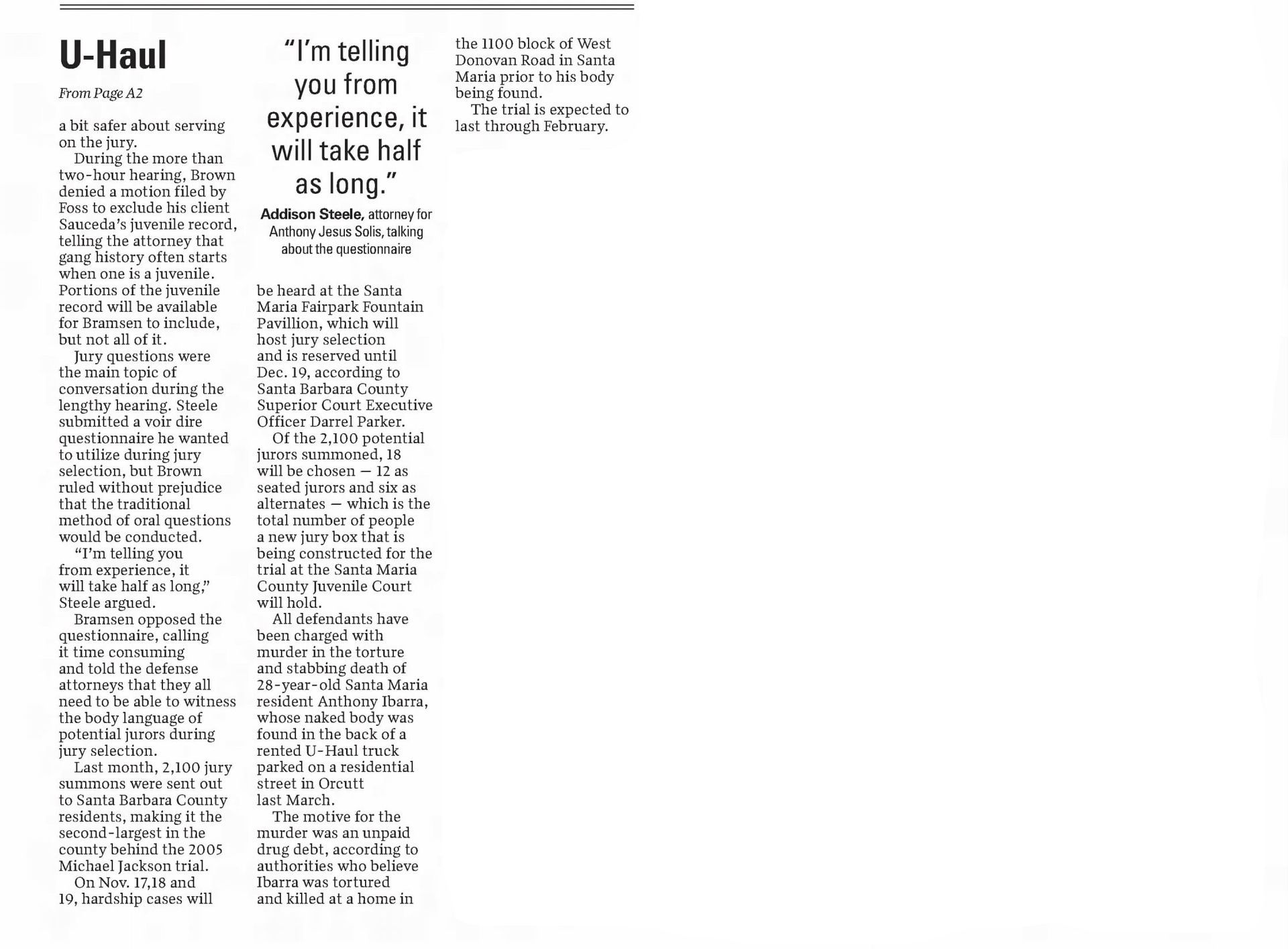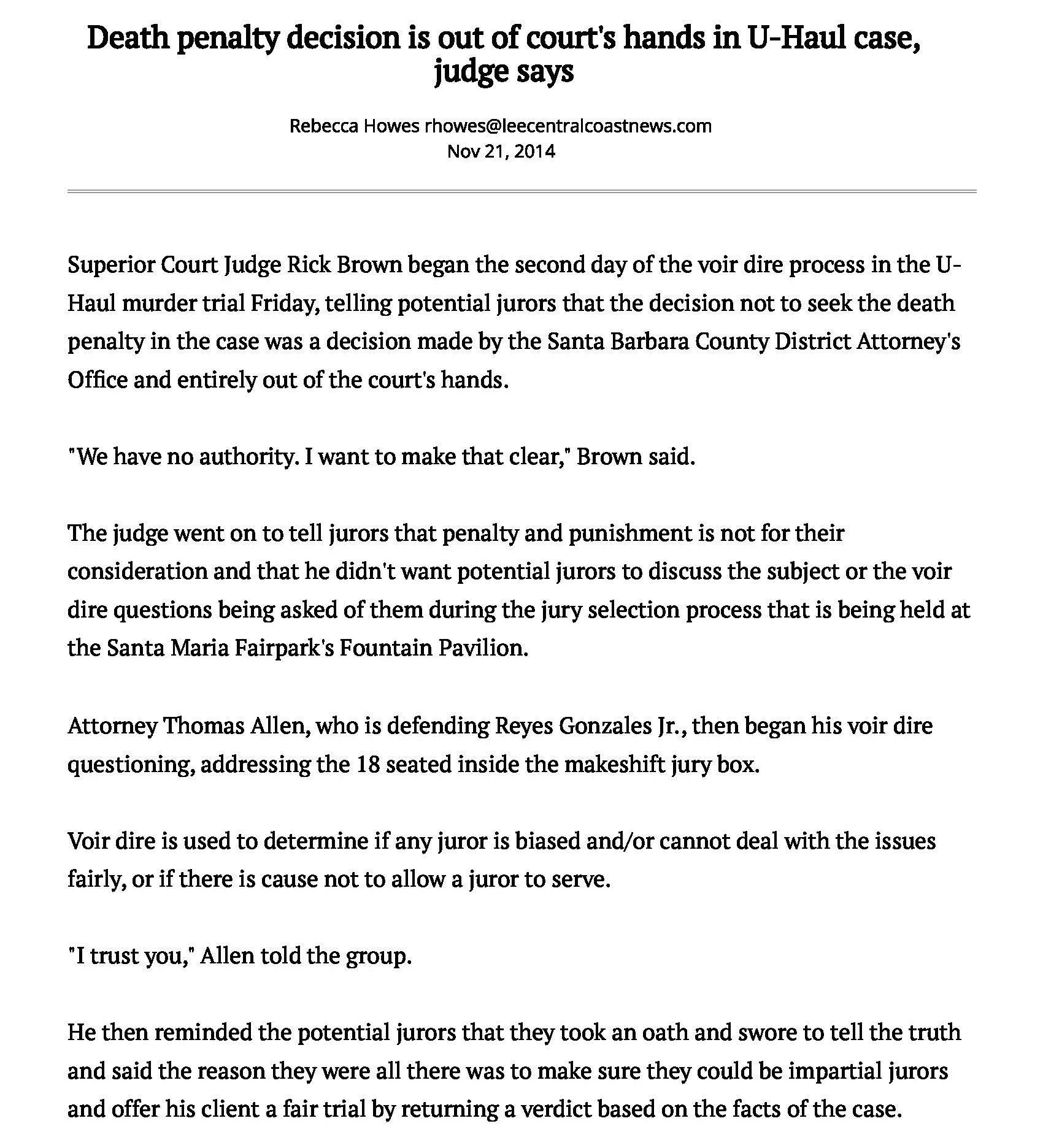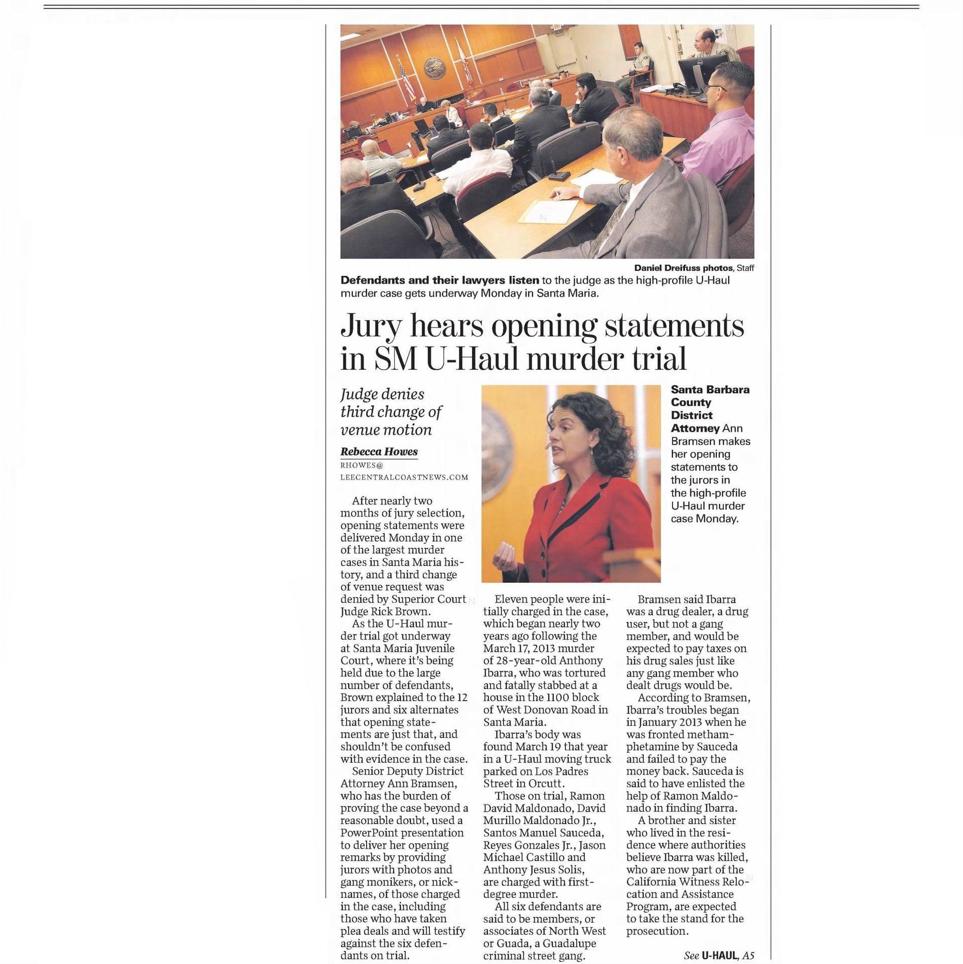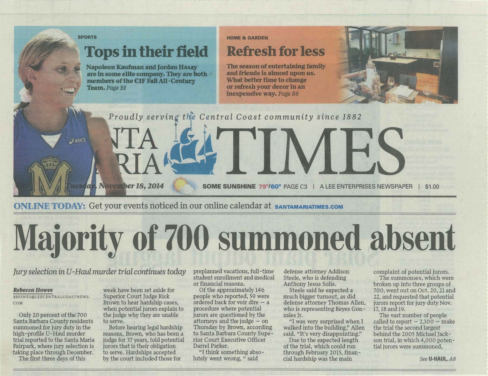This was a particularly long and grueling murder trial. The press dubbed the case "The U-Haul Murder Trial" because the decedent's body was discovered in an abandoned U-Haul truck with his blood dripping out of the back of the truck. There were originally 13 co-defendants, not all of which were charged with murder. The plea negotiations parred it down to six co-defendants, all charged with murder, all with special circumstances that included torture and gang murder. All six defendants were facing LWOPP sentences. It was largest number of co-defendants in a murder trial ever in Santa Barbara County, and probably the state. There wasn't a courtroom in the county large enough for the trial. The largest courtroom in the county is at the Juvenile Court in Santa Maria, however it didn't have a jury box because juveniles do not have a right to a jury trial. The courtroom was modified by having a jury box built in it. However, even that was far too small for jury selection because of the several hundreds of prospective jurors would need to be called.