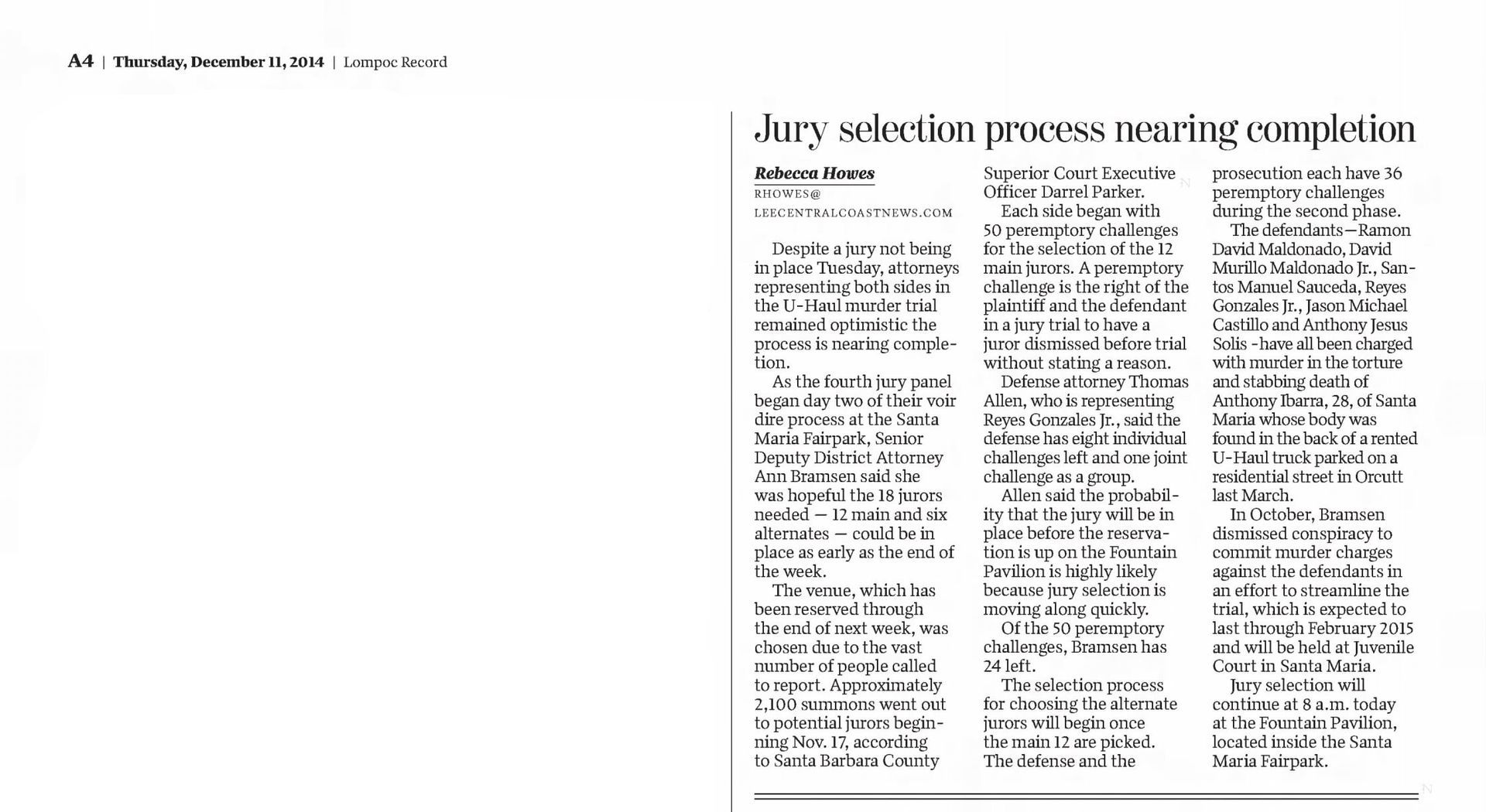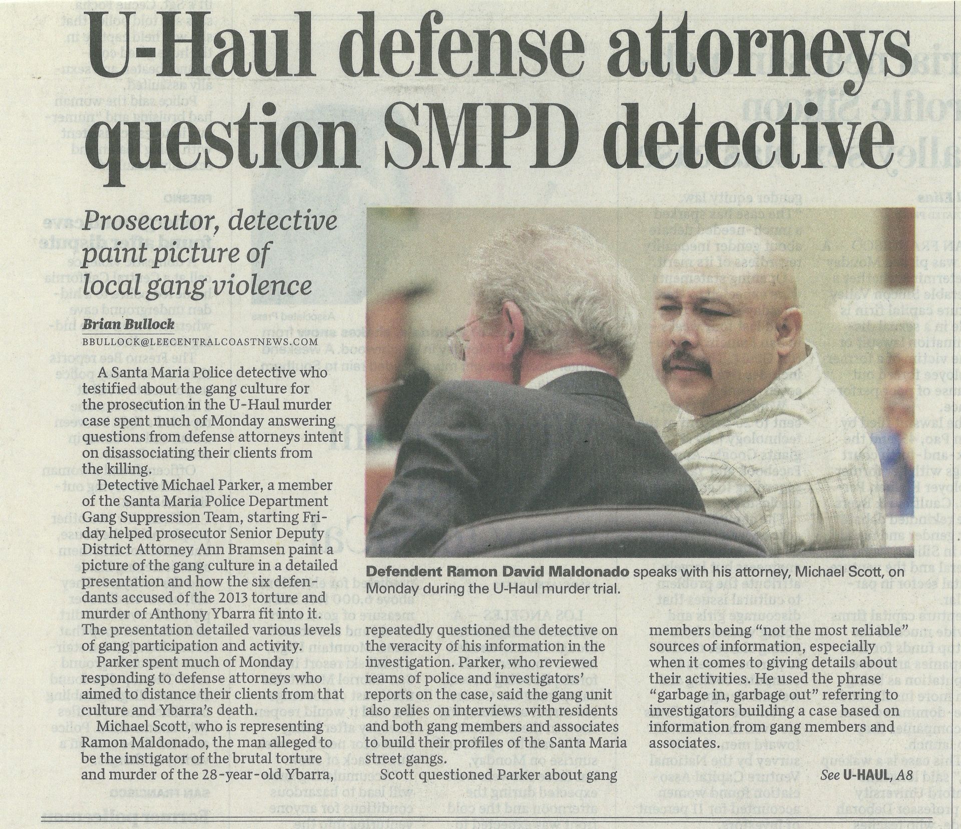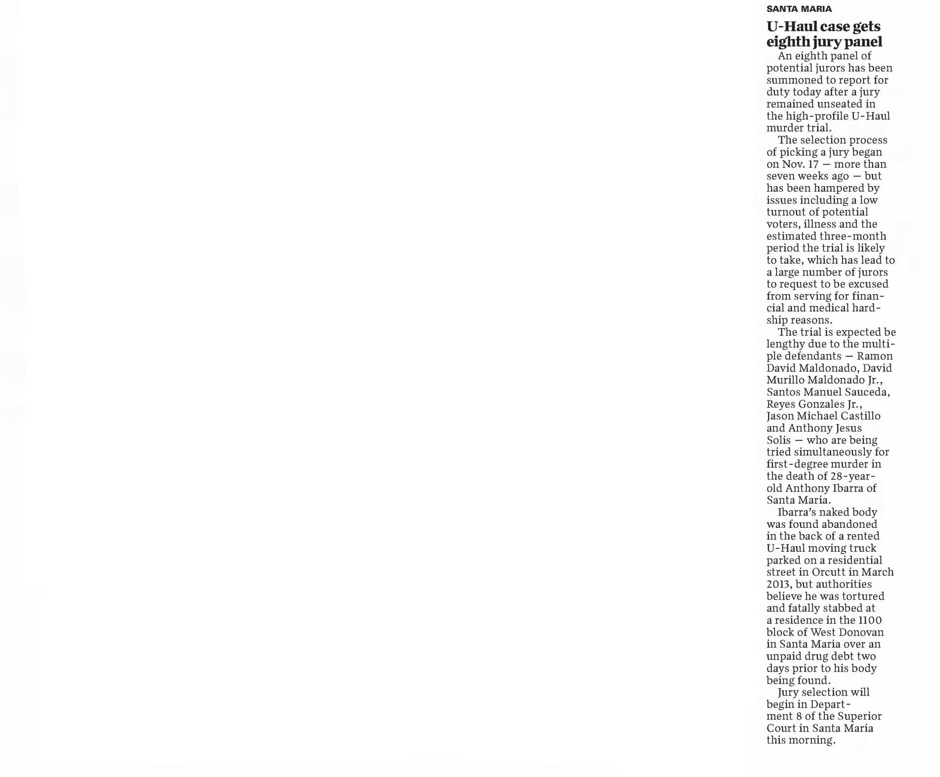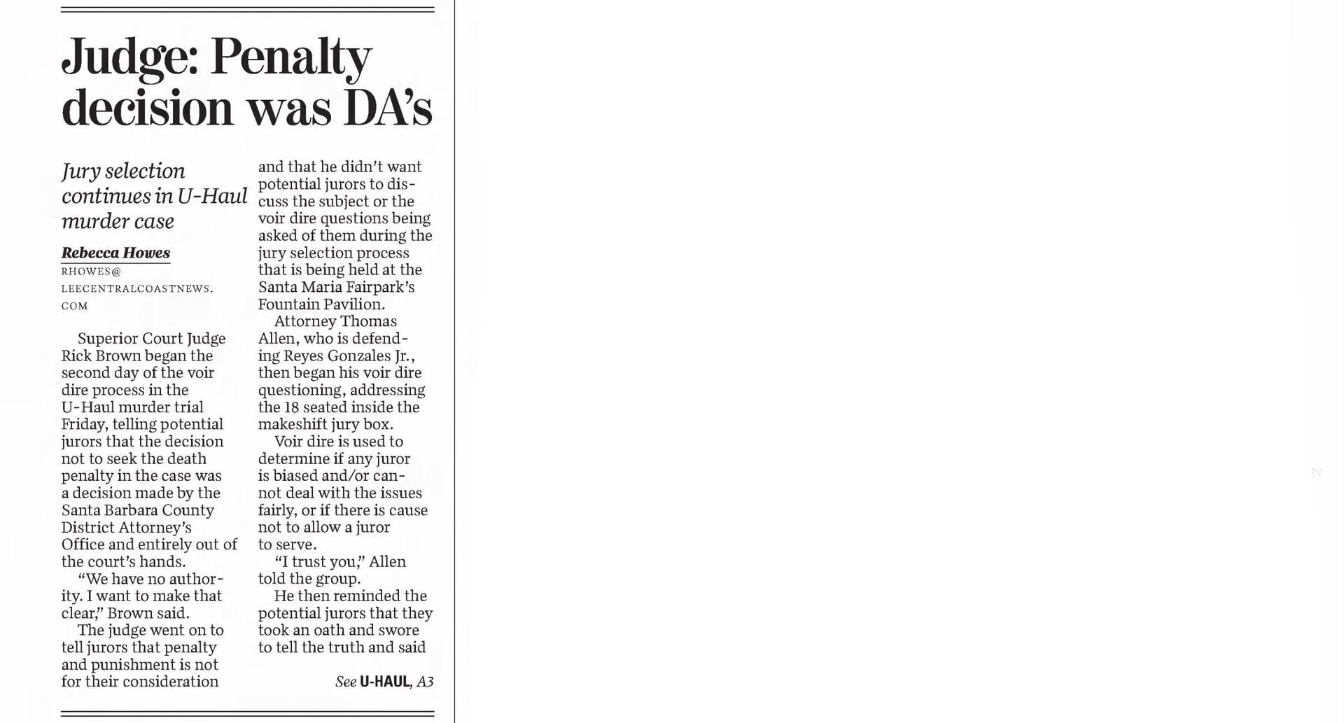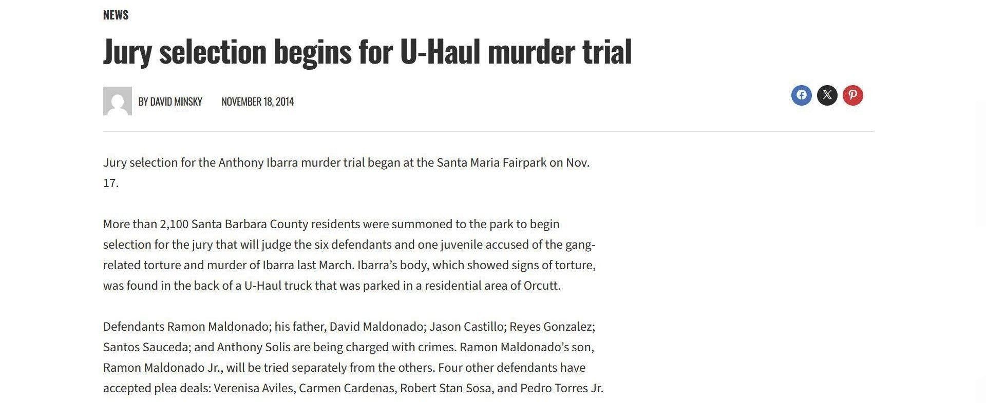 This was a particularly long and grueling murder trial. The press dubbed the case "The U-Haul Murder Trial" because the decedent's body was discovered in an abandoned U-Haul truck with his blood dripping out of the back of the truck. There were originally 13 co-defendants, not all of which were charged with murder. The plea negotiations parred it down to six co-defendants, all charged with murder, all with special circumstances that included torture and gang murder. All six defendants were facing LWOPP sentences. It was largest number of co-defendants in a murder trial ever in Santa Barbara County, and probably the state. There wasn't a courtroom in the county large enough for the trial. The largest courtroom in the county is at the Juvenile Court in Santa Maria, however it didn't have a jury box because juveniles do not have a right to a jury trial. The courtroom was modified by having a jury box built in it. However, even that was far too small for jury selection because of the several hundreds of prospective jurors would need to be called.