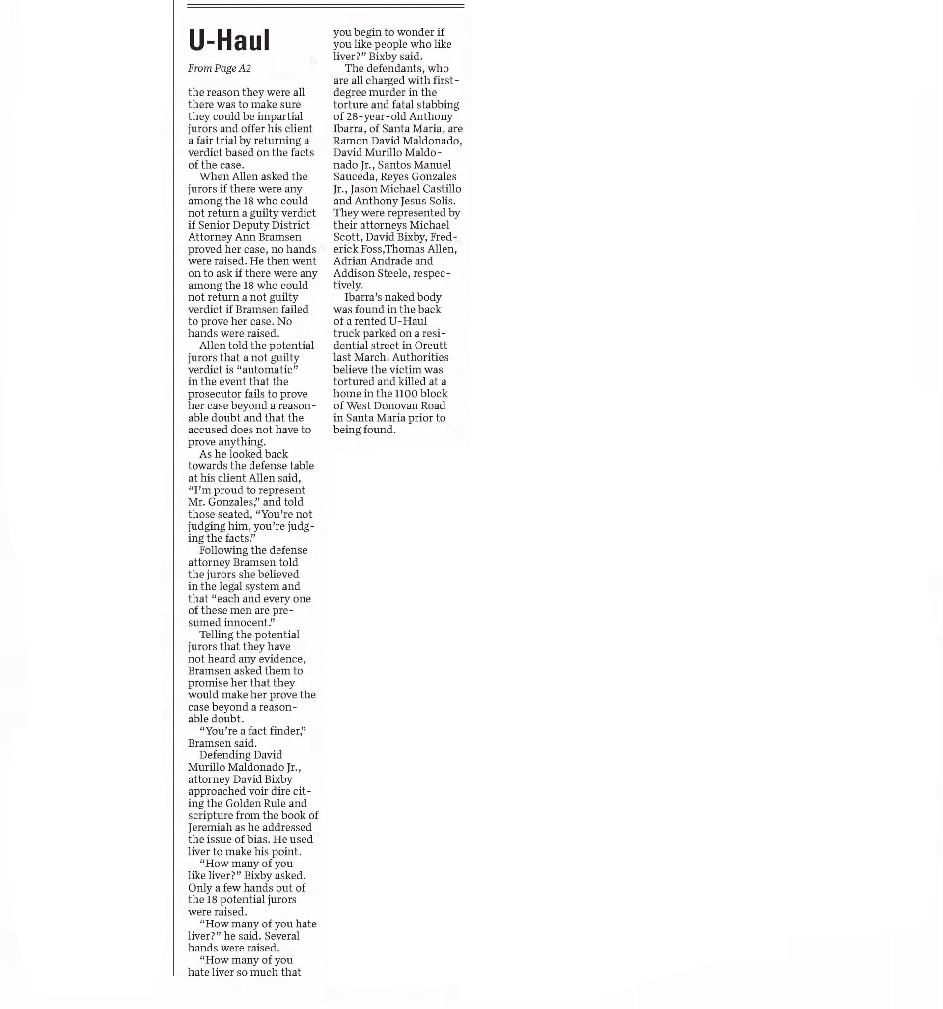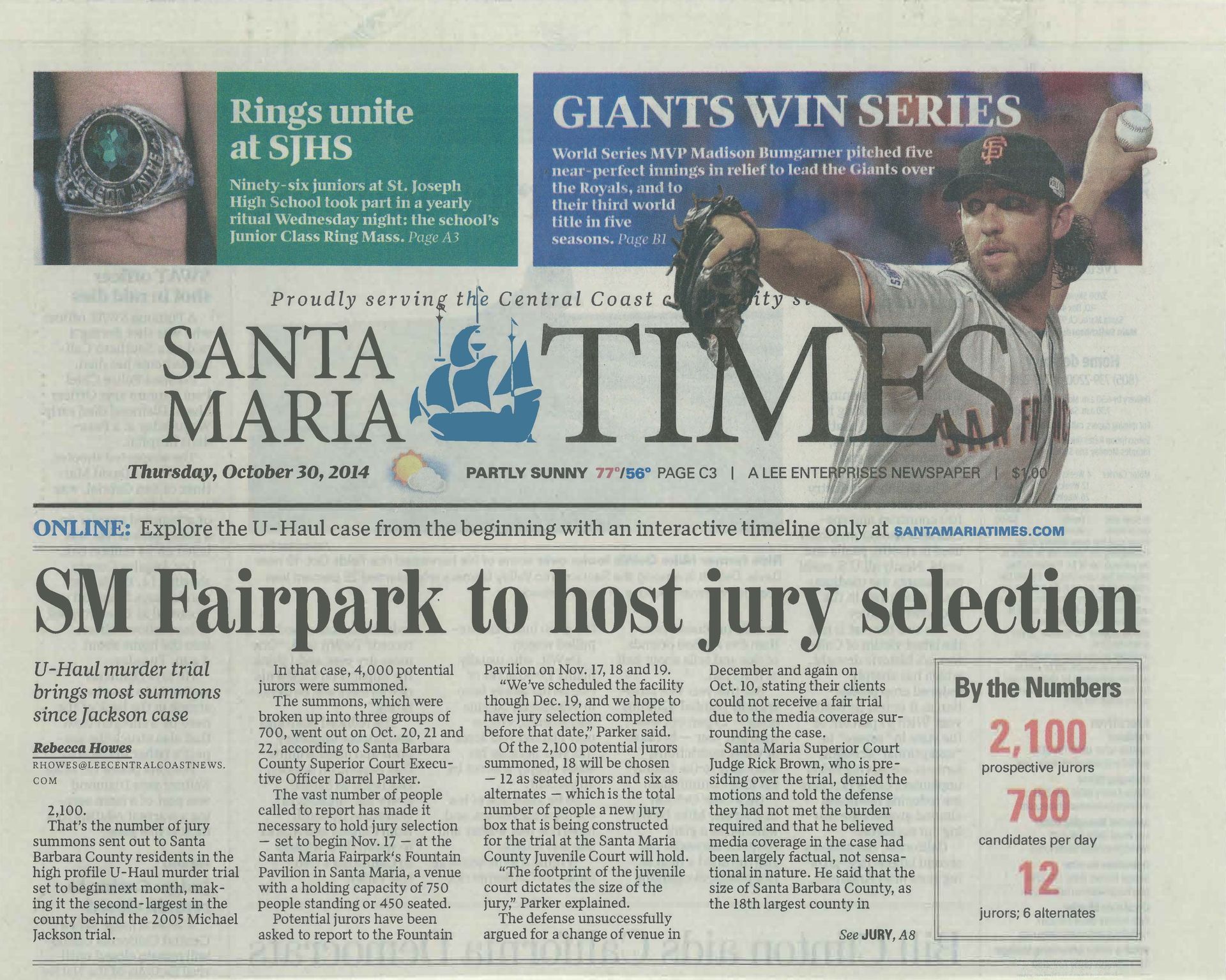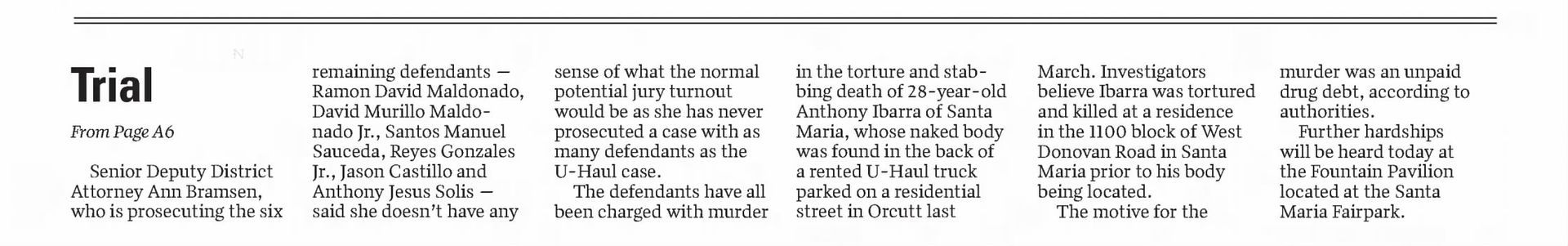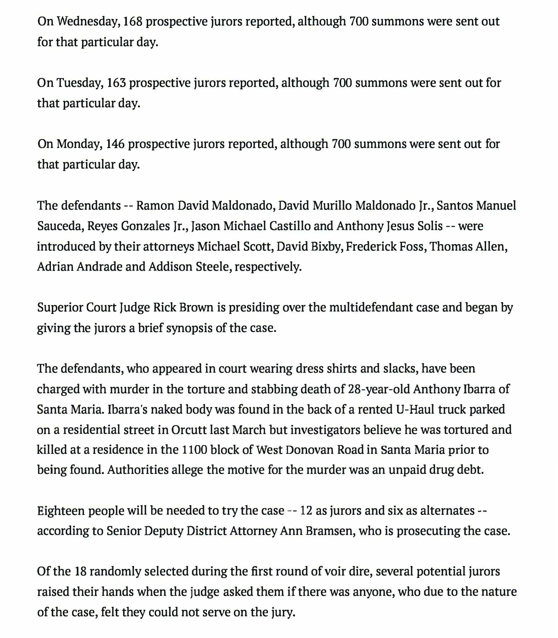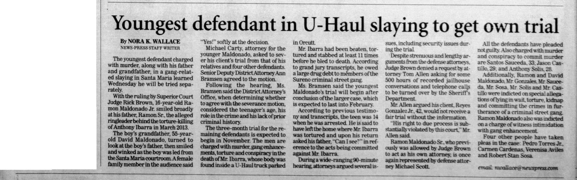 This was a particularly long and grueling murder trial. The press dubbed the case "The U-Haul Murder Trial" because the decedent's body was discovered in an abandoned U-Haul truck with his blood dripping out of the back of the truck. There were originally 13 co-defendants, not all of which were charged with murder. The plea negotiations parred it down to six co-defendants, all charged with murder, all with special circumstances that included torture and gang murder. All six defendants were facing LWOPP sentences. It was largest number of co-defendants in a murder trial ever in Santa Barbara County, and probably the state. There wasn't a courtroom in the county large enough for the trial. The largest courtroom in the county is at the Juvenile Court in Santa Maria, however it didn't have a jury box because juveniles do not have a right to a jury trial. The courtroom was modified by having a jury box built in it. However, even that was far too small for jury selection because of the several hundreds of prospective jurors would need to be called.