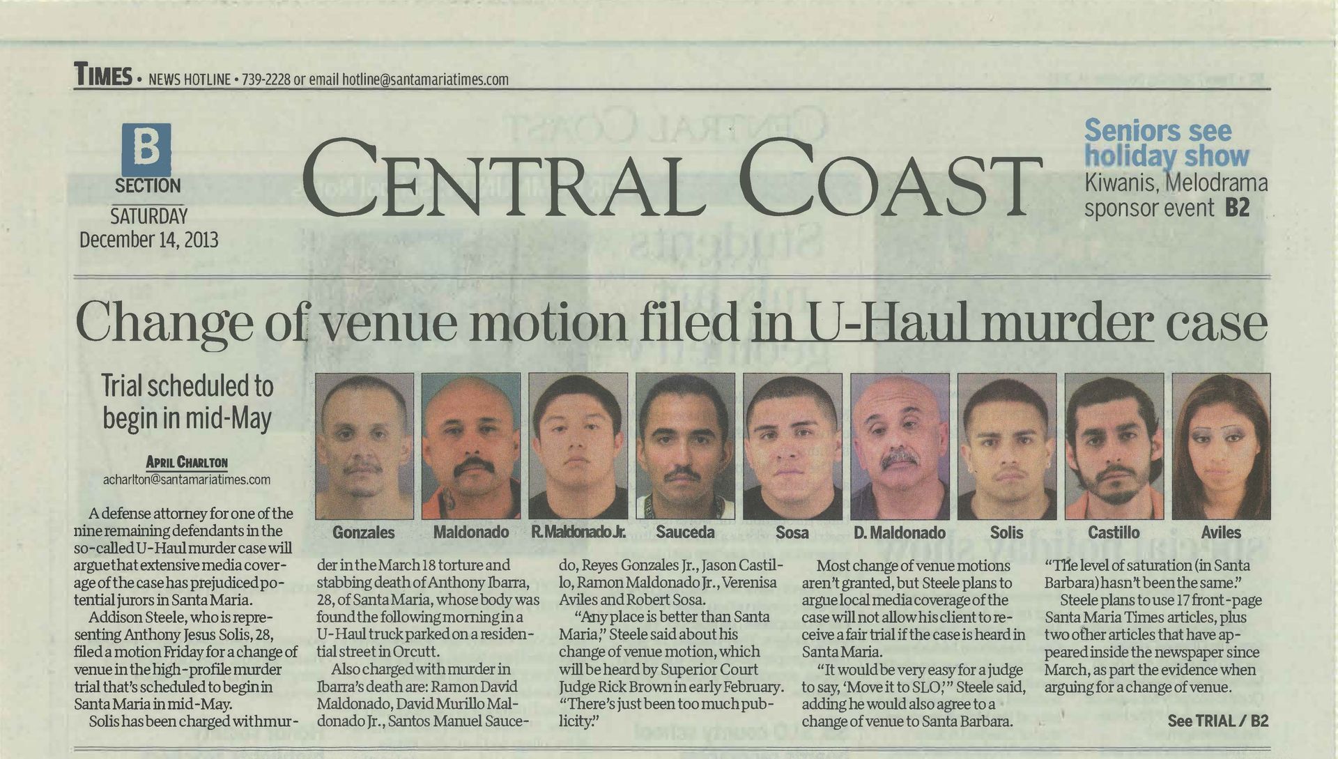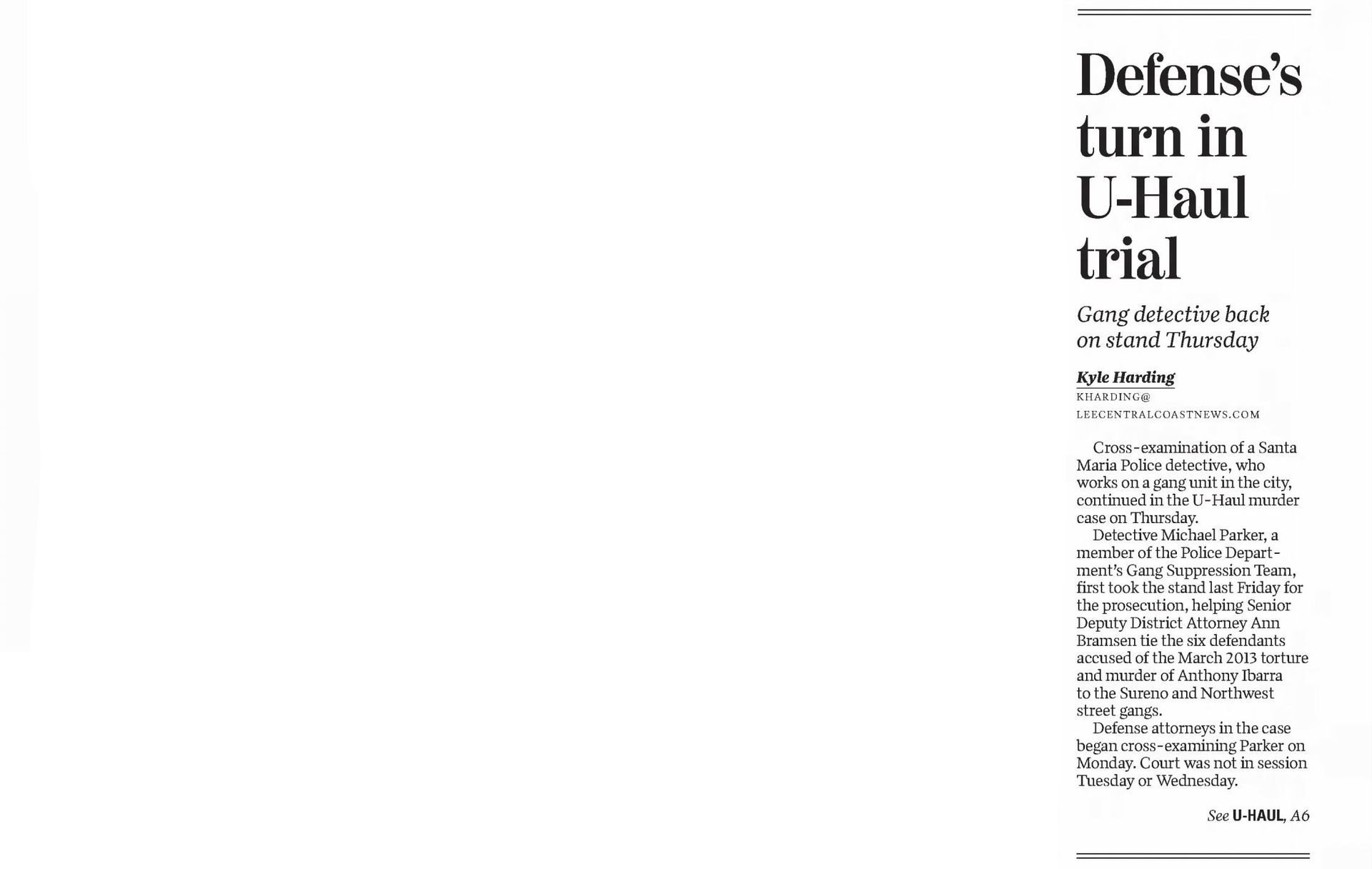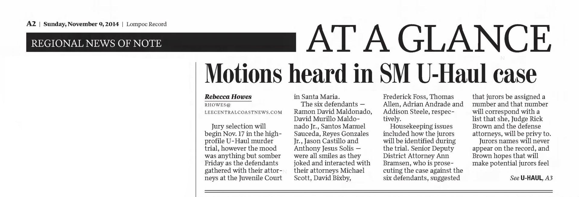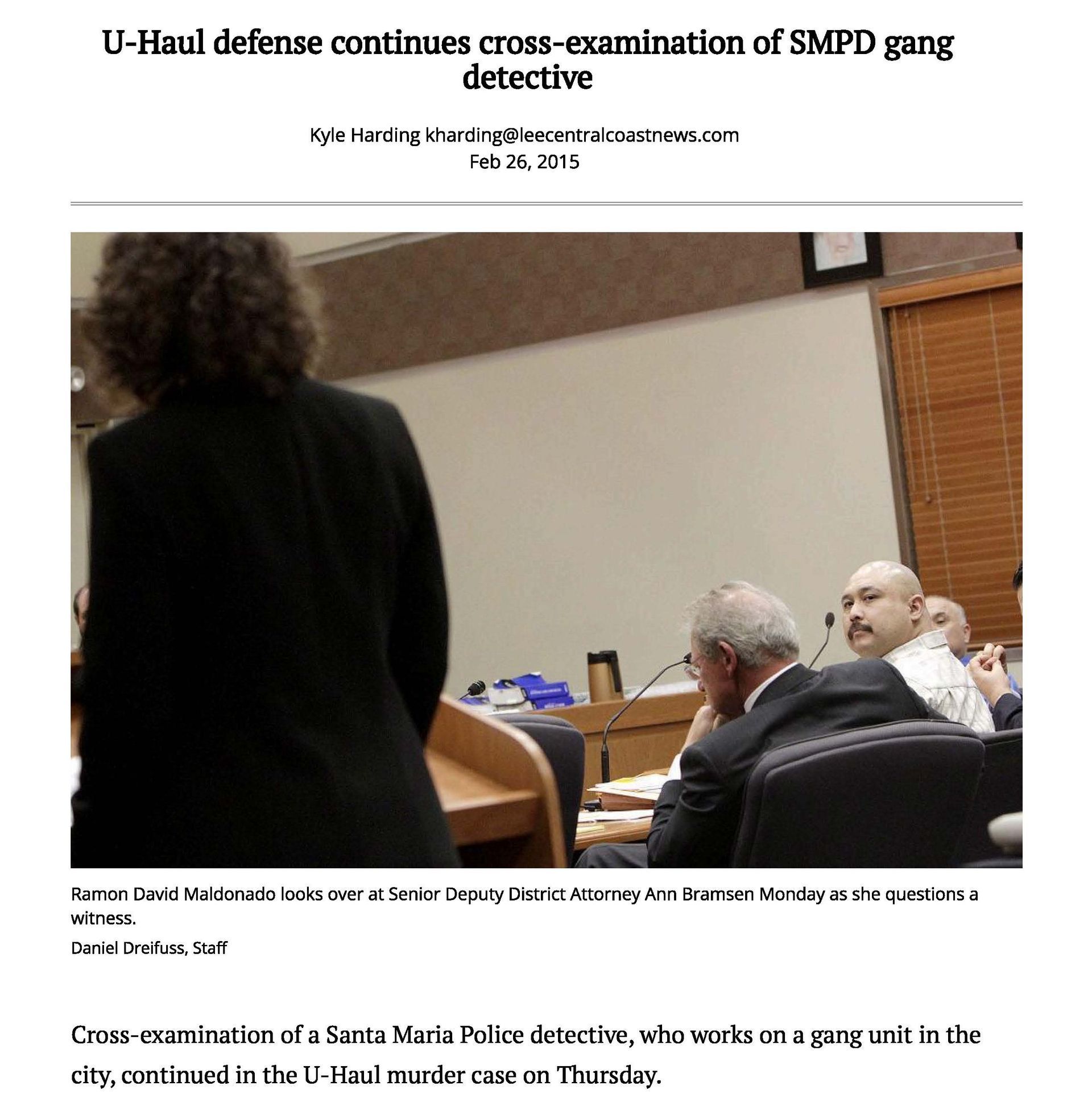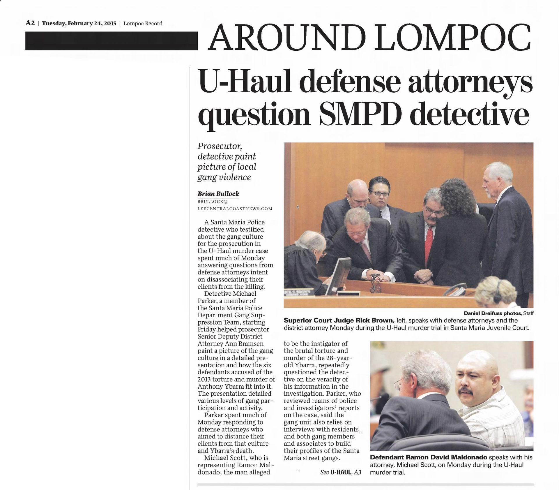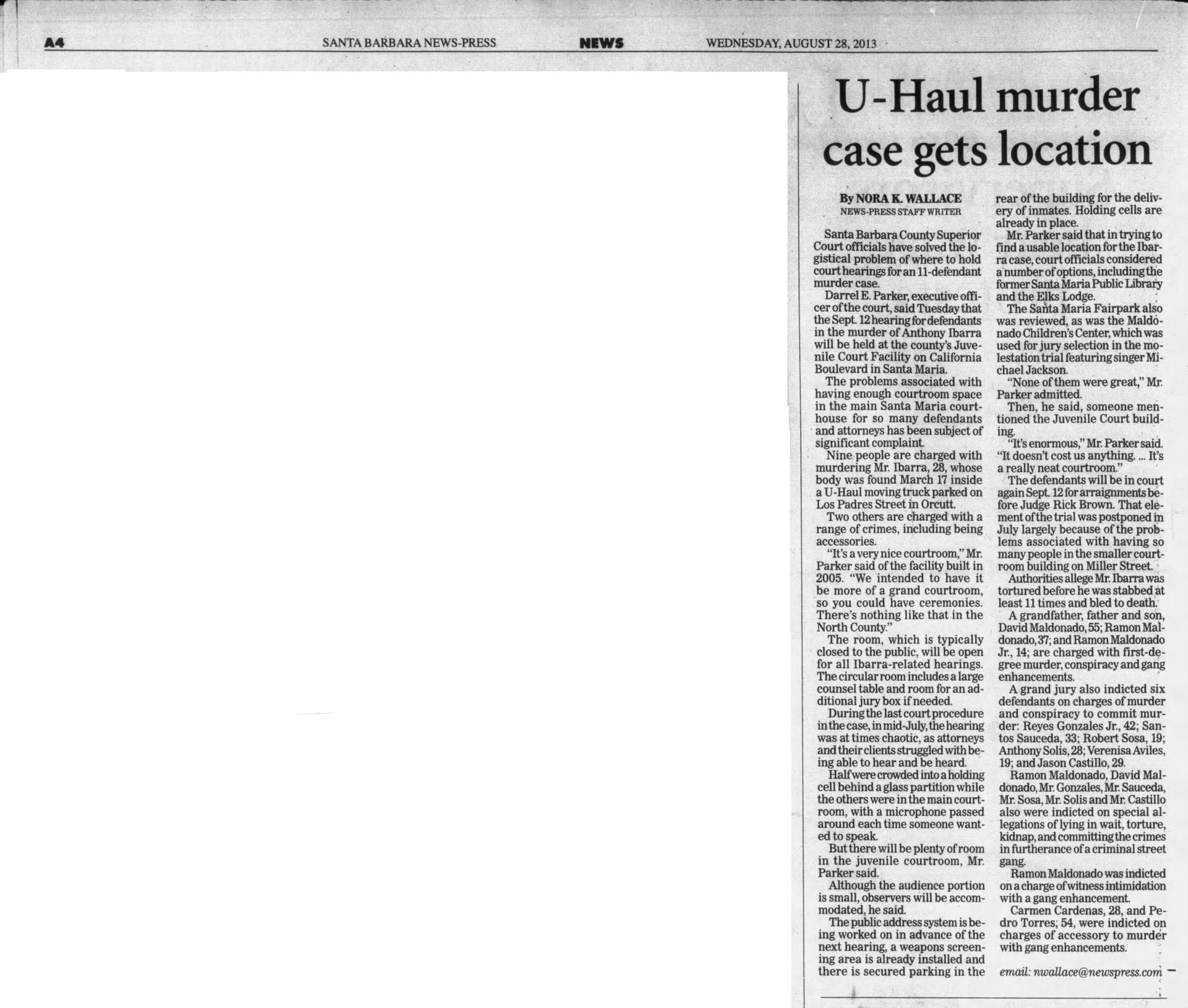 This was a particularly long and grueling murder trial. The press dubbed the case "The U-Haul Murder Trial" because the decedent's body was discovered in an abandoned U-Haul truck with his blood dripping out of the back of the truck. There were originally 13 co-defendants, not all of which were charged with murder. The plea negotiations parred it down to six co-defendants, all charged with murder, all with special circumstances that included torture and gang murder. All six defendants were facing LWOPP sentences. It was largest number of co-defendants in a murder trial ever in Santa Barbara County, and probably the state. There wasn't a courtroom in the county large enough for the trial. The largest courtroom in the county is at the Juvenile Court in Santa Maria, however it didn't have a jury box because juveniles do not have a right to a jury trial. The courtroom was modified by having a jury box built in it. However, even that was far too small for jury selection because of the several hundreds of prospective jurors would need to be called.
