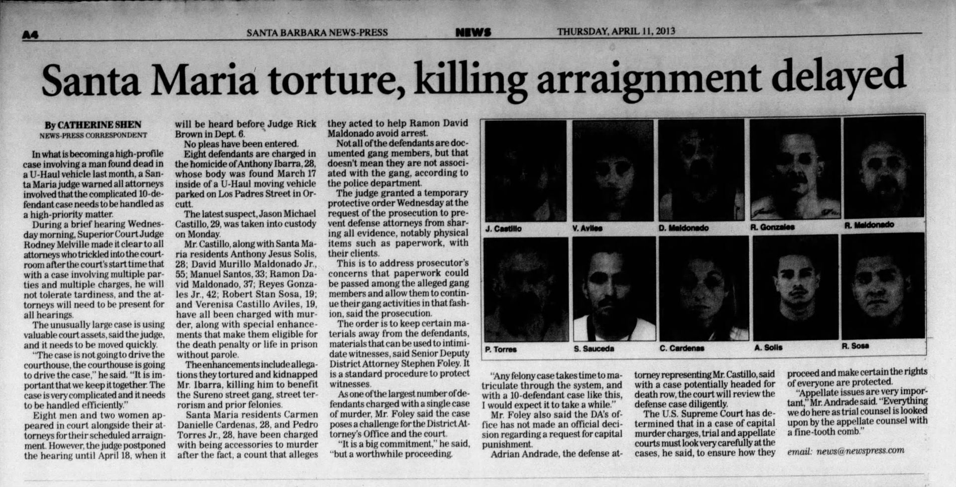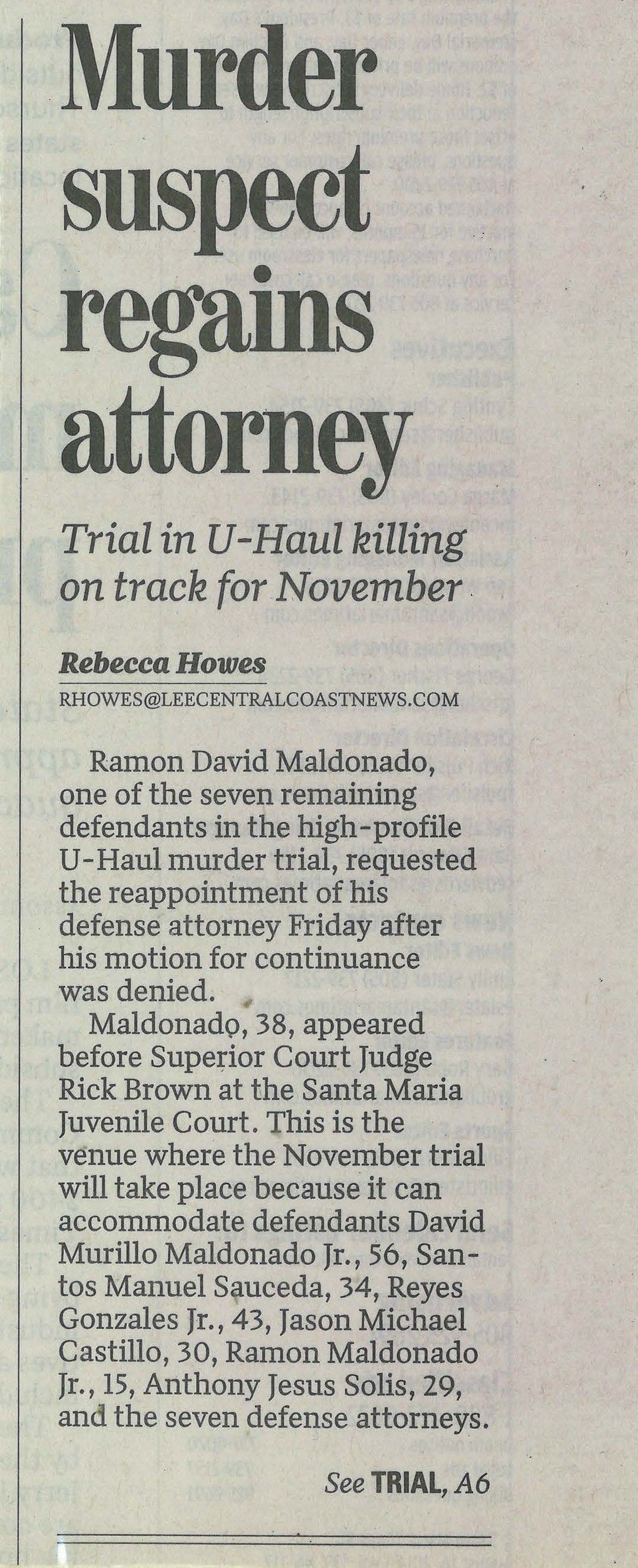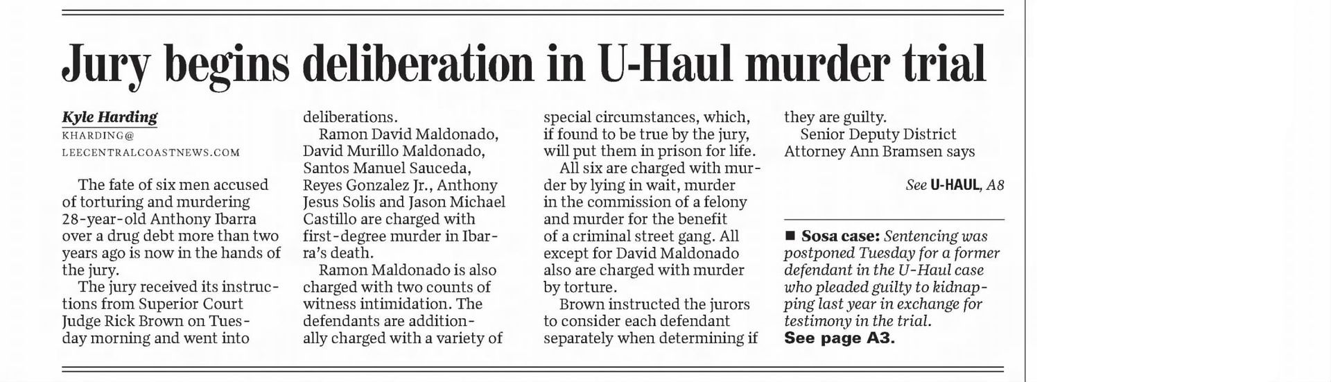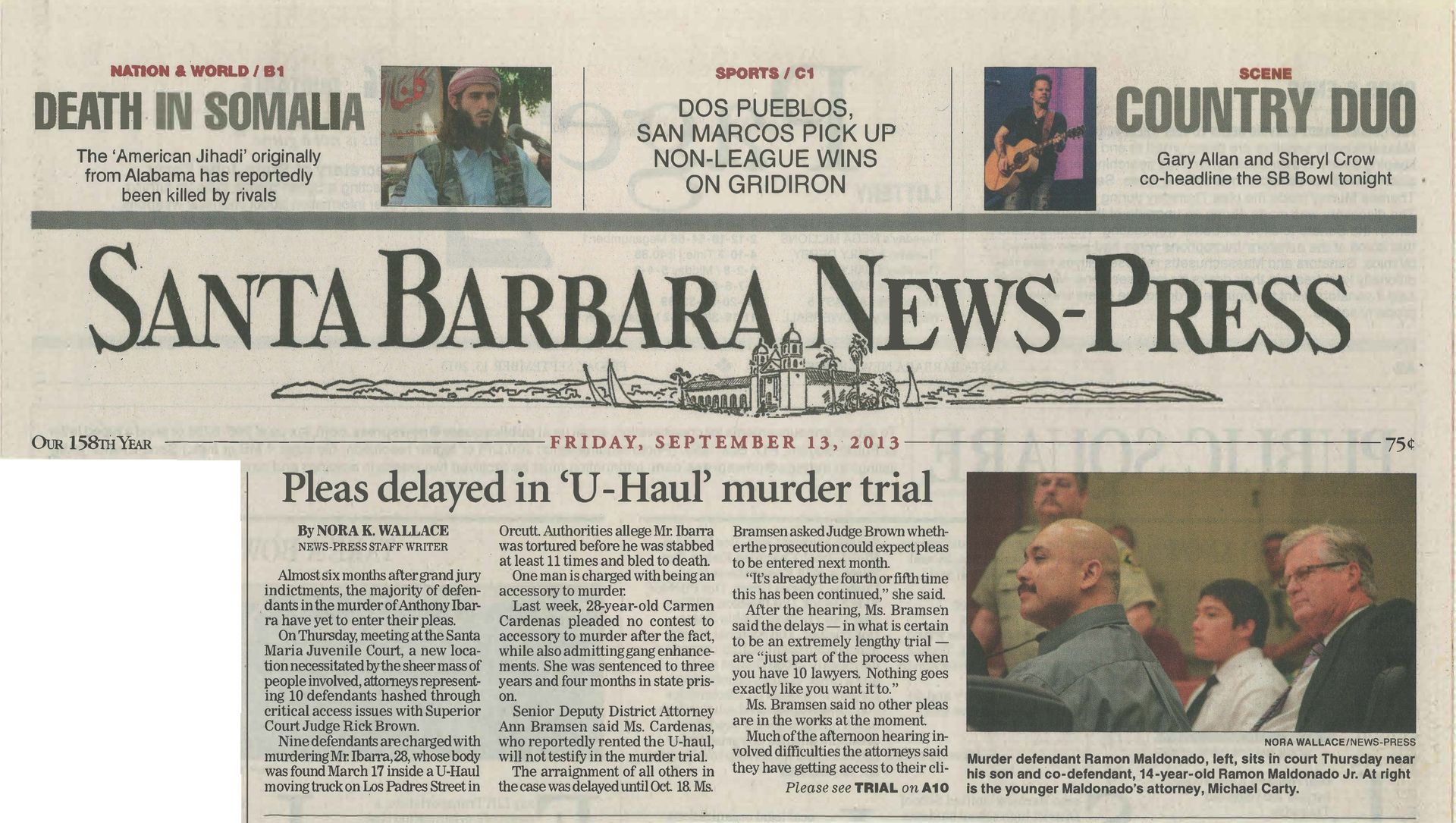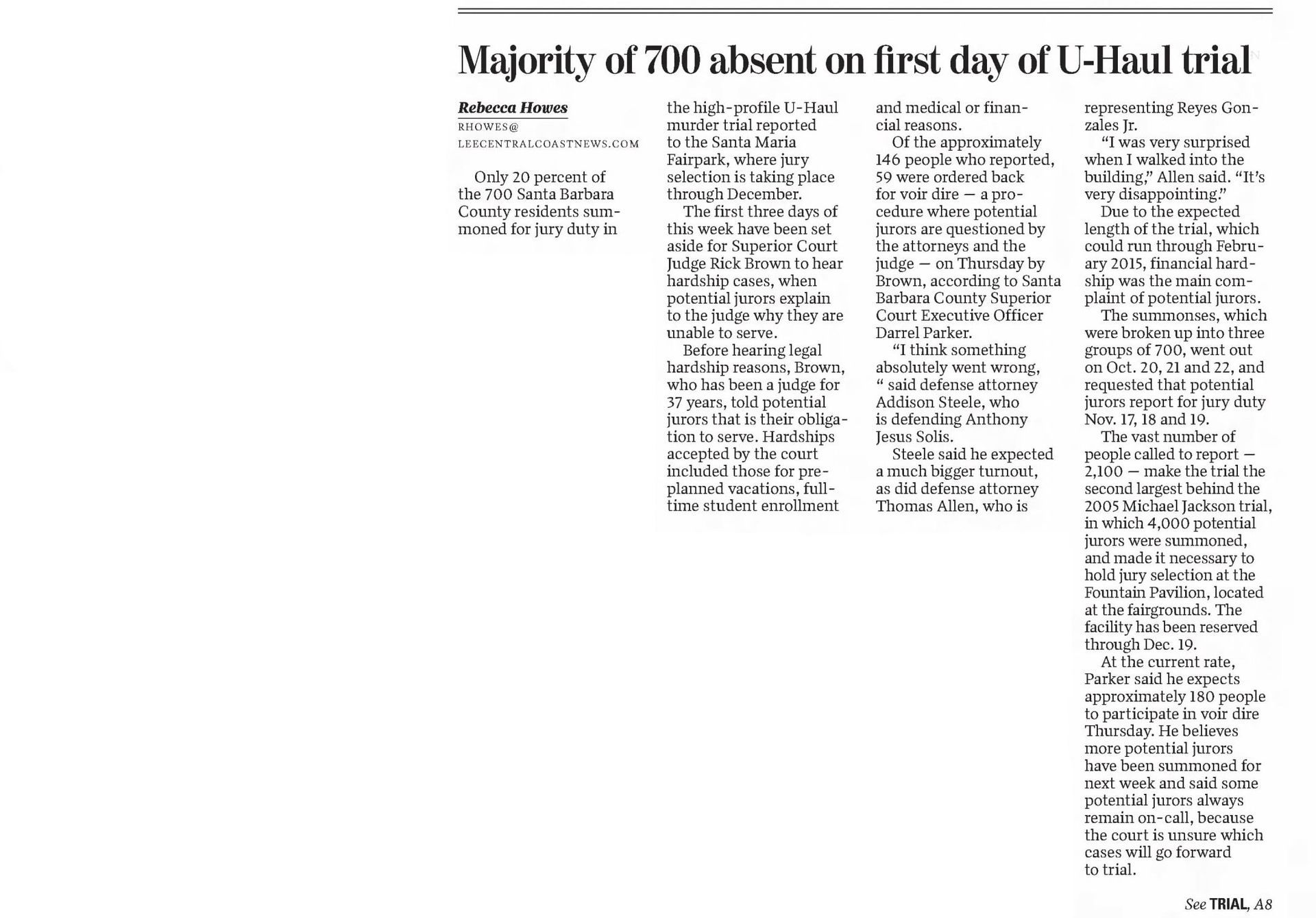 This was a particularly long and grueling murder trial. The press dubbed the case "The U-Haul Murder Trial" because the decedent's body was discovered in an abandoned U-Haul truck with his blood dripping out of the back of the truck. There were originally 13 co-defendants, not all of which were charged with murder. The plea negotiations parred it down to six co-defendants, all charged with murder, all with special circumstances that included torture and gang murder. All six defendants were facing LWOPP sentences. It was largest number of co-defendants in a murder trial ever in Santa Barbara County, and probably the state. There wasn't a courtroom in the county large enough for the trial. The largest courtroom in the county is at the Juvenile Court in Santa Maria, however it didn't have a jury box because juveniles do not have a right to a jury trial. The courtroom was modified by having a jury box built in it. However, even that was far too small for jury selection because of the several hundreds of prospective jurors would need to be called.