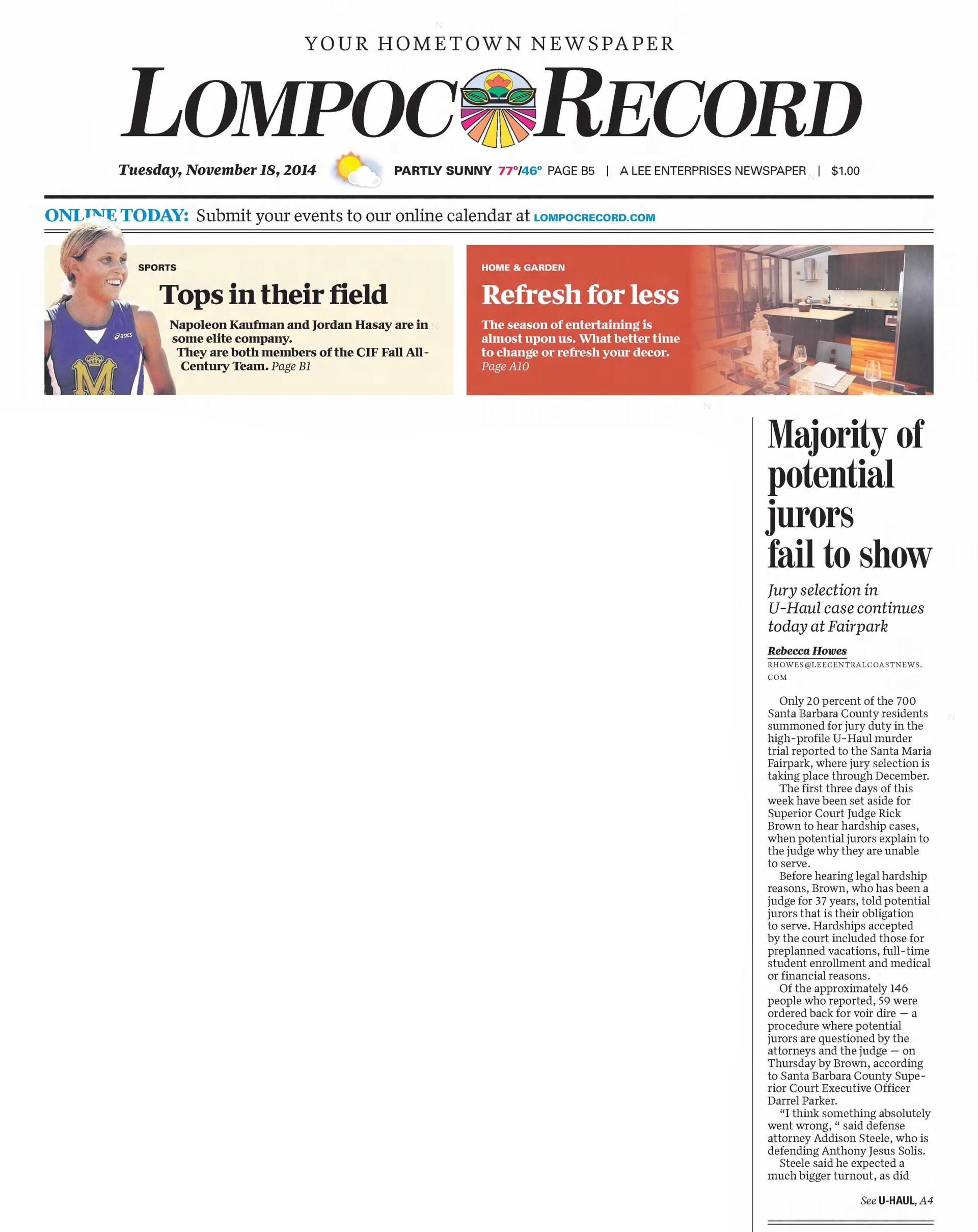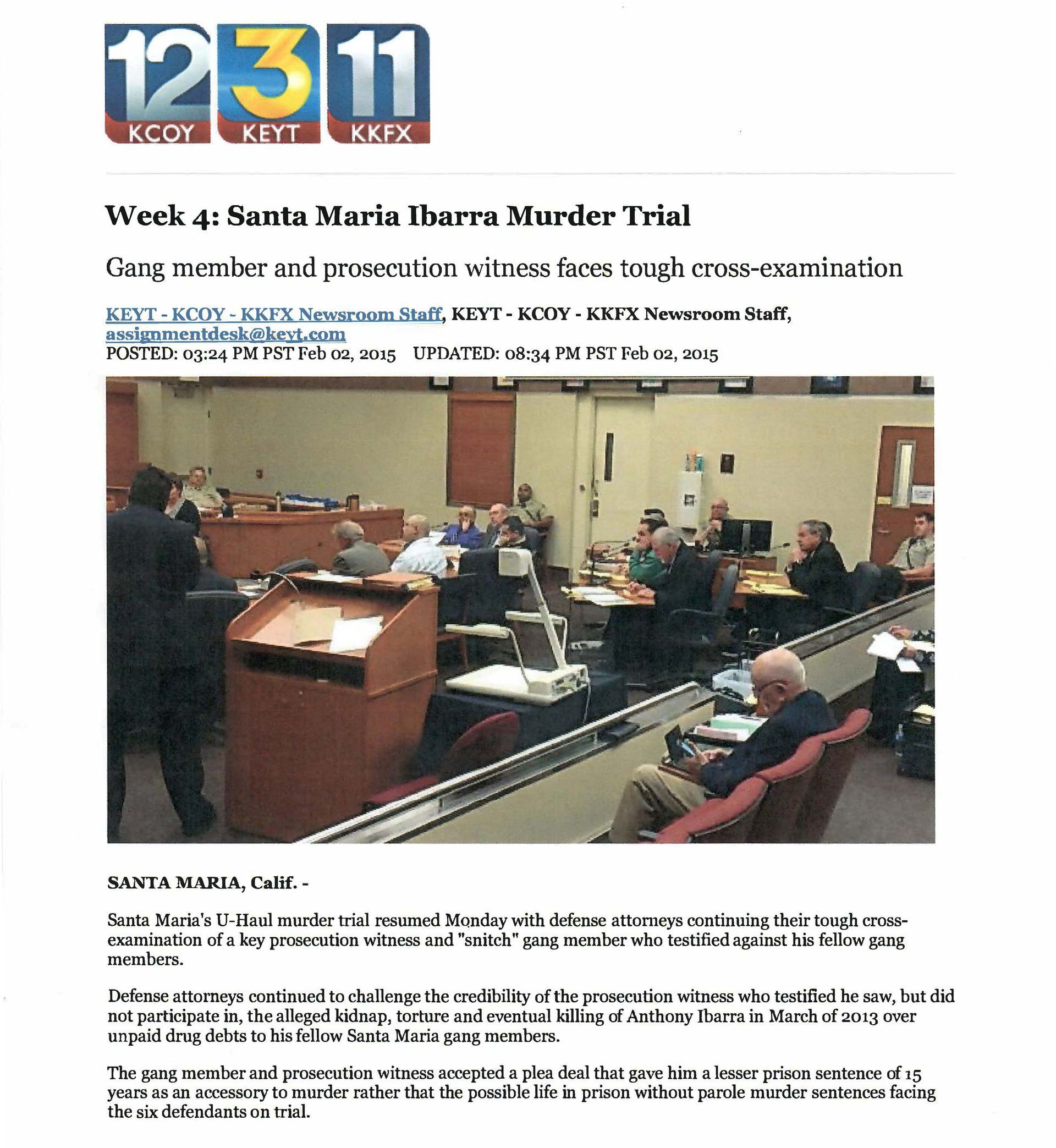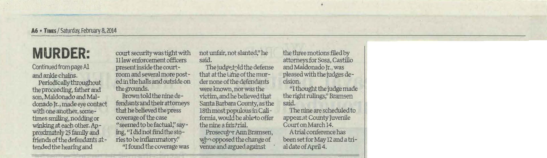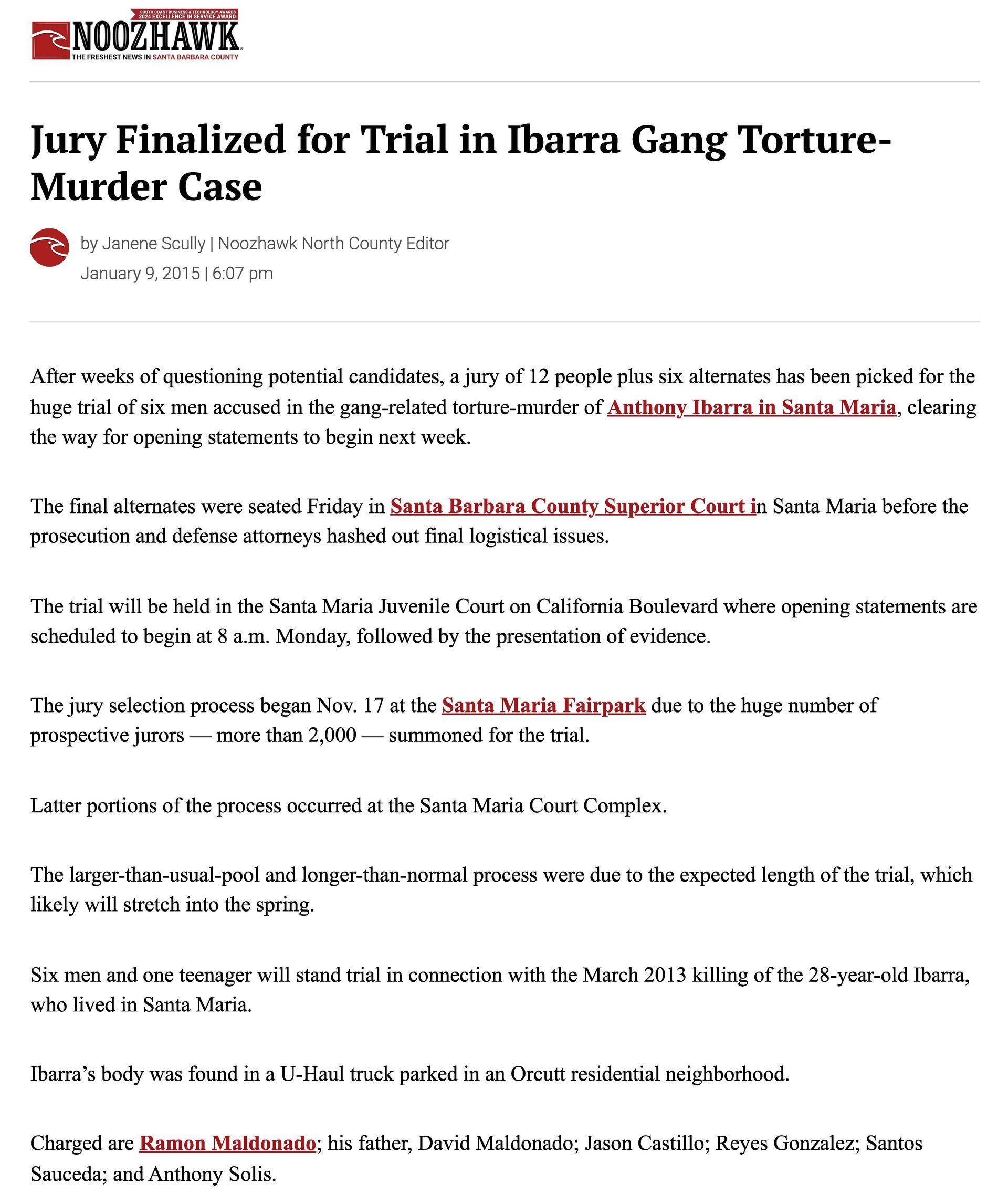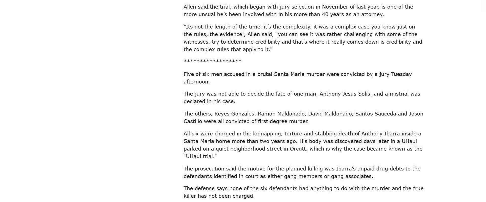 This was a particularly long and grueling murder trial. The press dubbed the case "The U-Haul Murder Trial" because the decedent's body was discovered in an abandoned U-Haul truck with his blood dripping out of the back of the truck. There were originally 13 co-defendants, not all of which were charged with murder. The plea negotiations parred it down to six co-defendants, all charged with murder, all with special circumstances that included torture and gang murder. All six defendants were facing LWOPP sentences. It was largest number of co-defendants in a murder trial ever in Santa Barbara County, and probably the state. There wasn't a courtroom in the county large enough for the trial. The largest courtroom in the county is at the Juvenile Court in Santa Maria, however it didn't have a jury box because juveniles do not have a right to a jury trial. The courtroom was modified by having a jury box built in it. However, even that was far too small for jury selection because of the several hundreds of prospective jurors would need to be called.