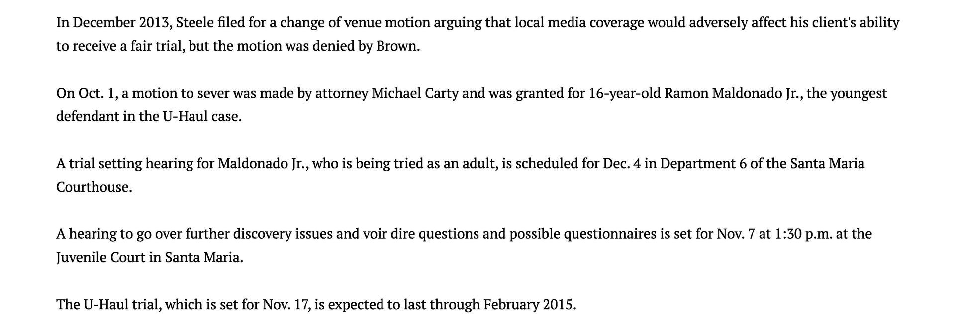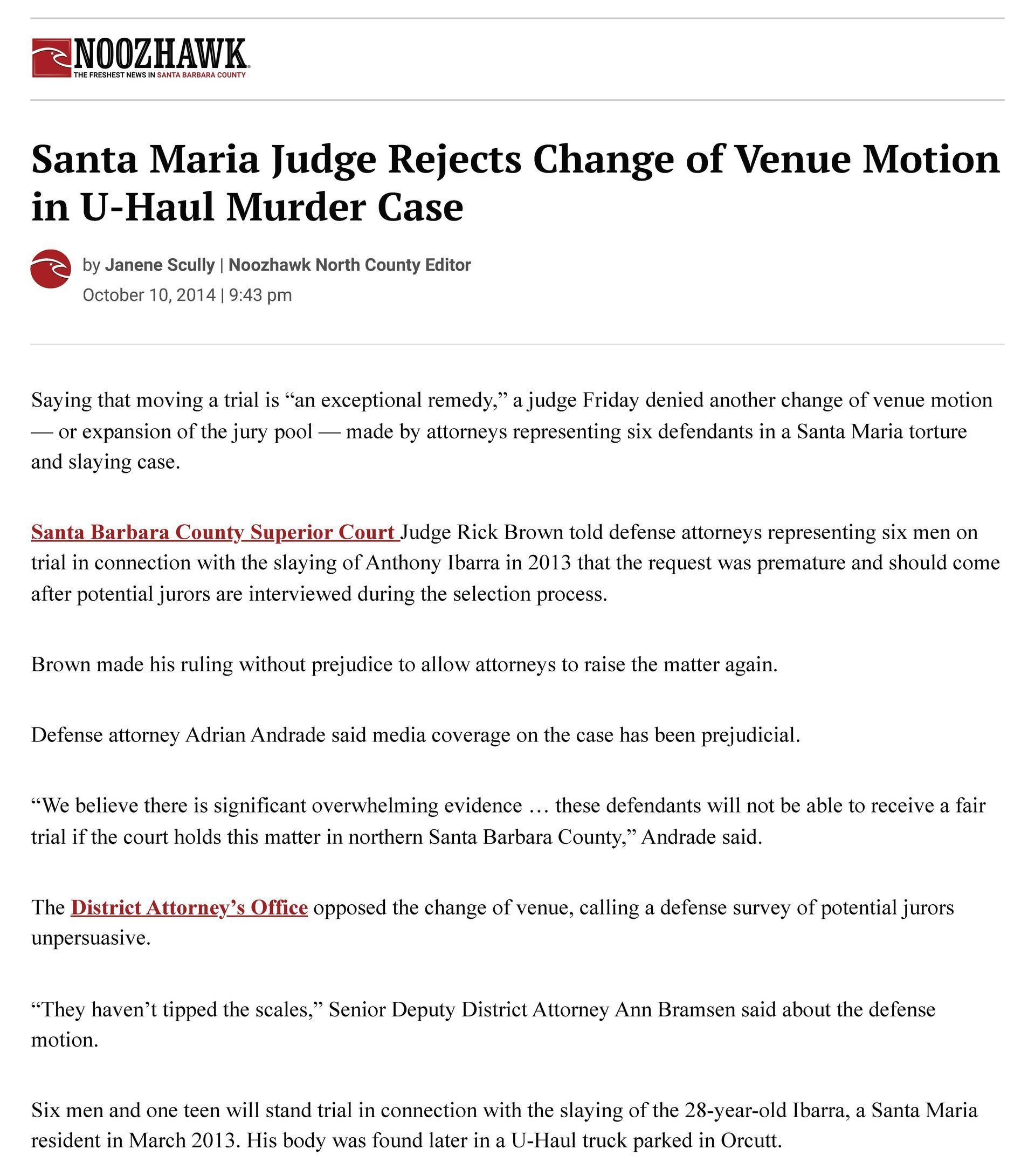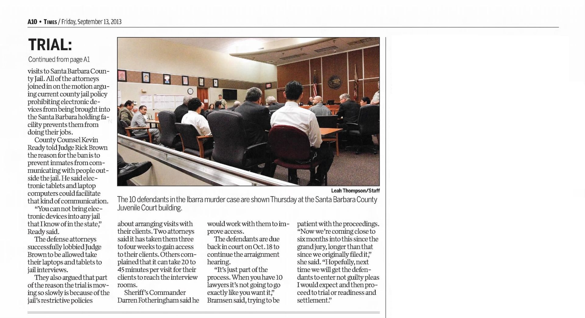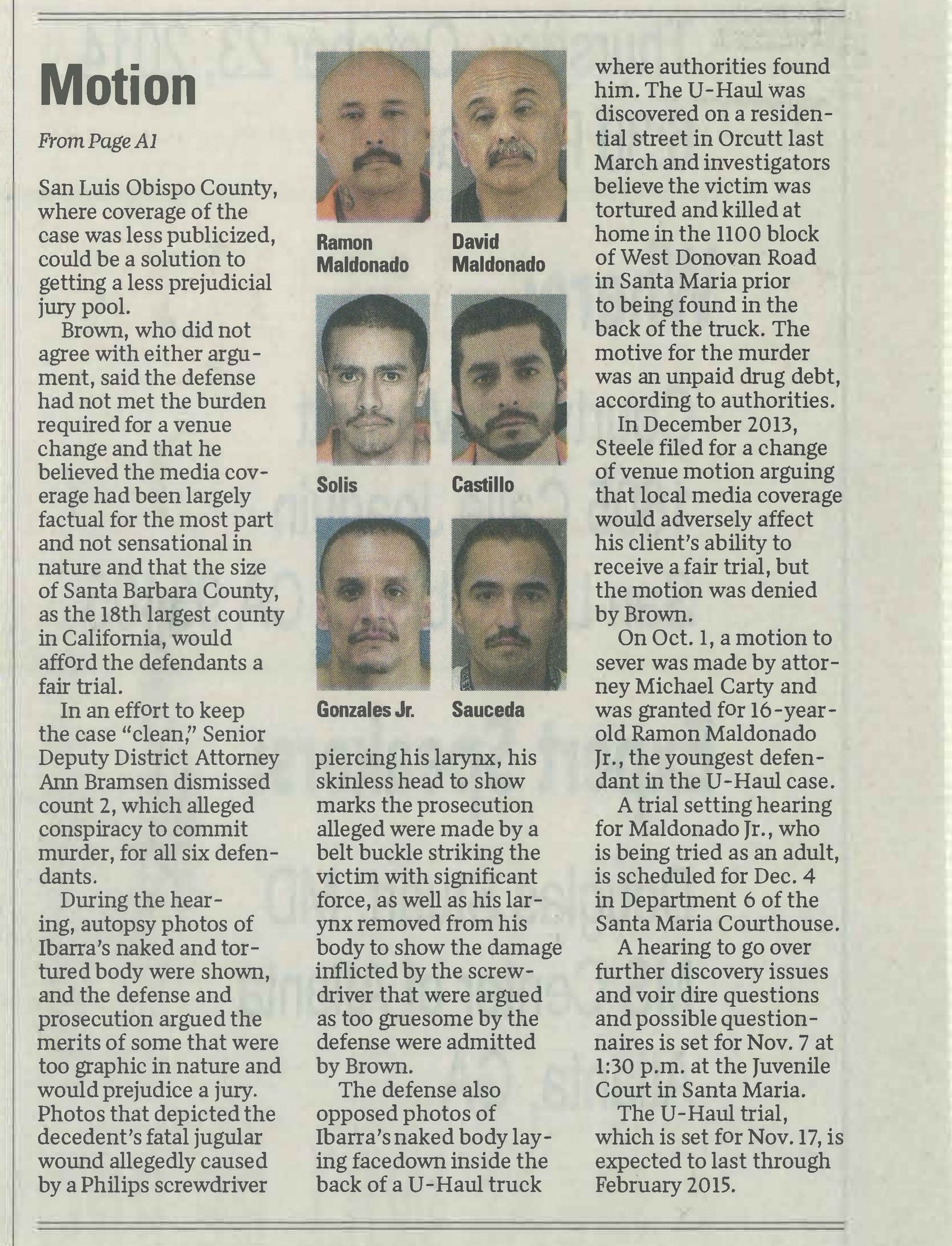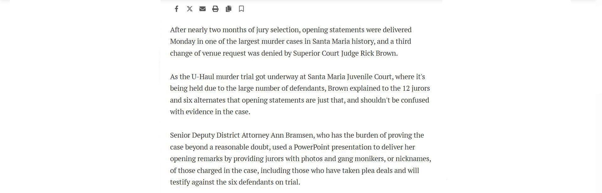This was a particularly long and grueling murder trial. The press dubbed the case "The U-Haul Murder Trial" because the decedent's body was discovered in an abandoned U-Haul truck with his blood dripping out of the back of the truck. There were originally 13 co-defendants, not all of which were charged with murder. The plea negotiations parred it down to six co-defendants, all charged with murder, all with special circumstances that included torture and gang murder. All six defendants were facing LWOPP sentences. It was largest number of co-defendants in a murder trial ever in Santa Barbara County, and probably the state. There wasn't a courtroom in the county large enough for the trial. The largest courtroom in the county is at the Juvenile Court in Santa Maria, however it didn't have a jury box because juveniles do not have a right to a jury trial. The courtroom was modified by having a jury box built in it. However, even that was far too small for jury selection because of the several hundreds of prospective jurors would need to be called.