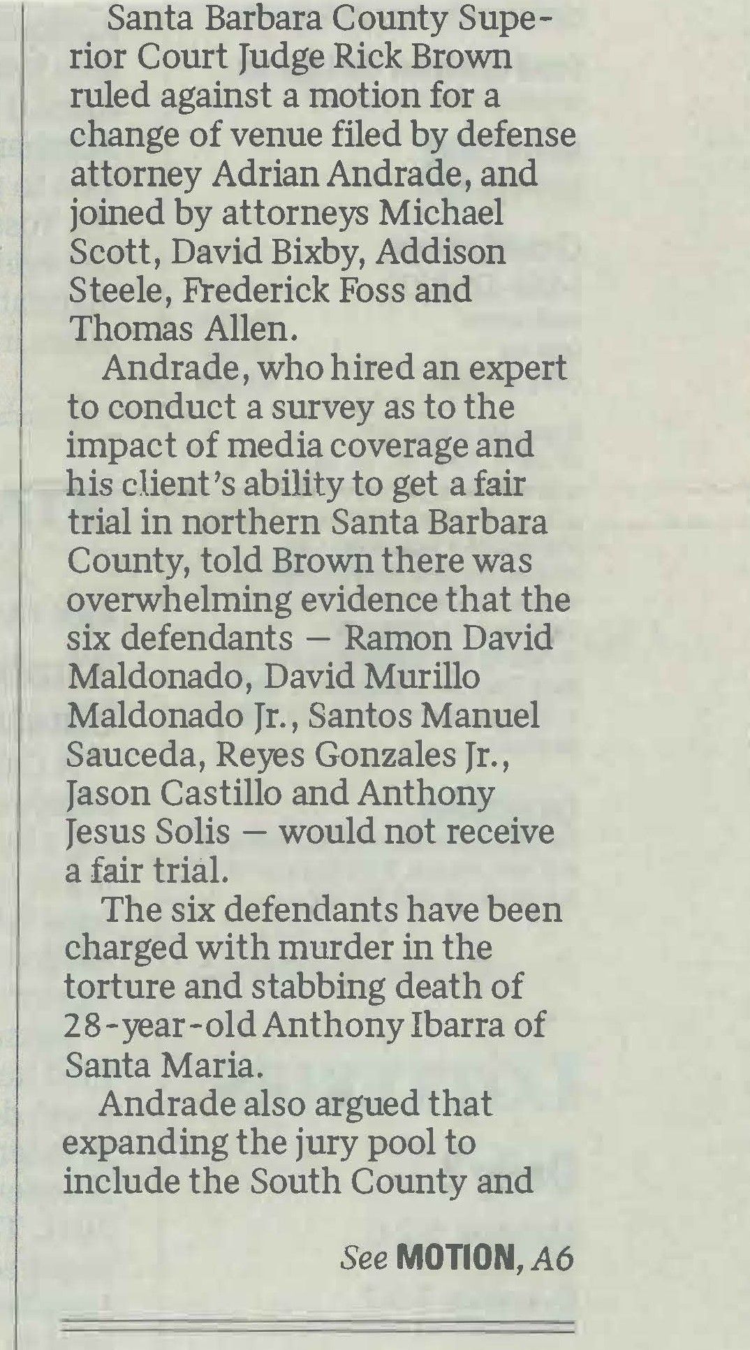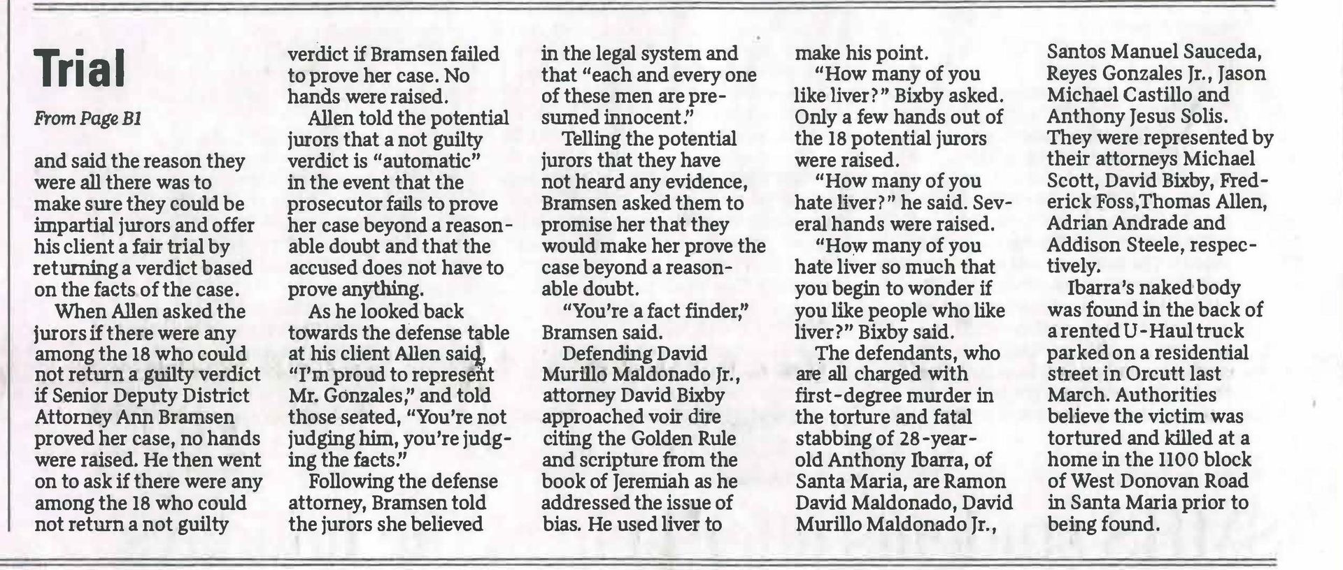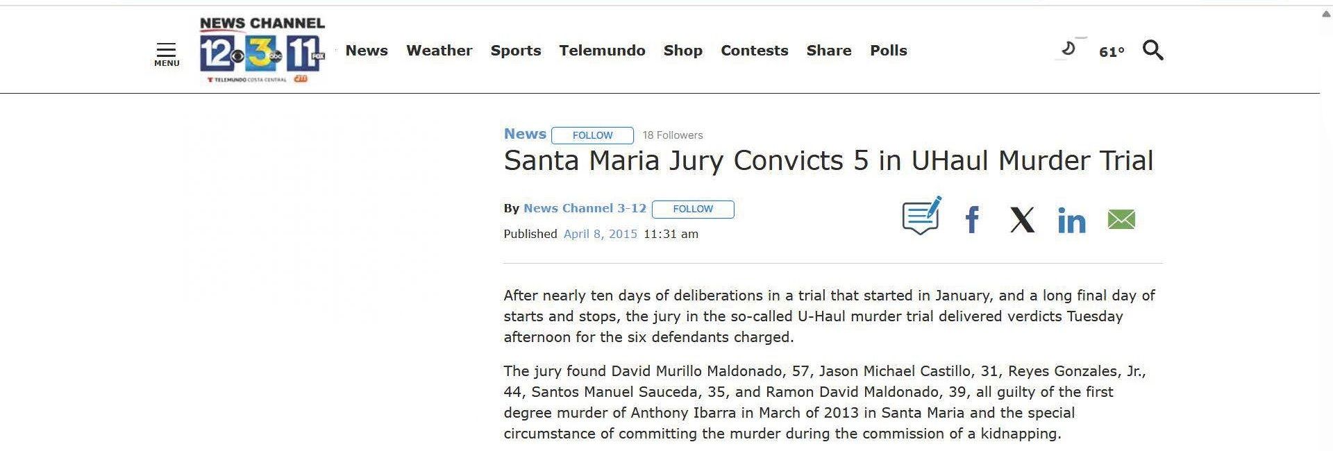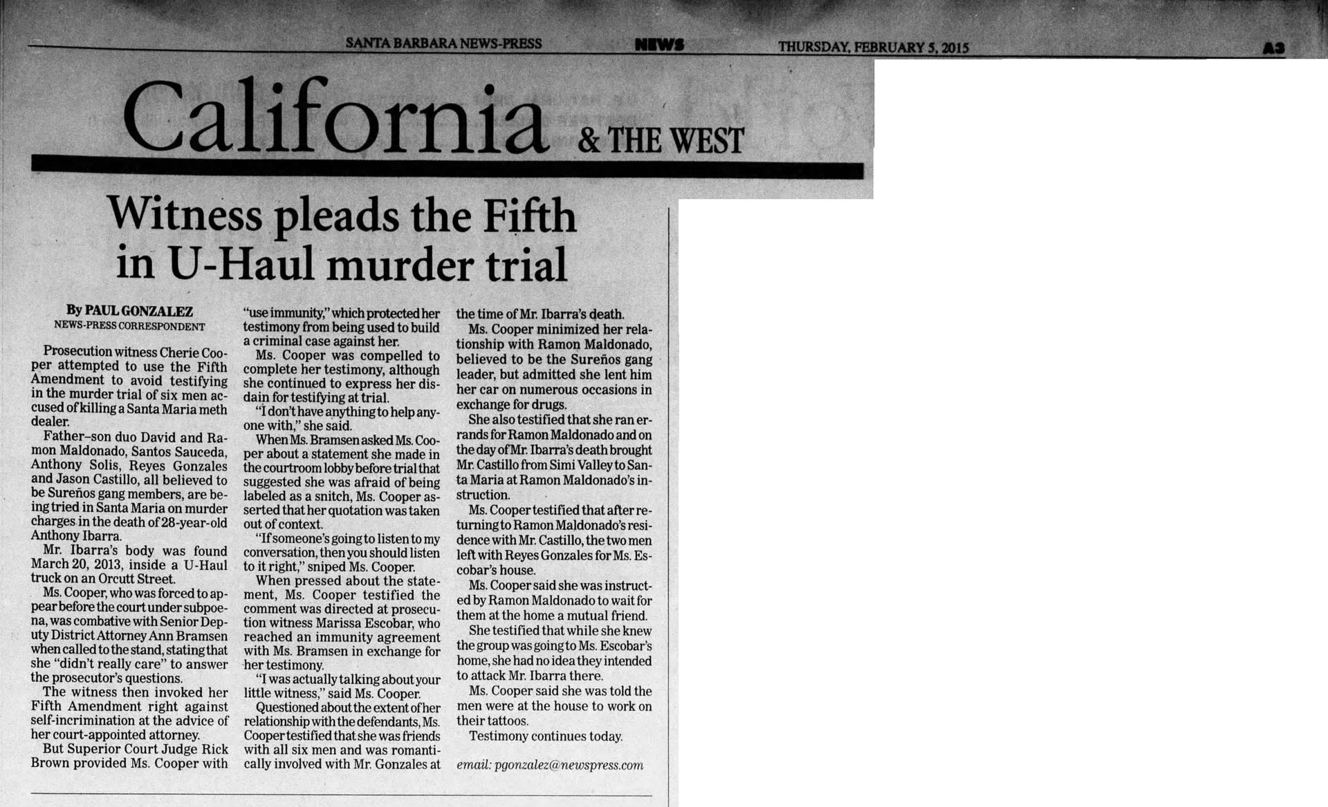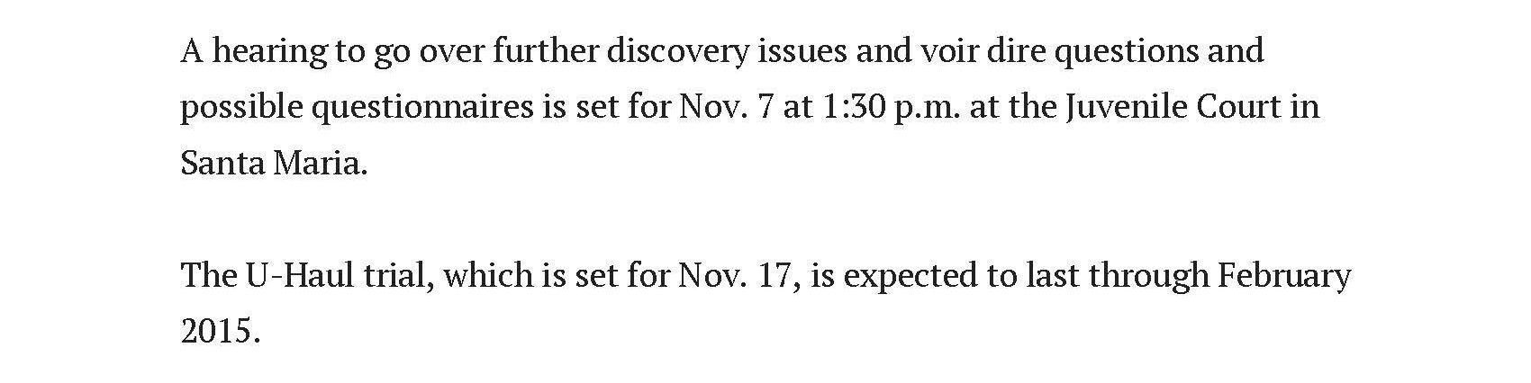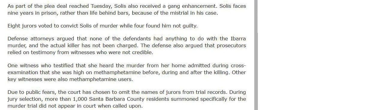 This was a particularly long and grueling murder trial. The press dubbed the case "The U-Haul Murder Trial" because the decedent's body was discovered in an abandoned U-Haul truck with his blood dripping out of the back of the truck. There were originally 13 co-defendants, not all of which were charged with murder. The plea negotiations parred it down to six co-defendants, all charged with murder, all with special circumstances that included torture and gang murder. All six defendants were facing LWOPP sentences. It was largest number of co-defendants in a murder trial ever in Santa Barbara County, and probably the state. There wasn't a courtroom in the county large enough for the trial. The largest courtroom in the county is at the Juvenile Court in Santa Maria, however it didn't have a jury box because juveniles do not have a right to a jury trial. The courtroom was modified by having a jury box built in it. However, even that was far too small for jury selection because of the several hundreds of prospective jurors would need to be called.