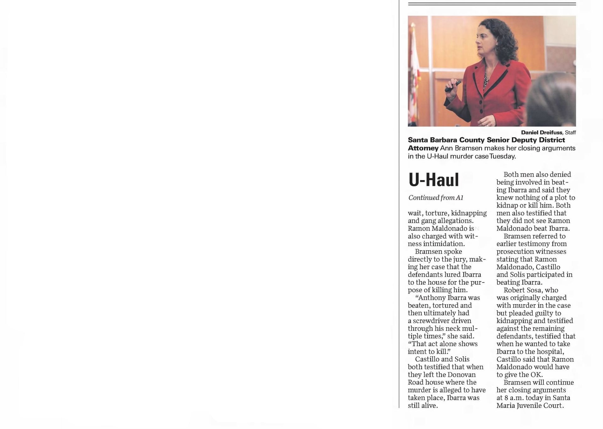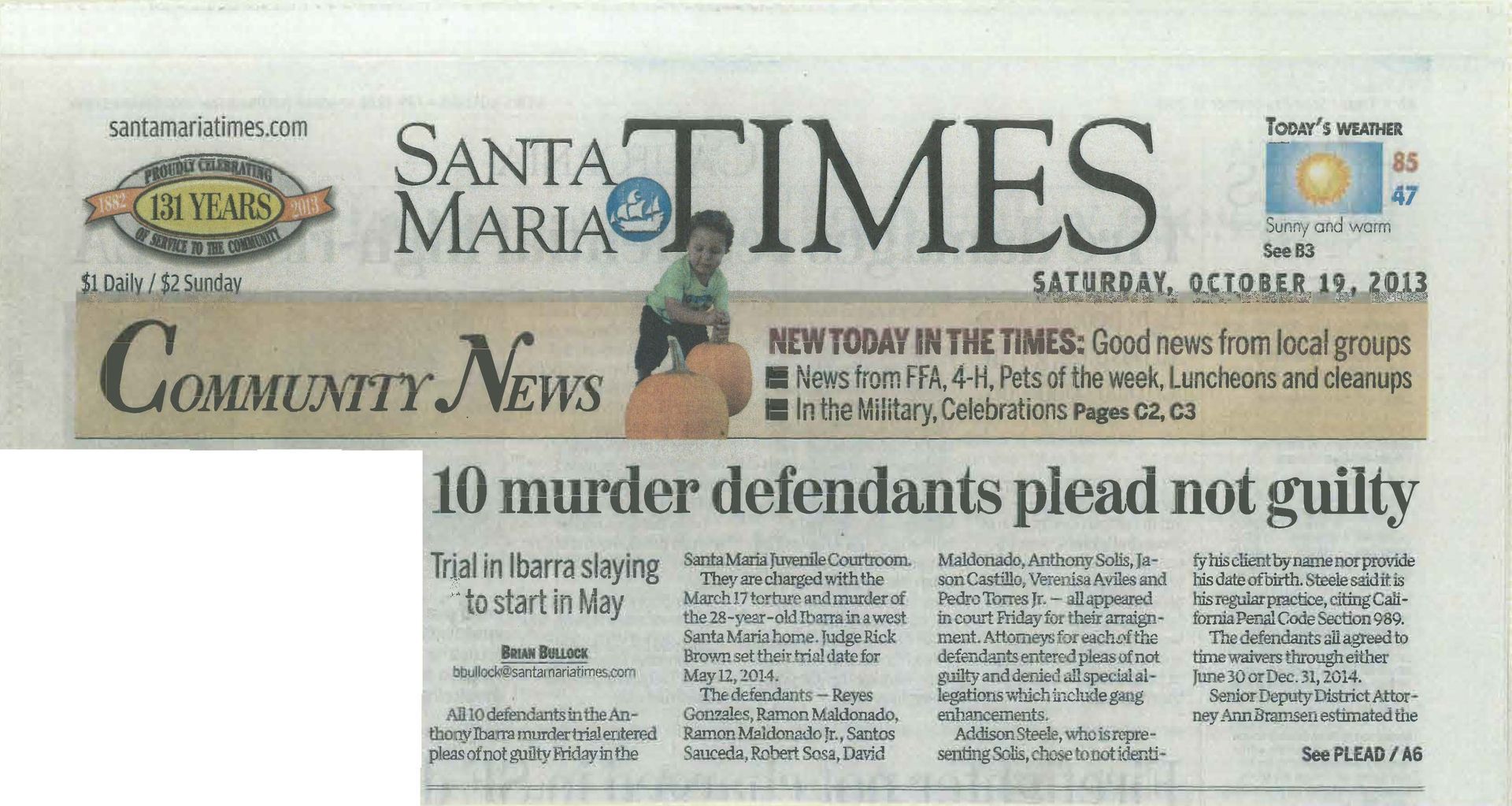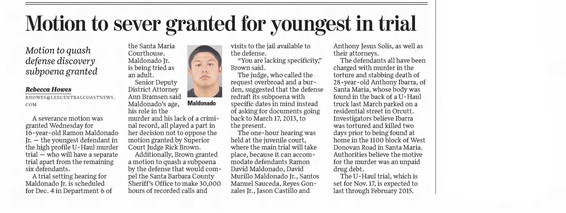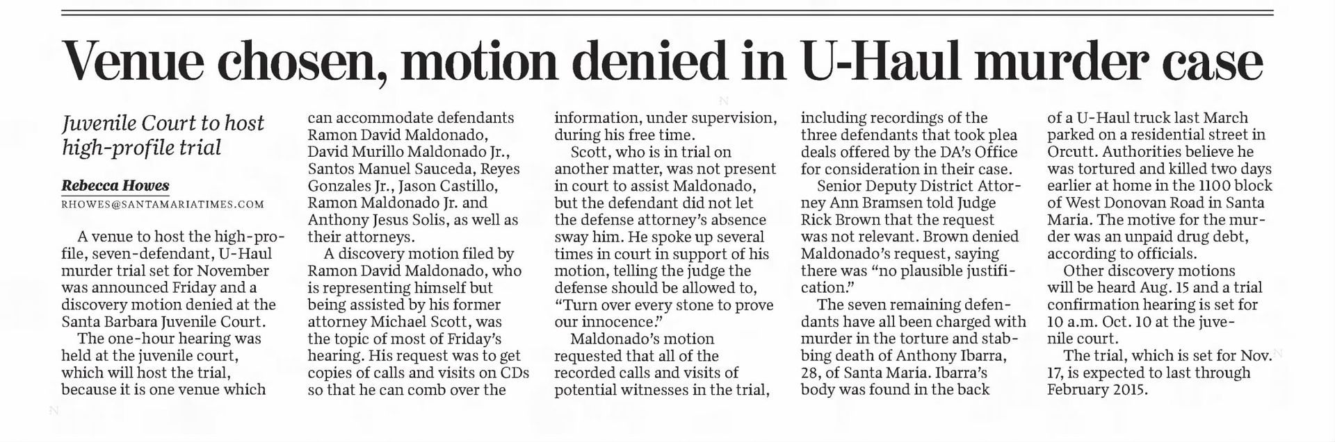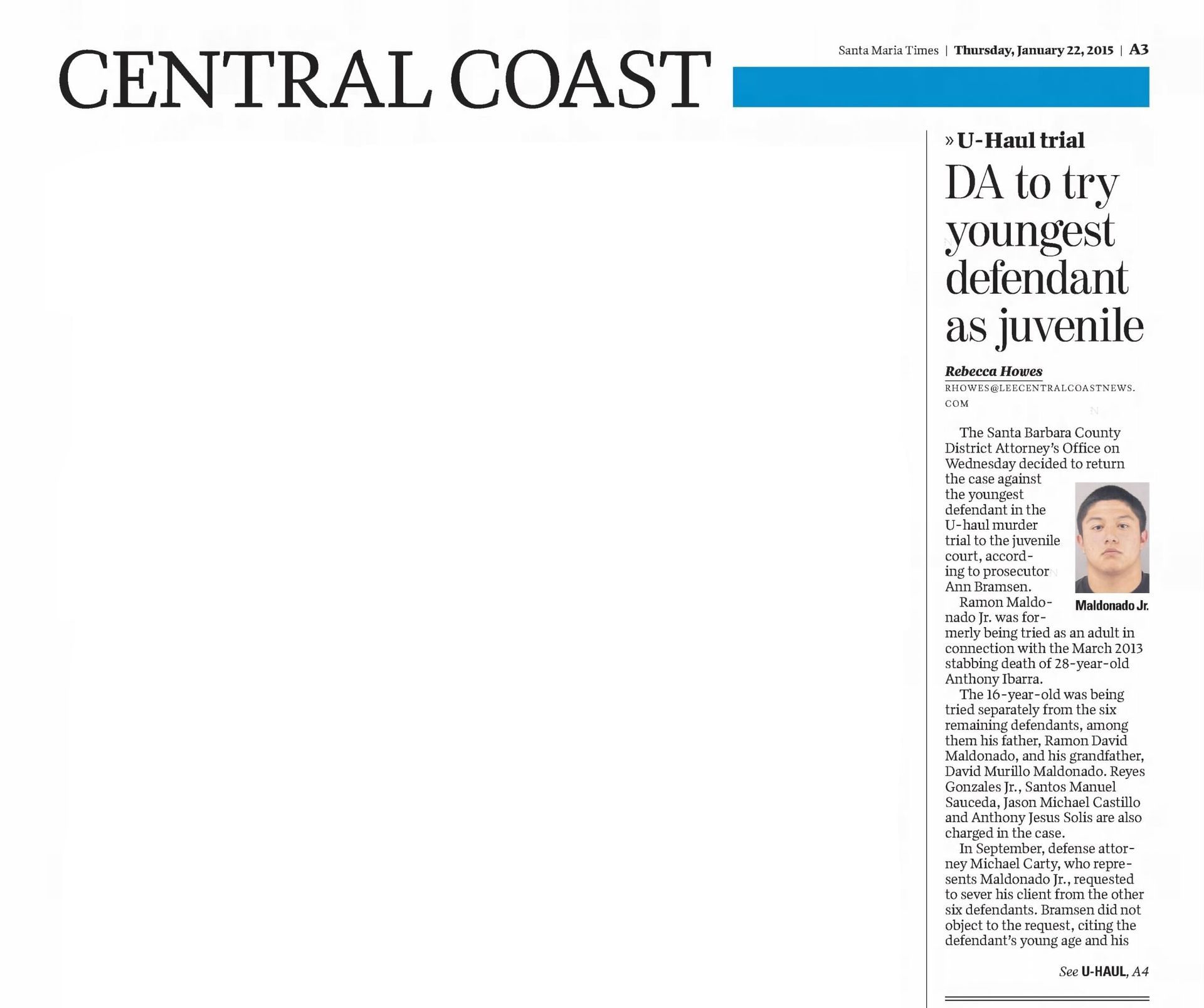 This was a particularly long and grueling murder trial. The press dubbed the case "The U-Haul Murder Trial" because the decedent's body was discovered in an abandoned U-Haul truck with his blood dripping out of the back of the truck. There were originally 13 co-defendants, not all of which were charged with murder. The plea negotiations parred it down to six co-defendants, all charged with murder, all with special circumstances that included torture and gang murder. All six defendants were facing LWOPP sentences. It was largest number of co-defendants in a murder trial ever in Santa Barbara County, and probably the state. There wasn't a courtroom in the county large enough for the trial. The largest courtroom in the county is at the Juvenile Court in Santa Maria, however it didn't have a jury box because juveniles do not have a right to a jury trial. The courtroom was modified by having a jury box built in it. However, even that was far too small for jury selection because of the several hundreds of prospective jurors would need to be called.