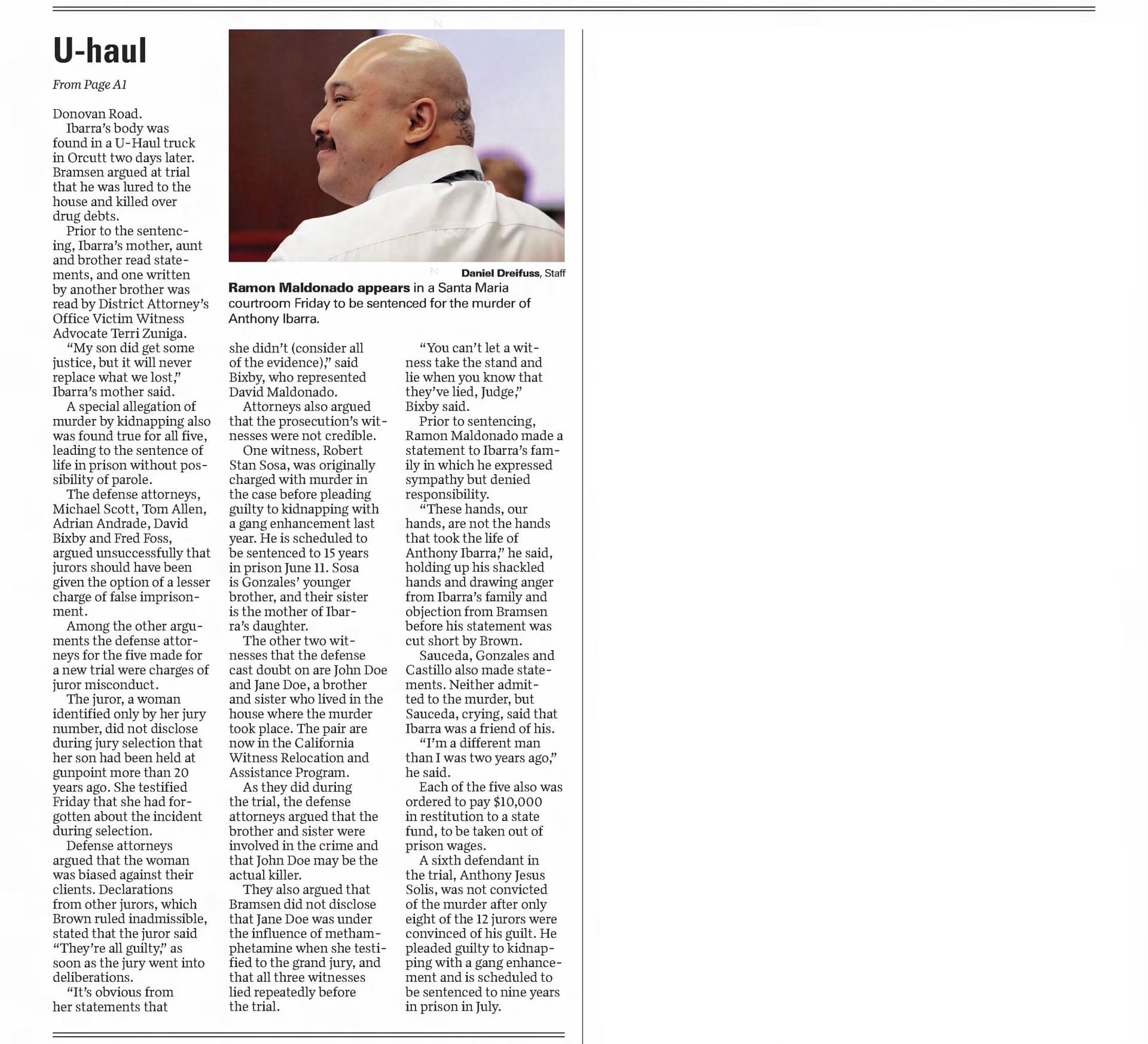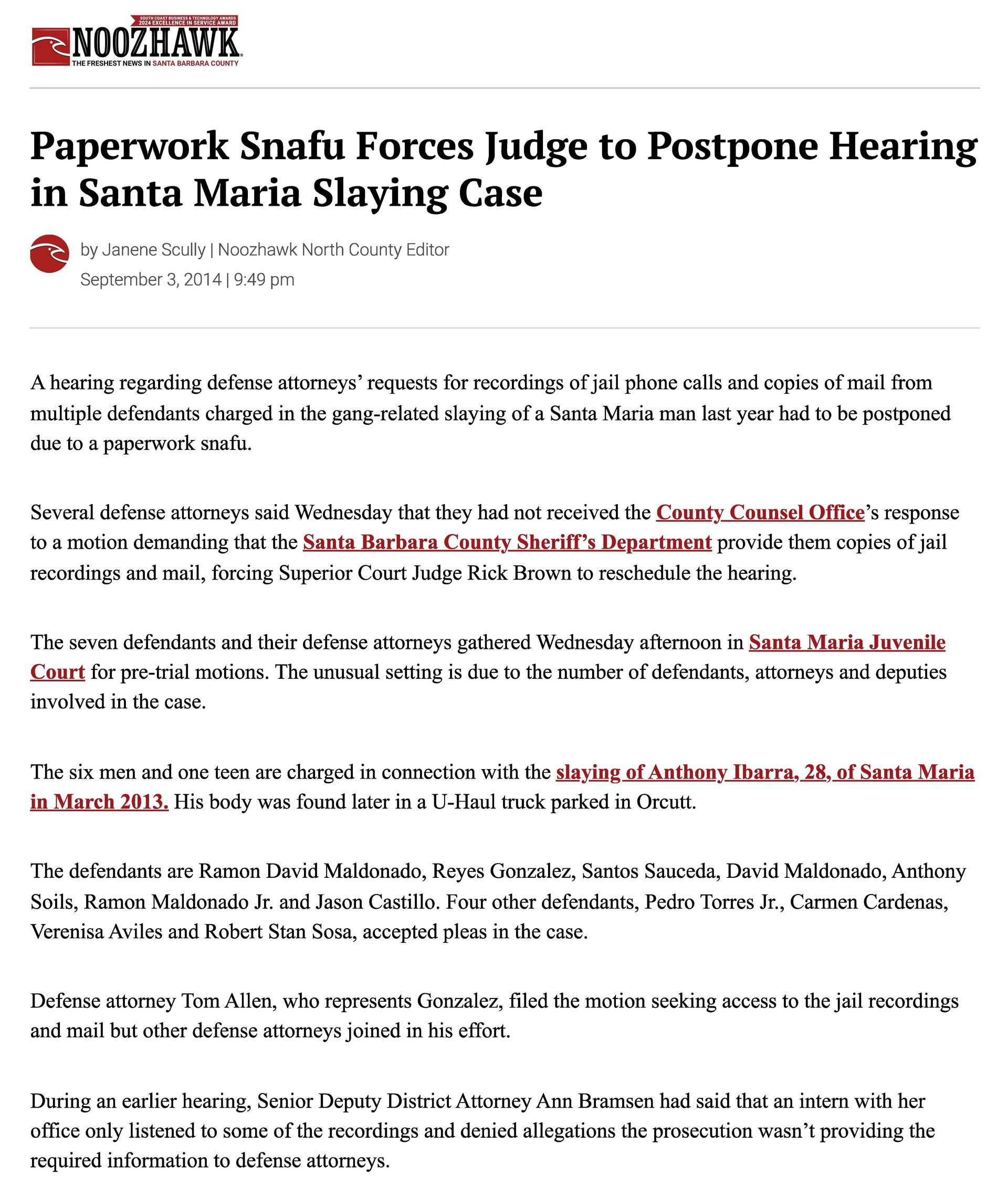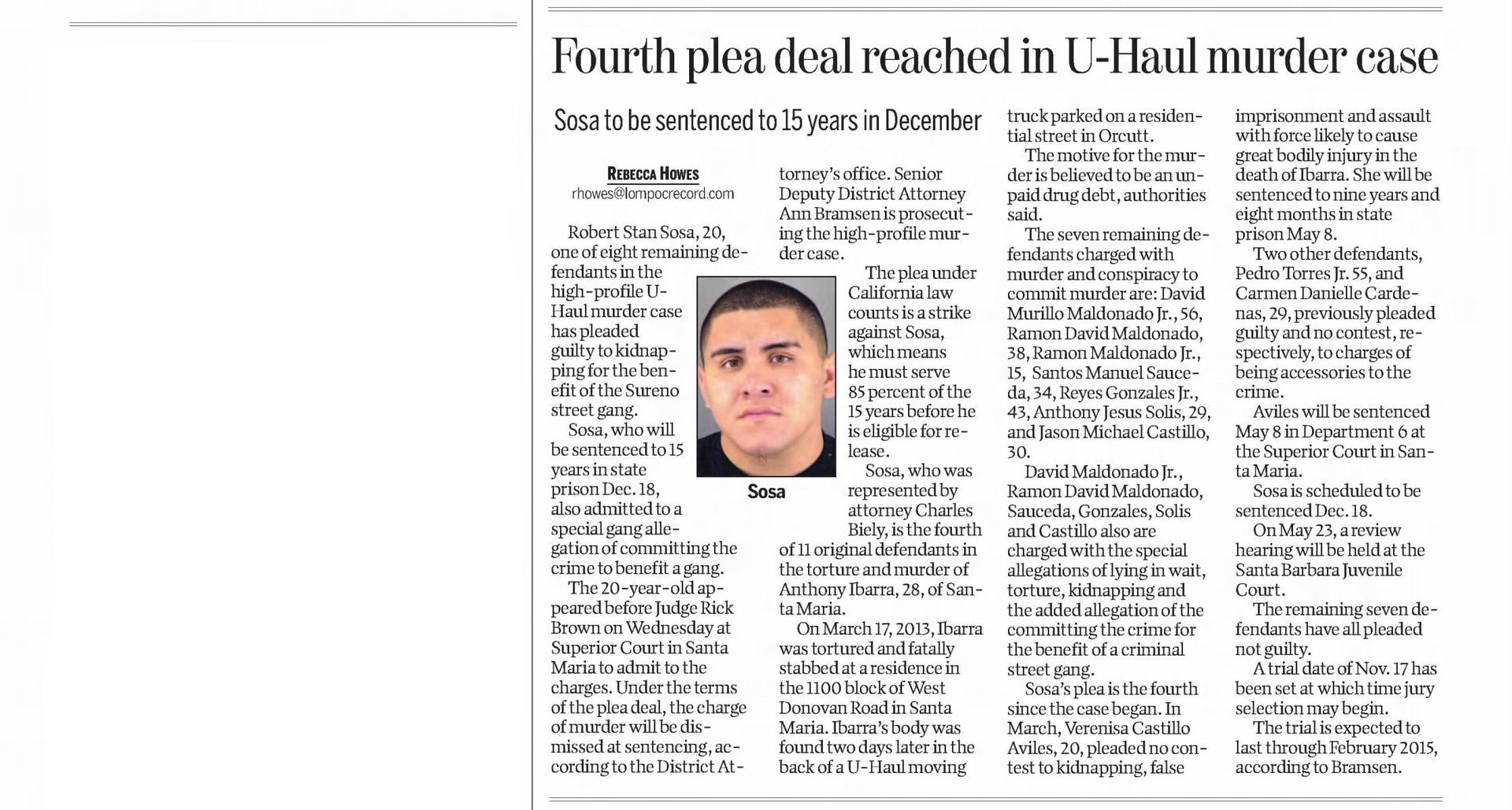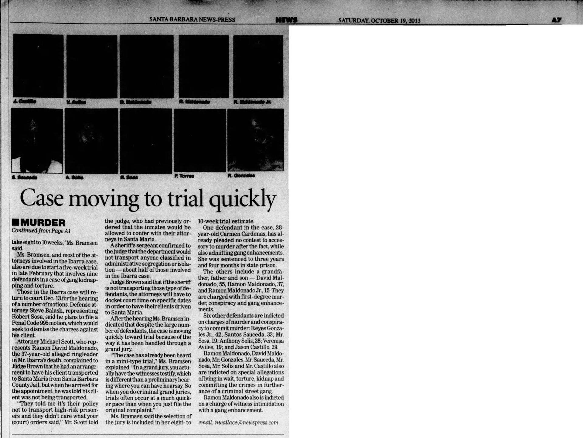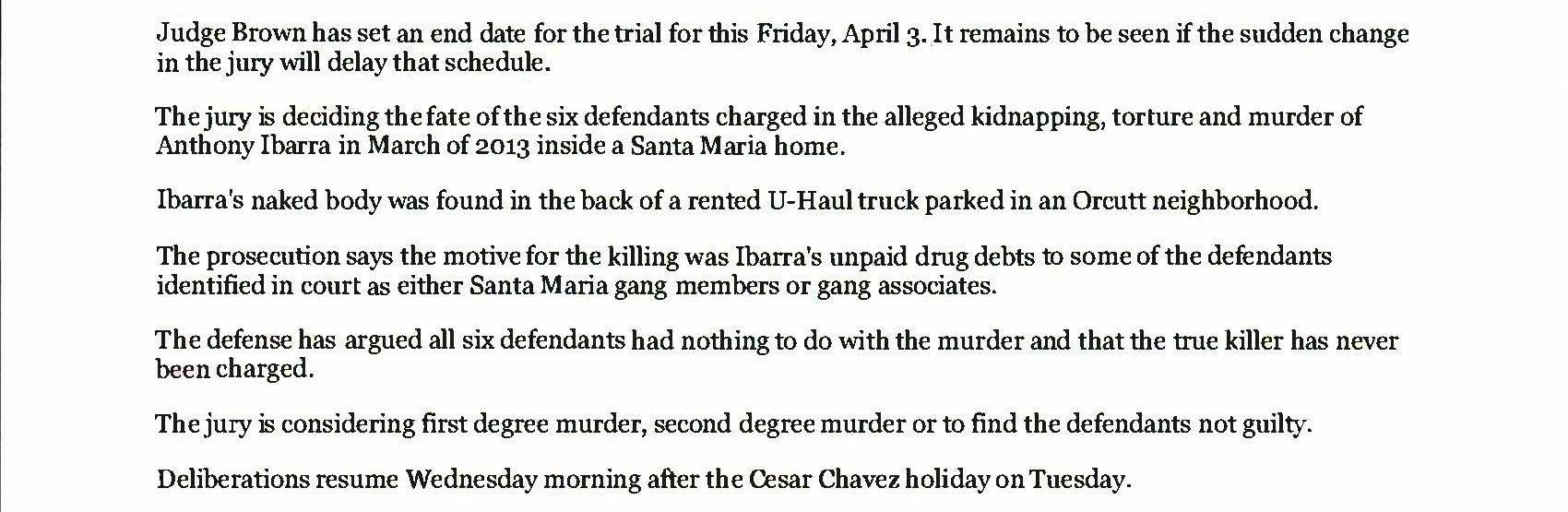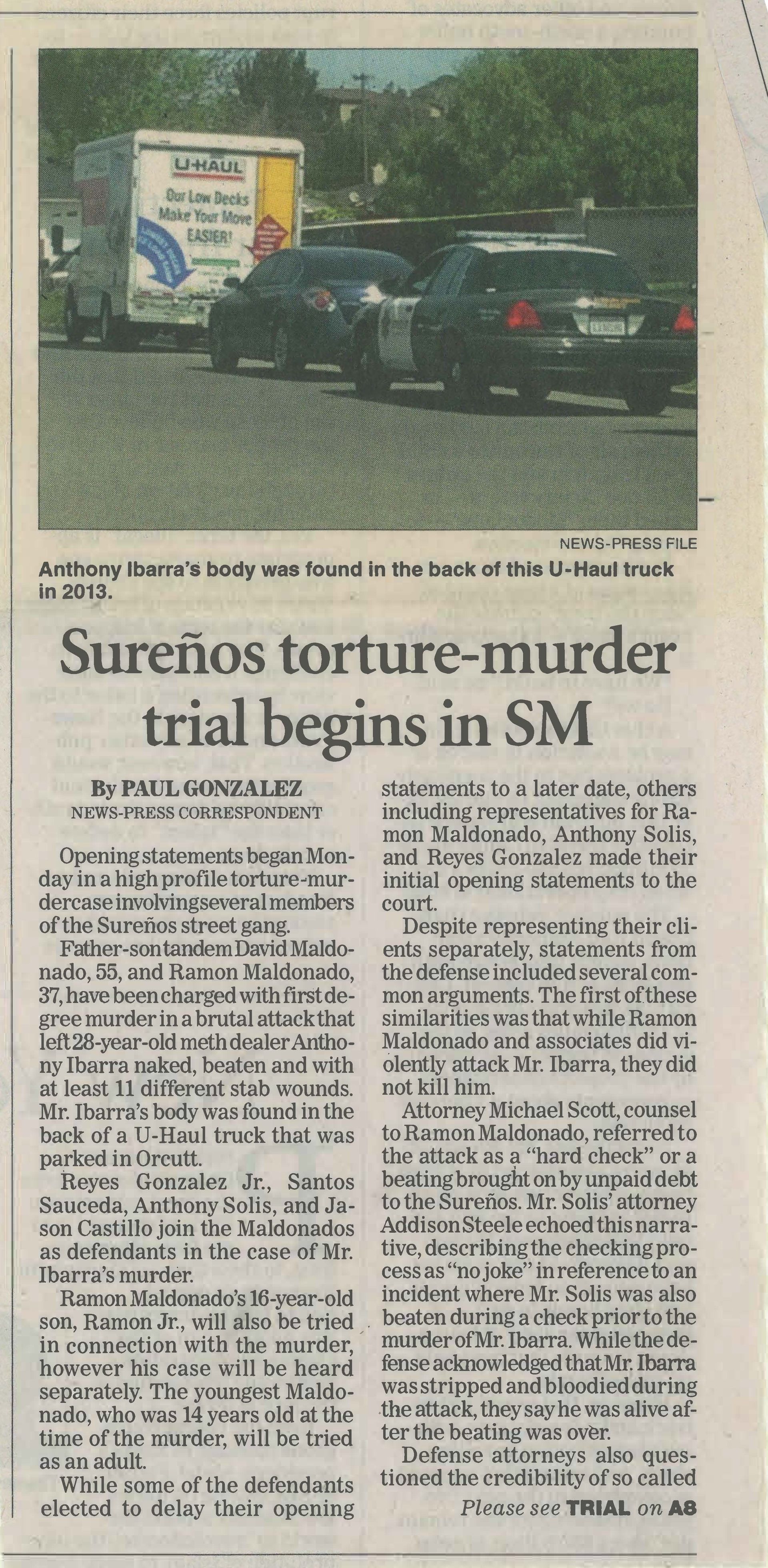 This was a particularly long and grueling murder trial. The press dubbed the case "The U-Haul Murder Trial" because the decedent's body was discovered in an abandoned U-Haul truck with his blood dripping out of the back of the truck. There were originally 13 co-defendants, not all of which were charged with murder. The plea negotiations parred it down to six co-defendants, all charged with murder, all with special circumstances that included torture and gang murder. All six defendants were facing LWOPP sentences. It was largest number of co-defendants in a murder trial ever in Santa Barbara County, and probably the state. There wasn't a courtroom in the county large enough for the trial. The largest courtroom in the county is at the Juvenile Court in Santa Maria, however it didn't have a jury box because juveniles do not have a right to a jury trial. The courtroom was modified by having a jury box built in it. However, even that was far too small for jury selection because of the several hundreds of prospective jurors would need to be called.