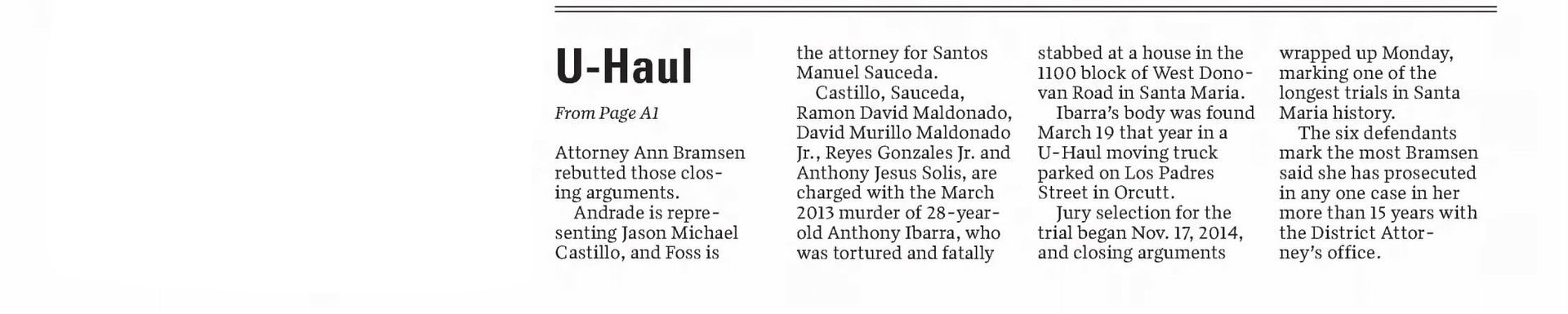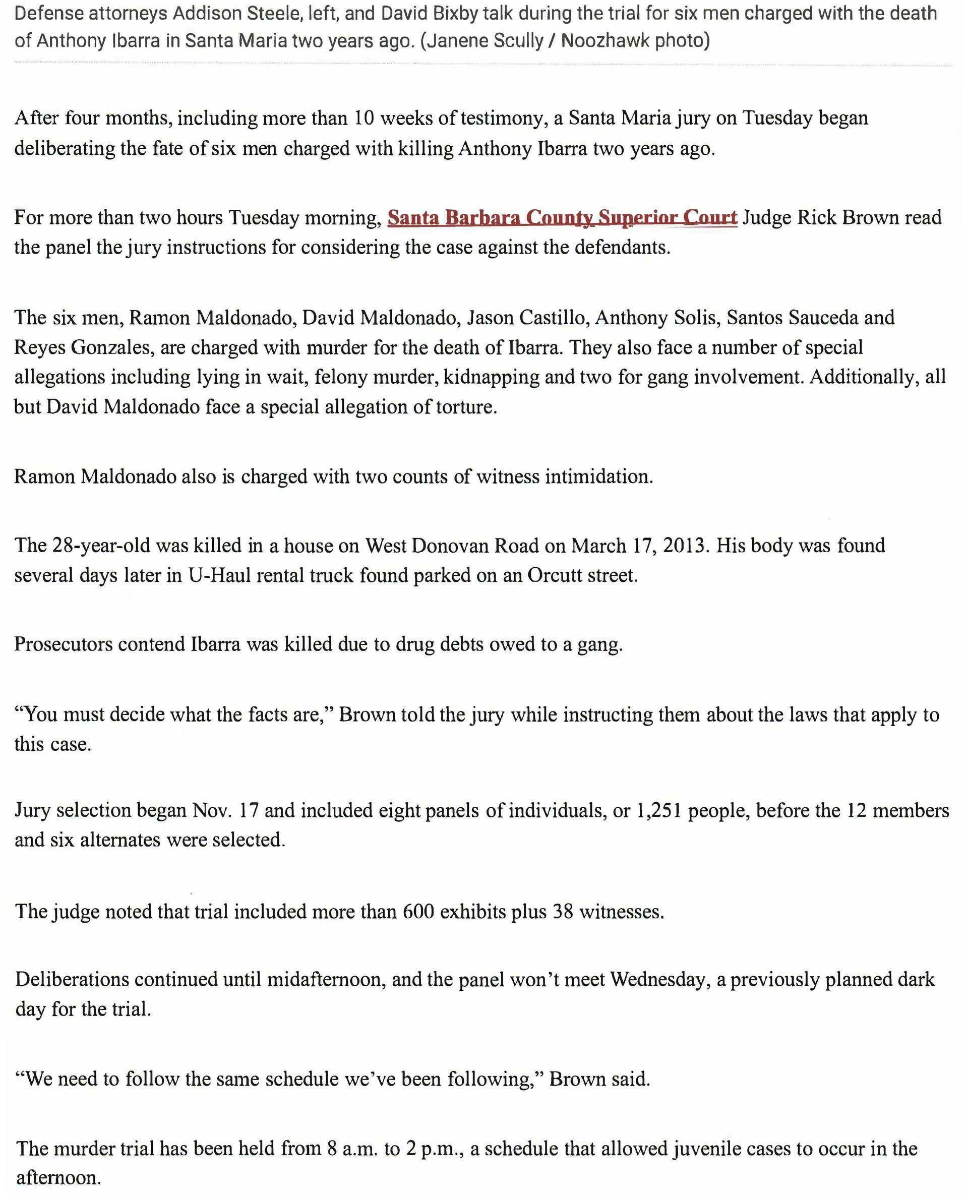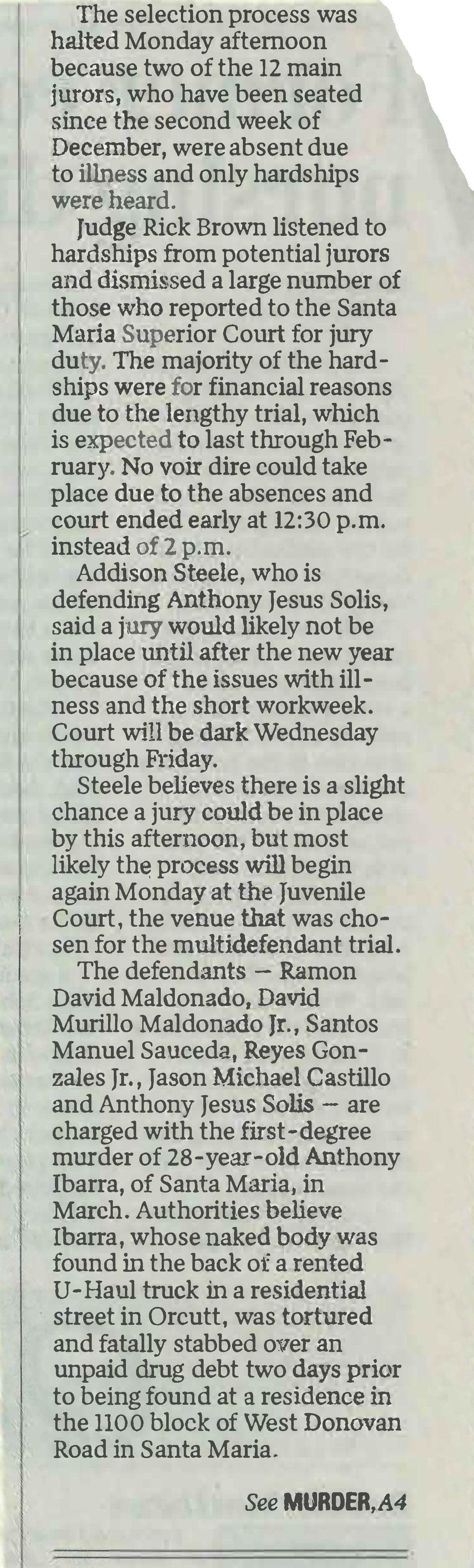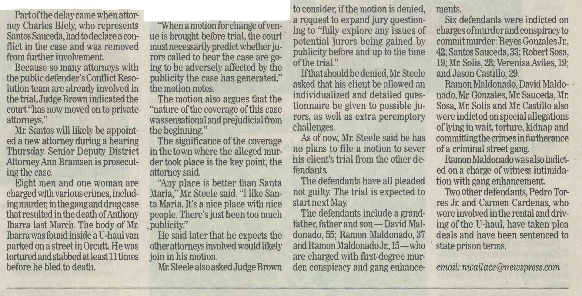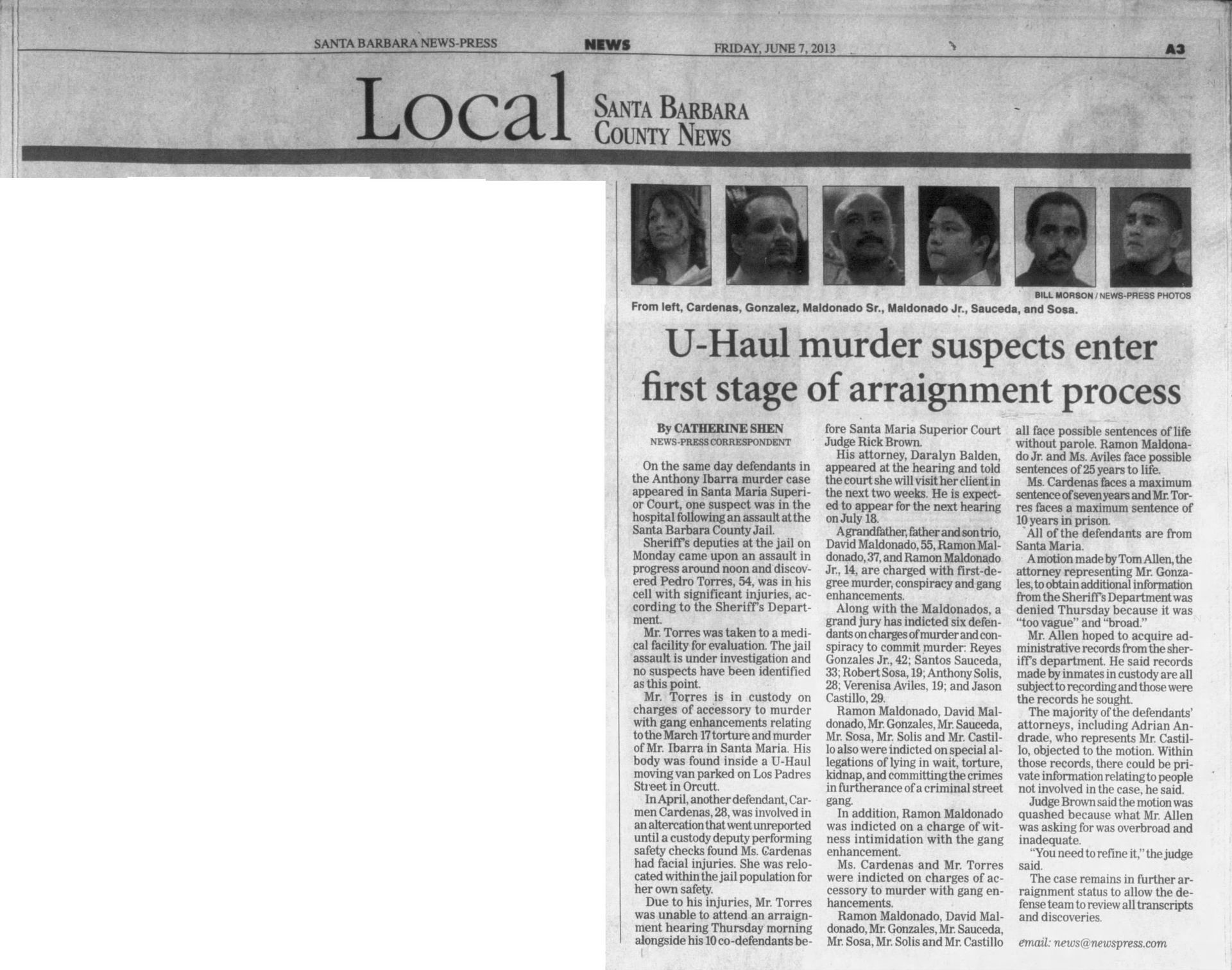 This was a particularly long and grueling murder trial. The press dubbed the case "The U-Haul Murder Trial" because the decedent's body was discovered in an abandoned U-Haul truck with his blood dripping out of the back of the truck. There were originally 13 co-defendants, not all of which were charged with murder. The plea negotiations parred it down to six co-defendants, all charged with murder, all with special circumstances that included torture and gang murder. All six defendants were facing LWOPP sentences. It was largest number of co-defendants in a murder trial ever in Santa Barbara County, and probably the state. There wasn't a courtroom in the county large enough for the trial. The largest courtroom in the county is at the Juvenile Court in Santa Maria, however it didn't have a jury box because juveniles do not have a right to a jury trial. The courtroom was modified by having a jury box built in it. However, even that was far too small for jury selection because of the several hundreds of prospective jurors would need to be called.