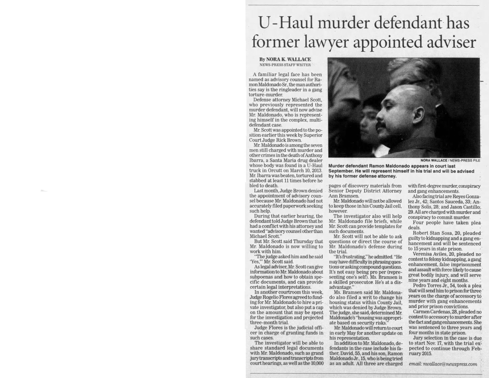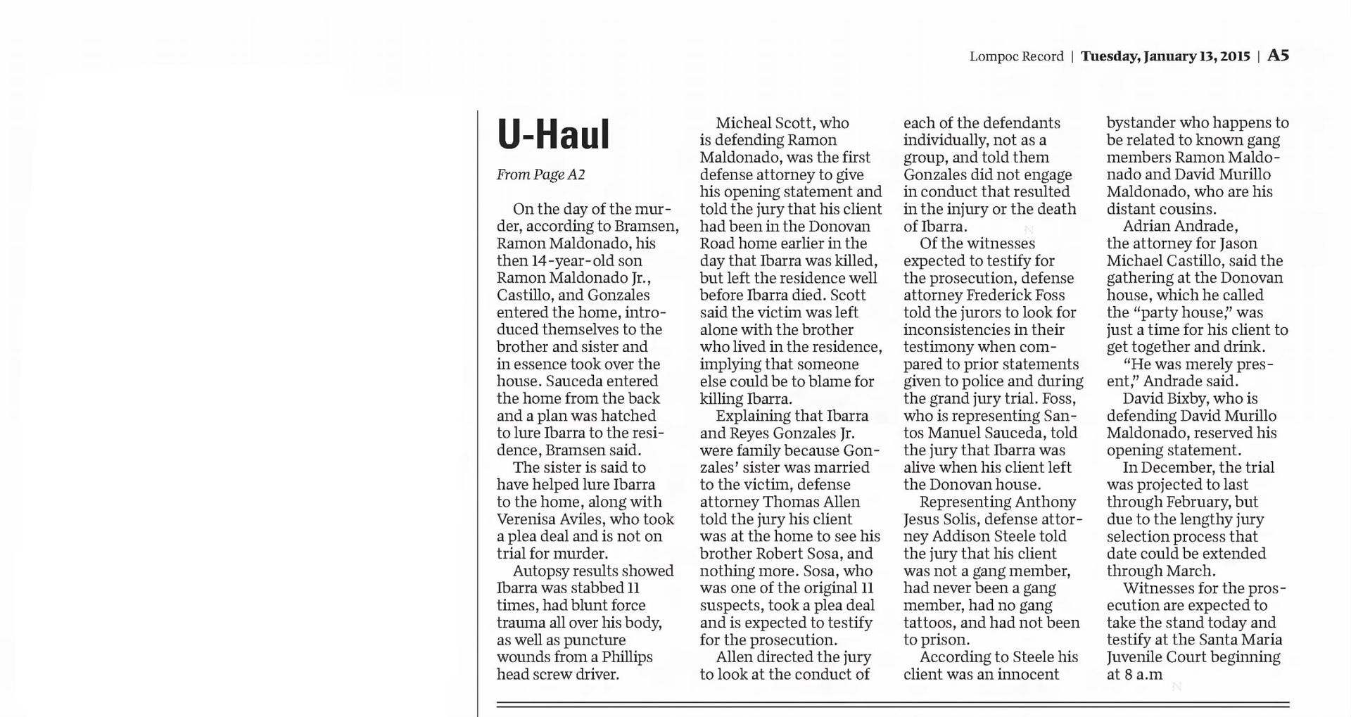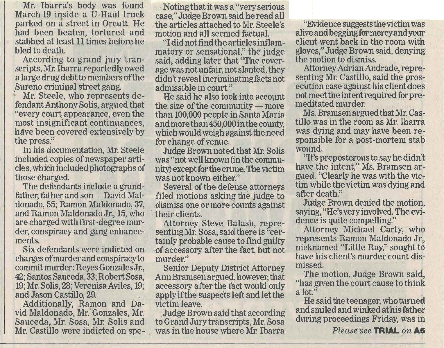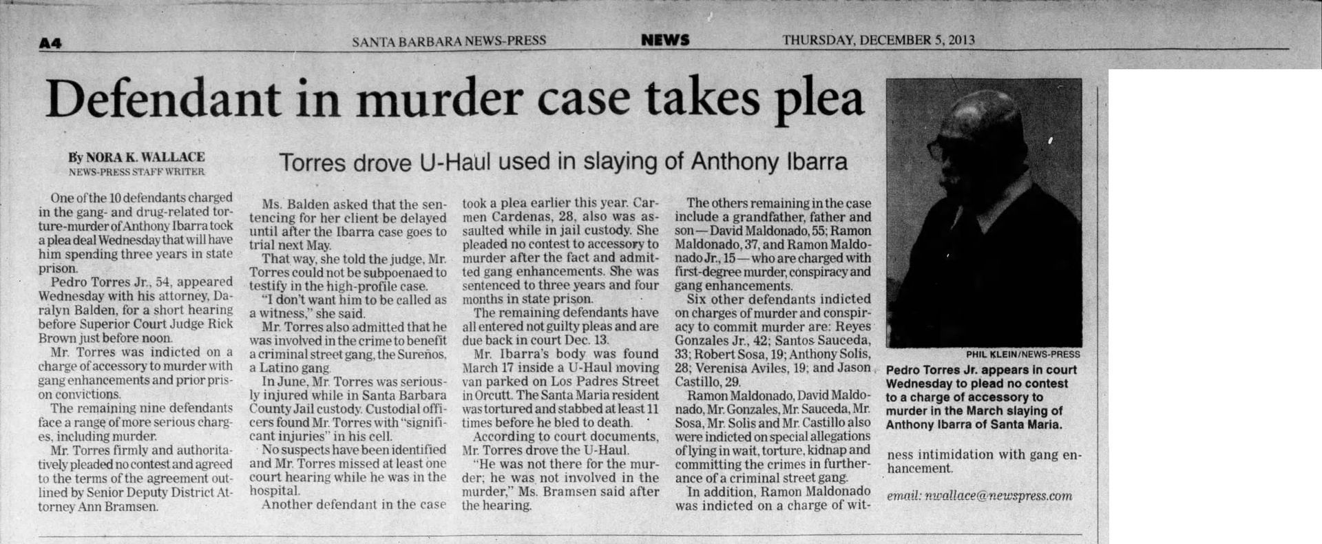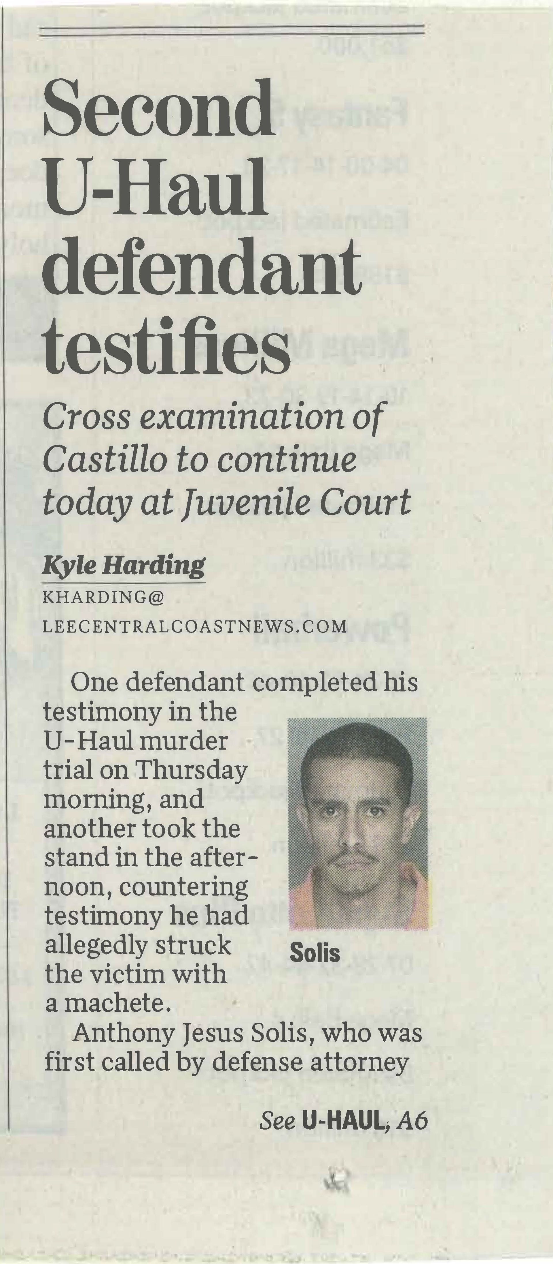 This was a particularly long and grueling murder trial. The press dubbed the case "The U-Haul Murder Trial" because the decedent's body was discovered in an abandoned U-Haul truck with his blood dripping out of the back of the truck. There were originally 13 co-defendants, not all of which were charged with murder. The plea negotiations parred it down to six co-defendants, all charged with murder, all with special circumstances that included torture and gang murder. All six defendants were facing LWOPP sentences. It was largest number of co-defendants in a murder trial ever in Santa Barbara County, and probably the state. There wasn't a courtroom in the county large enough for the trial. The largest courtroom in the county is at the Juvenile Court in Santa Maria, however it didn't have a jury box because juveniles do not have a right to a jury trial. The courtroom was modified by having a jury box built in it. However, even that was far too small for jury selection because of the several hundreds of prospective jurors would need to be called.