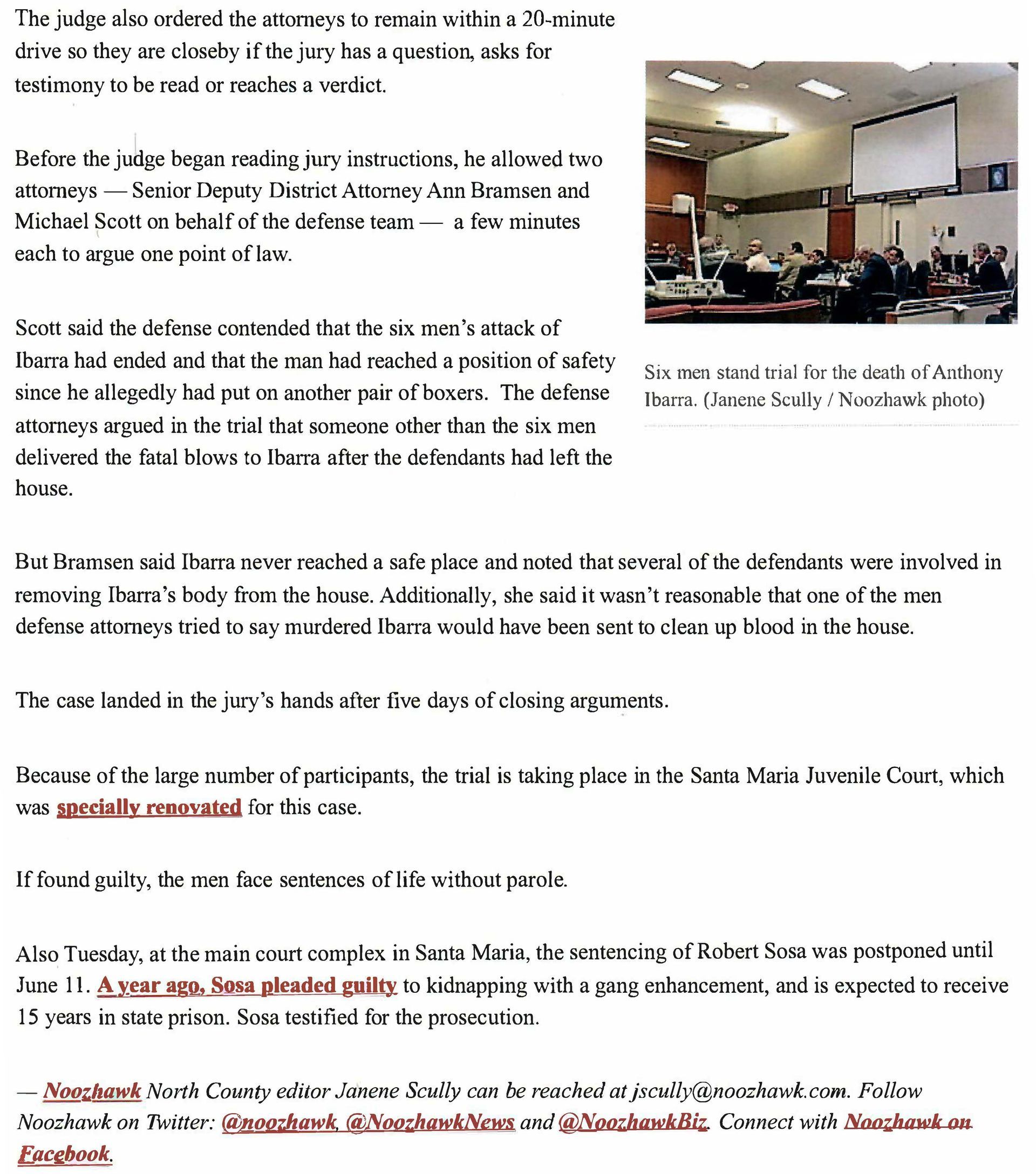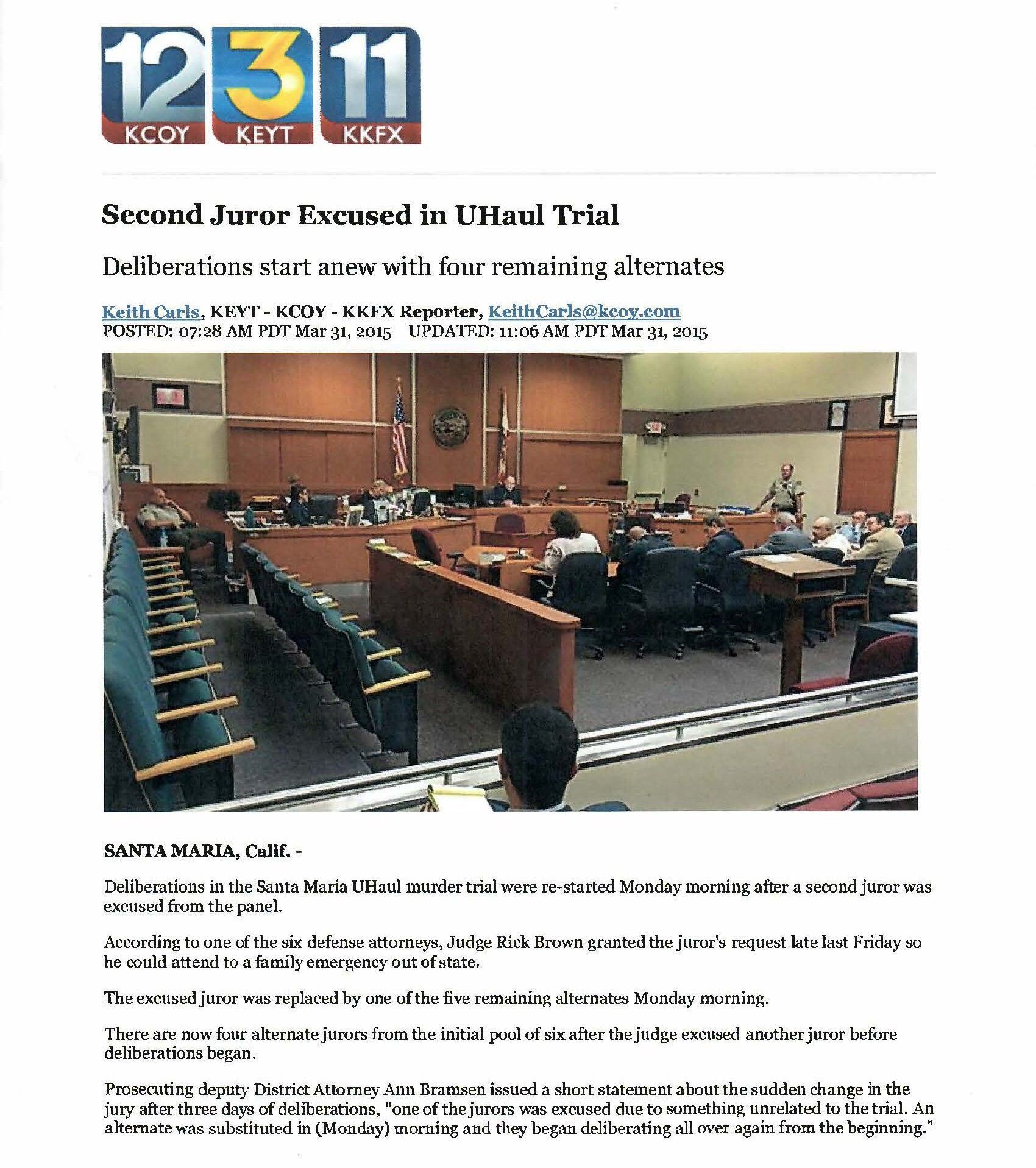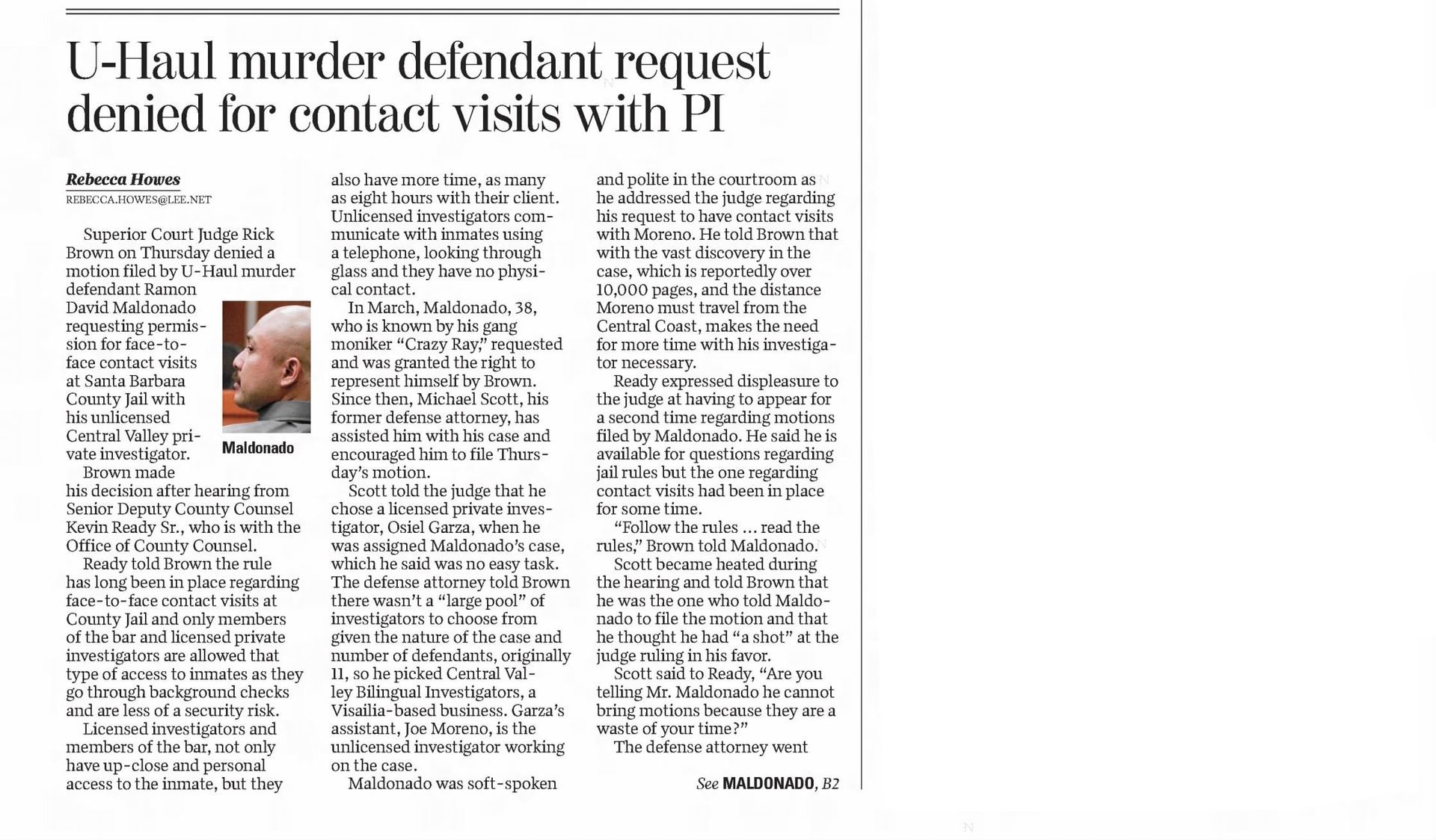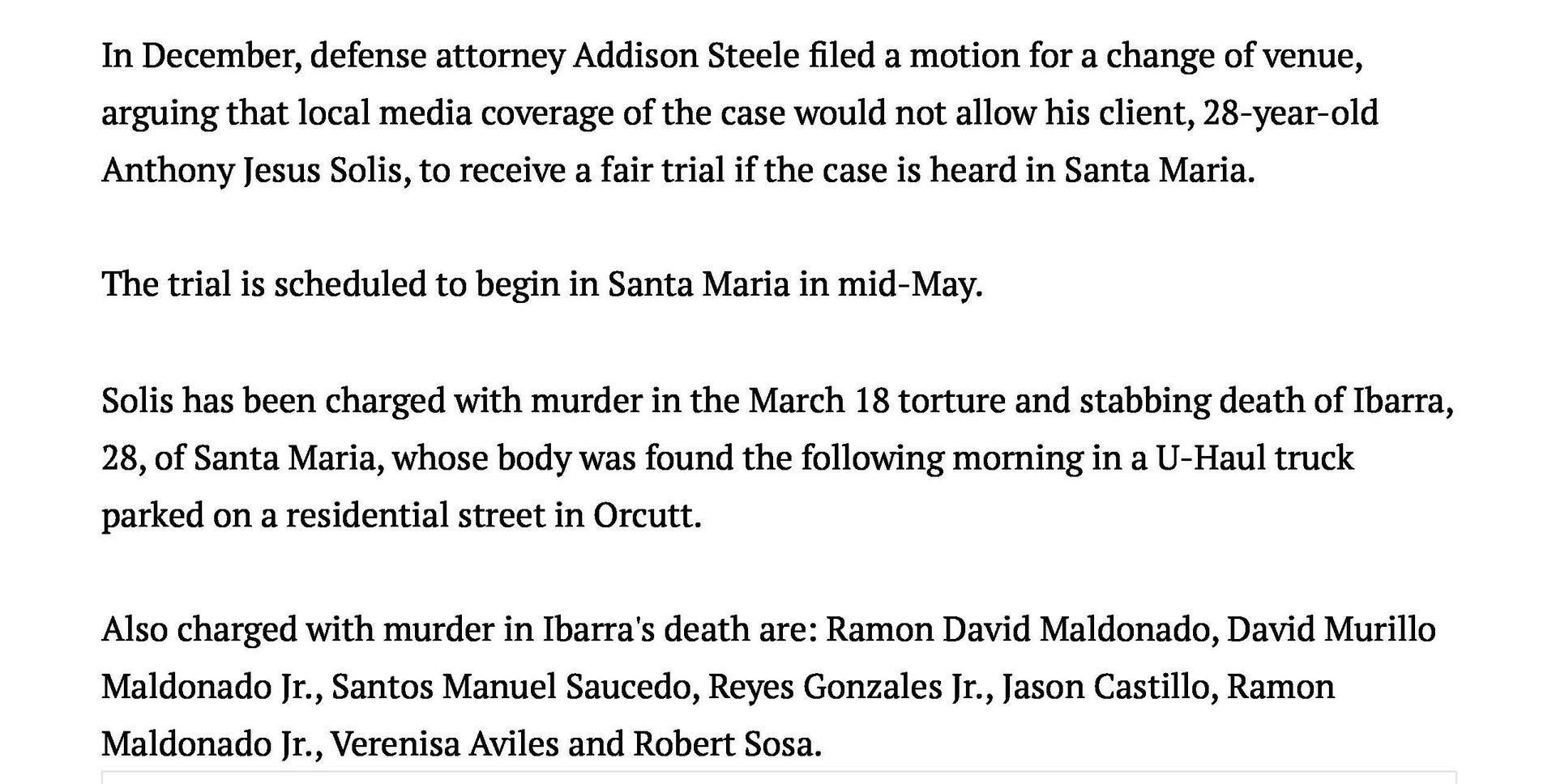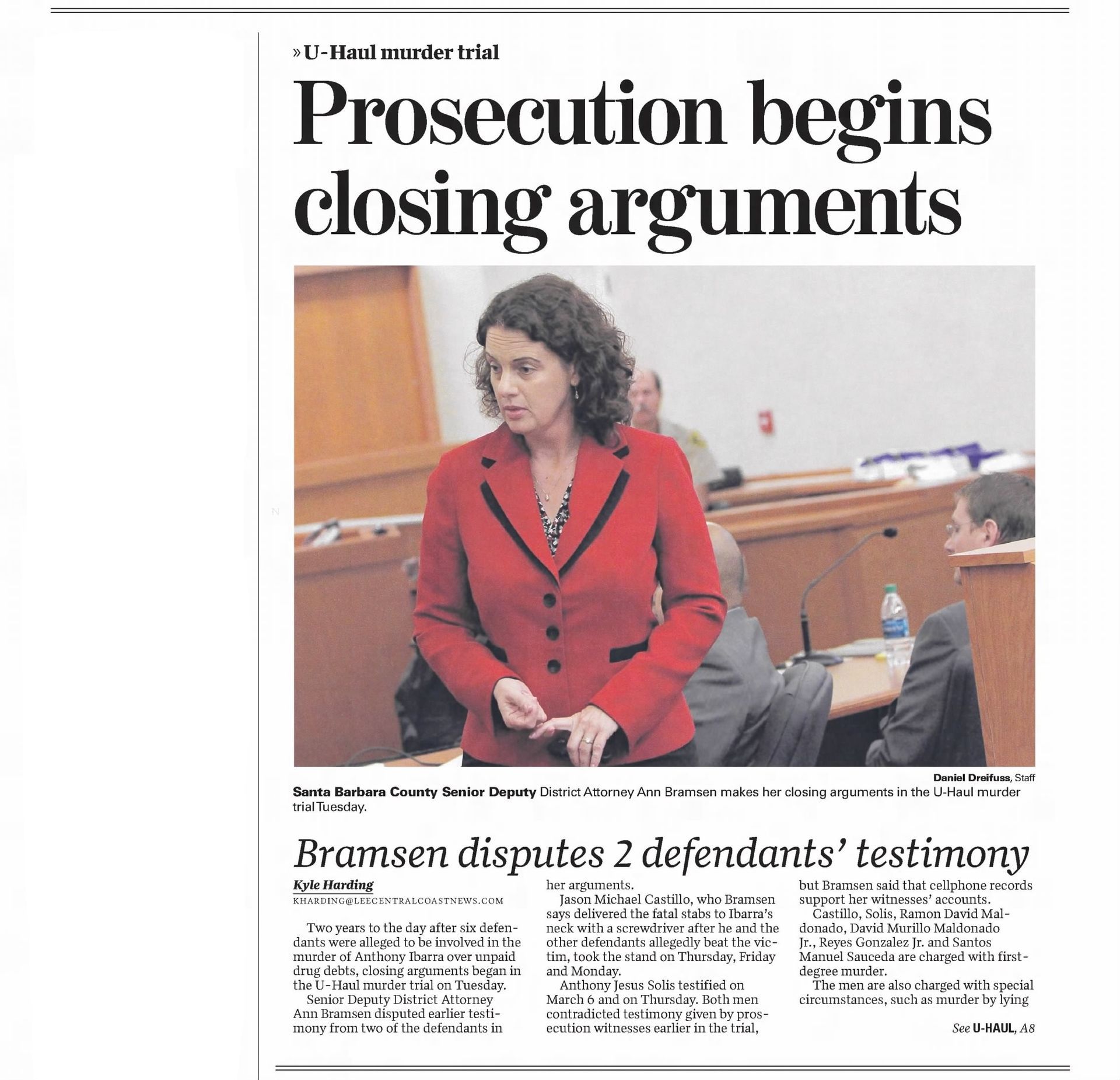 This was a particularly long and grueling murder trial. The press dubbed the case "The U-Haul Murder Trial" because the decedent's body was discovered in an abandoned U-Haul truck with his blood dripping out of the back of the truck. There were originally 13 co-defendants, not all of which were charged with murder. The plea negotiations parred it down to six co-defendants, all charged with murder, all with special circumstances that included torture and gang murder. All six defendants were facing LWOPP sentences. It was largest number of co-defendants in a murder trial ever in Santa Barbara County, and probably the state. There wasn't a courtroom in the county large enough for the trial. The largest courtroom in the county is at the Juvenile Court in Santa Maria, however it didn't have a jury box because juveniles do not have a right to a jury trial. The courtroom was modified by having a jury box built in it. However, even that was far too small for jury selection because of the several hundreds of prospective jurors would need to be called.