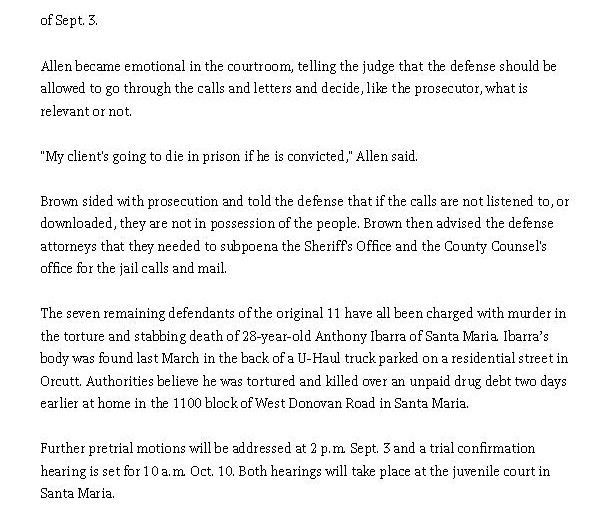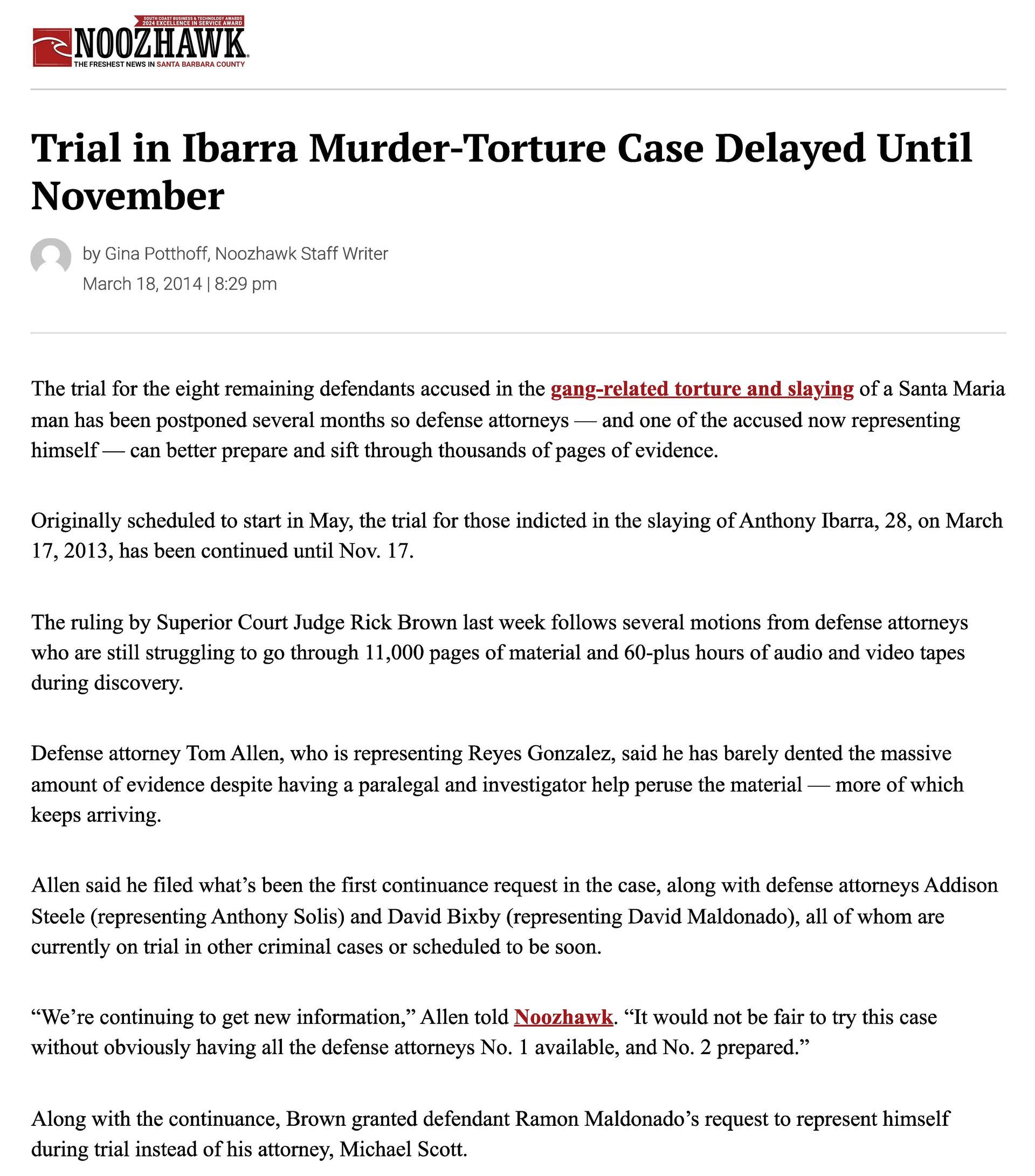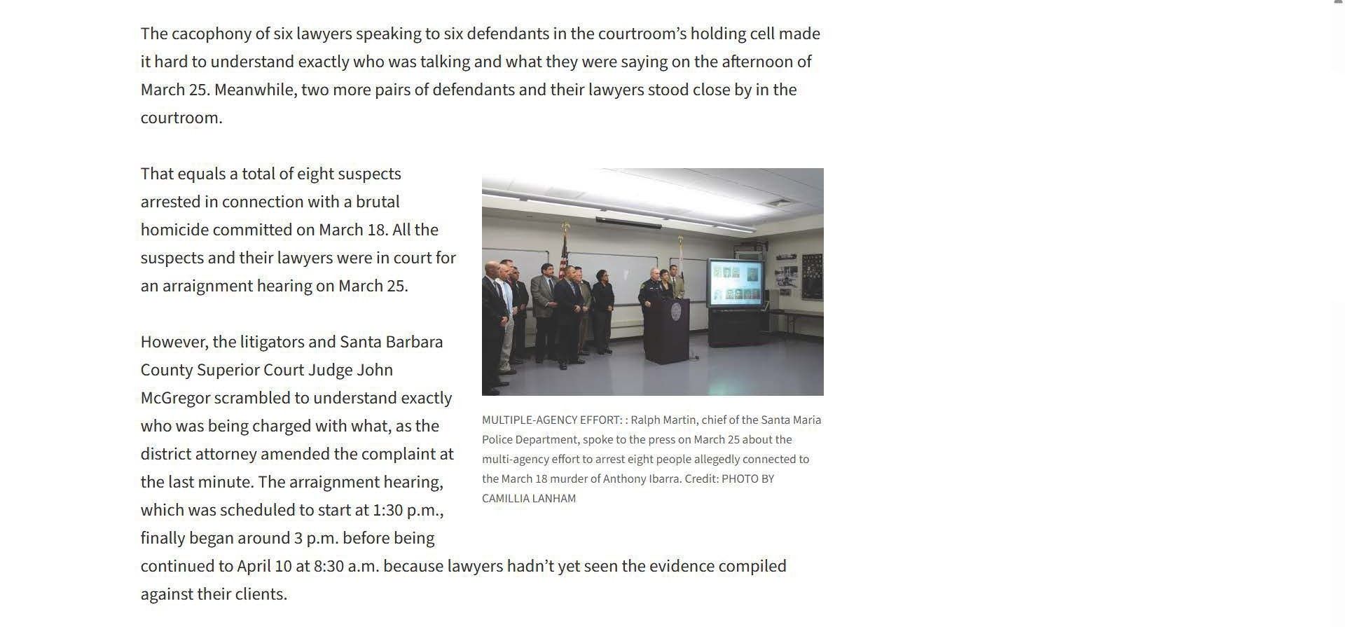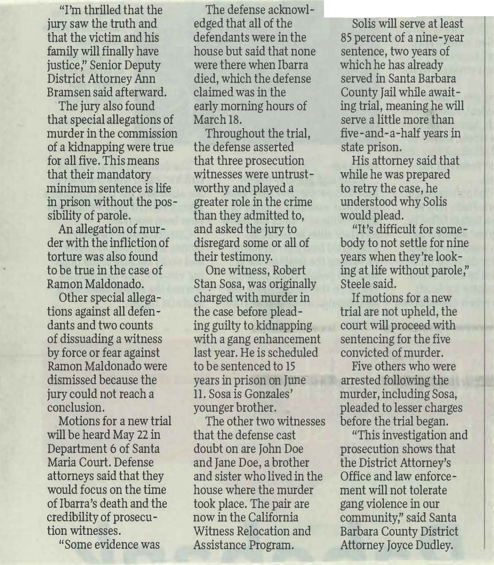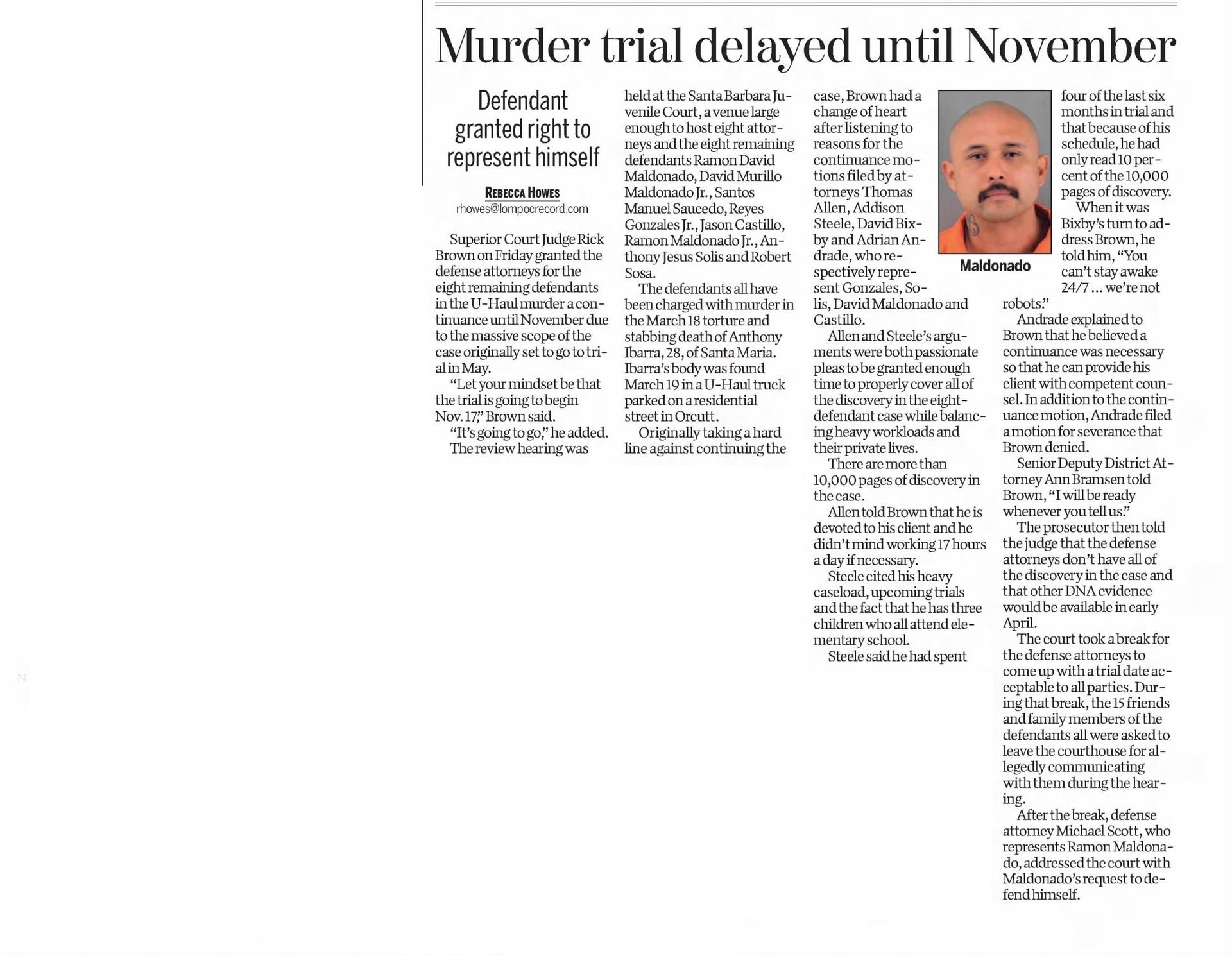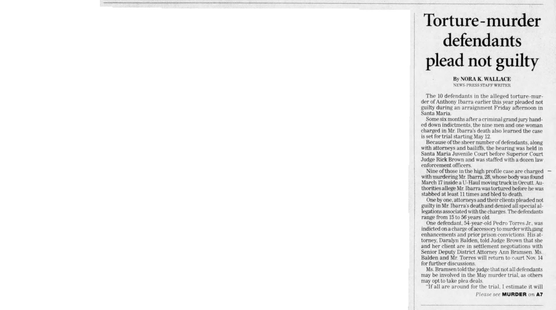 This was a particularly long and grueling murder trial. The press dubbed the case "The U-Haul Murder Trial" because the decedent's body was discovered in an abandoned U-Haul truck with his blood dripping out of the back of the truck. There were originally 13 co-defendants, not all of which were charged with murder. The plea negotiations parred it down to six co-defendants, all charged with murder, all with special circumstances that included torture and gang murder. All six defendants were facing LWOPP sentences. It was largest number of co-defendants in a murder trial ever in Santa Barbara County, and probably the state. There wasn't a courtroom in the county large enough for the trial. The largest courtroom in the county is at the Juvenile Court in Santa Maria, however it didn't have a jury box because juveniles do not have a right to a jury trial. The courtroom was modified by having a jury box built in it. However, even that was far too small for jury selection because of the several hundreds of prospective jurors would need to be called.