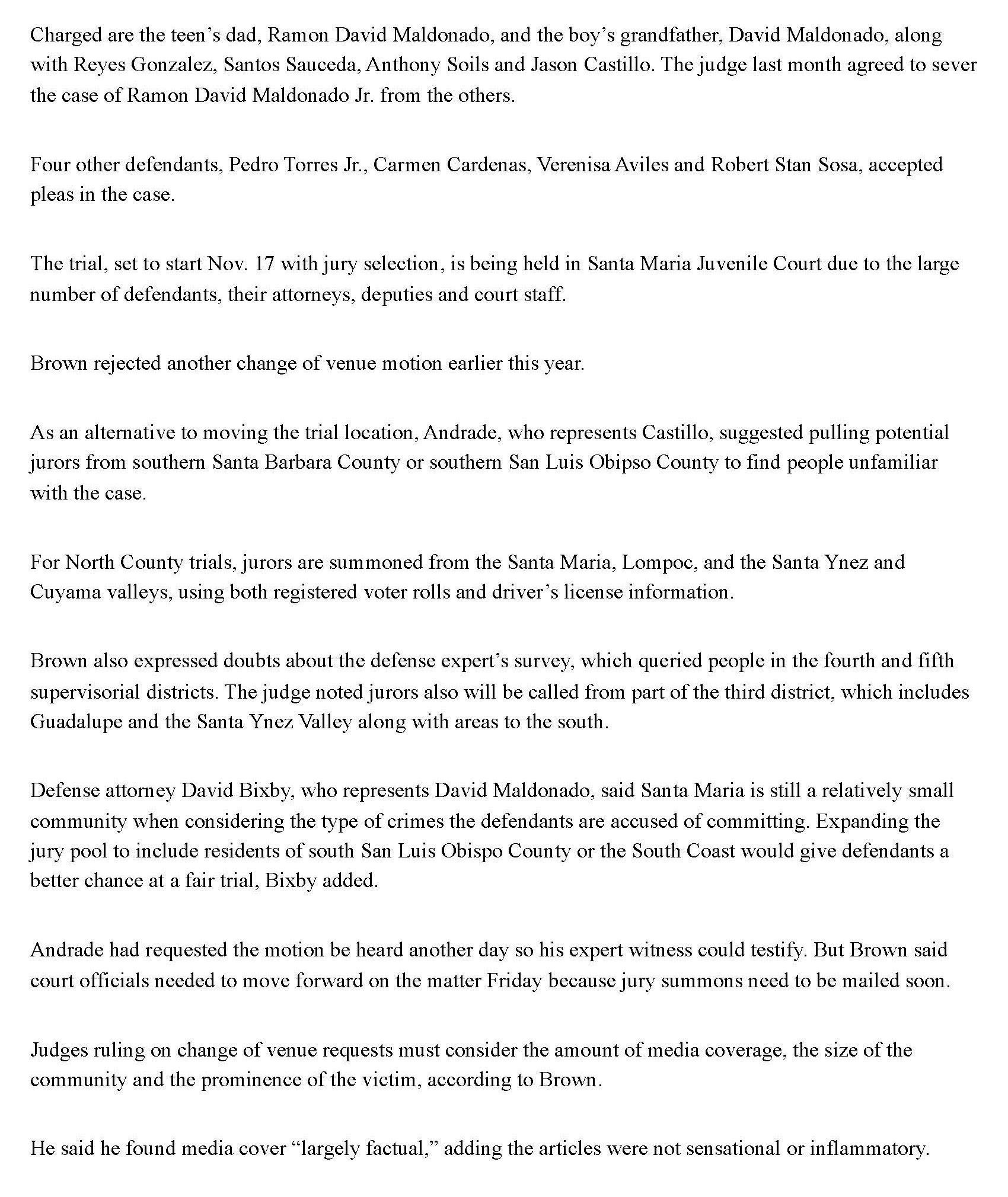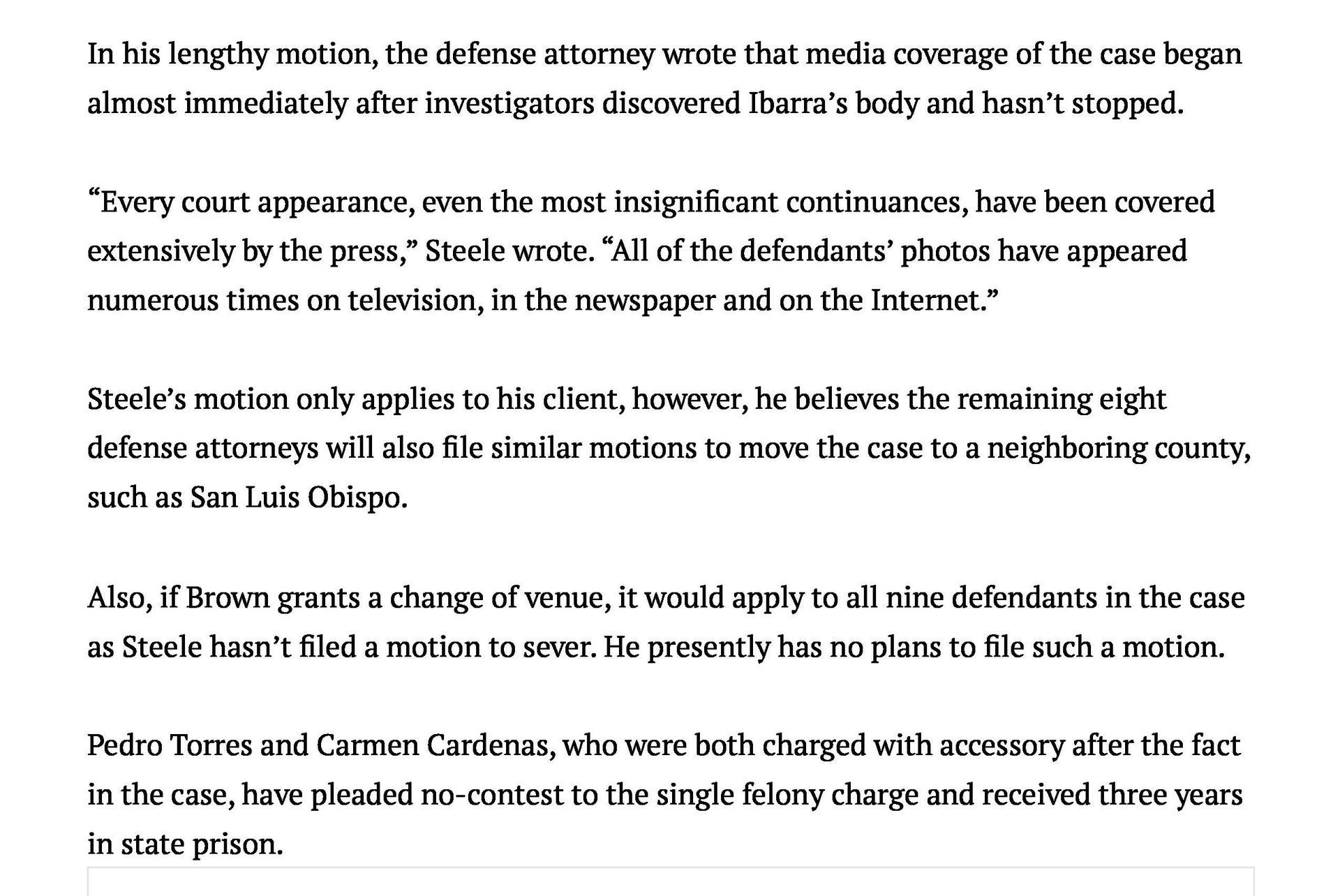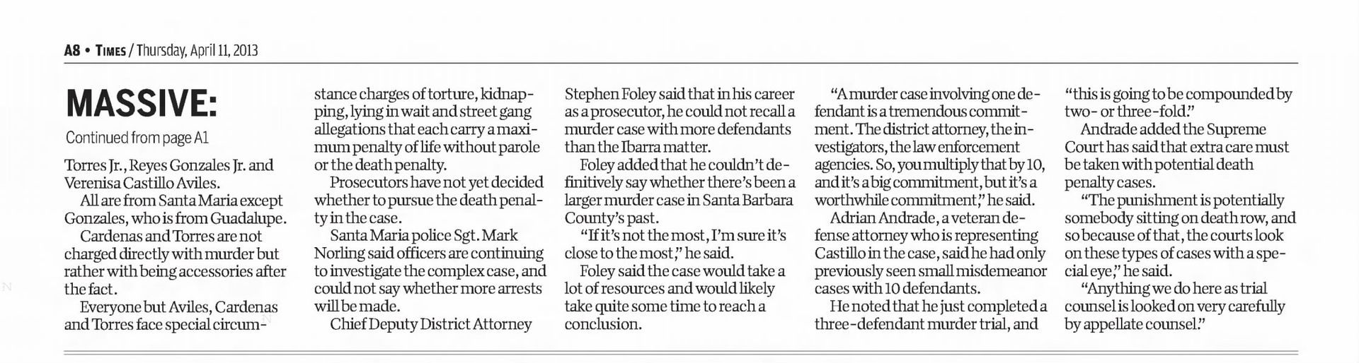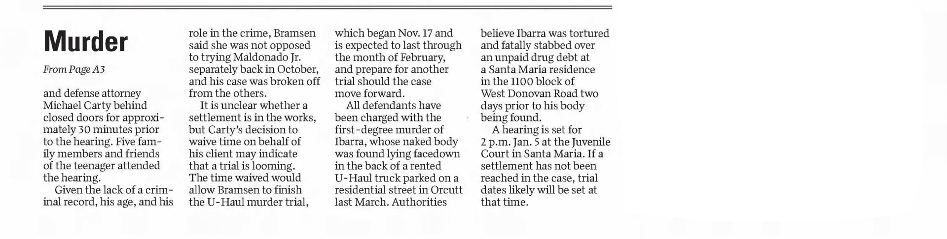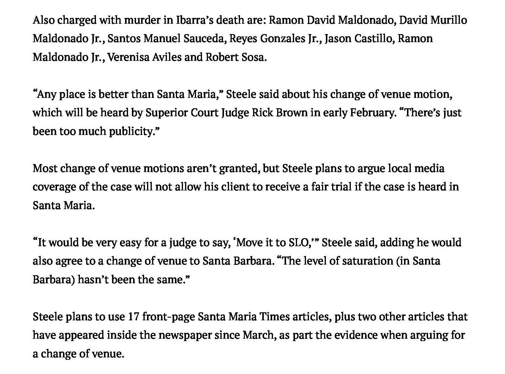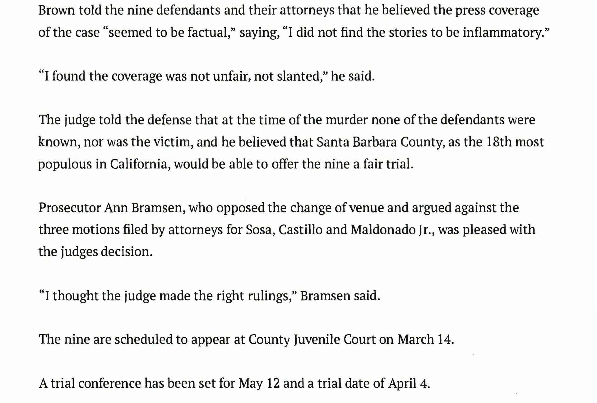 This was a particularly long and grueling murder trial. The press dubbed the case "The U-Haul Murder Trial" because the decedent's body was discovered in an abandoned U-Haul truck with his blood dripping out of the back of the truck. There were originally 13 co-defendants, not all of which were charged with murder. The plea negotiations parred it down to six co-defendants, all charged with murder, all with special circumstances that included torture and gang murder. All six defendants were facing LWOPP sentences. It was largest number of co-defendants in a murder trial ever in Santa Barbara County, and probably the state. There wasn't a courtroom in the county large enough for the trial. The largest courtroom in the county is at the Juvenile Court in Santa Maria, however it didn't have a jury box because juveniles do not have a right to a jury trial. The courtroom was modified by having a jury box built in it. However, even that was far too small for jury selection because of the several hundreds of prospective jurors would need to be called.