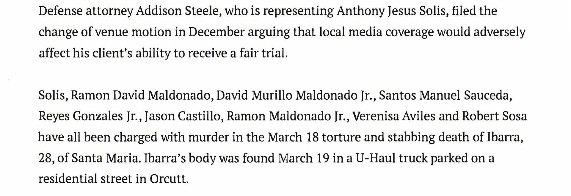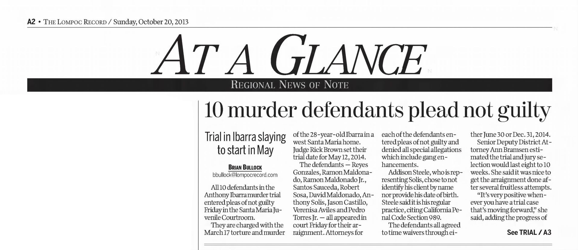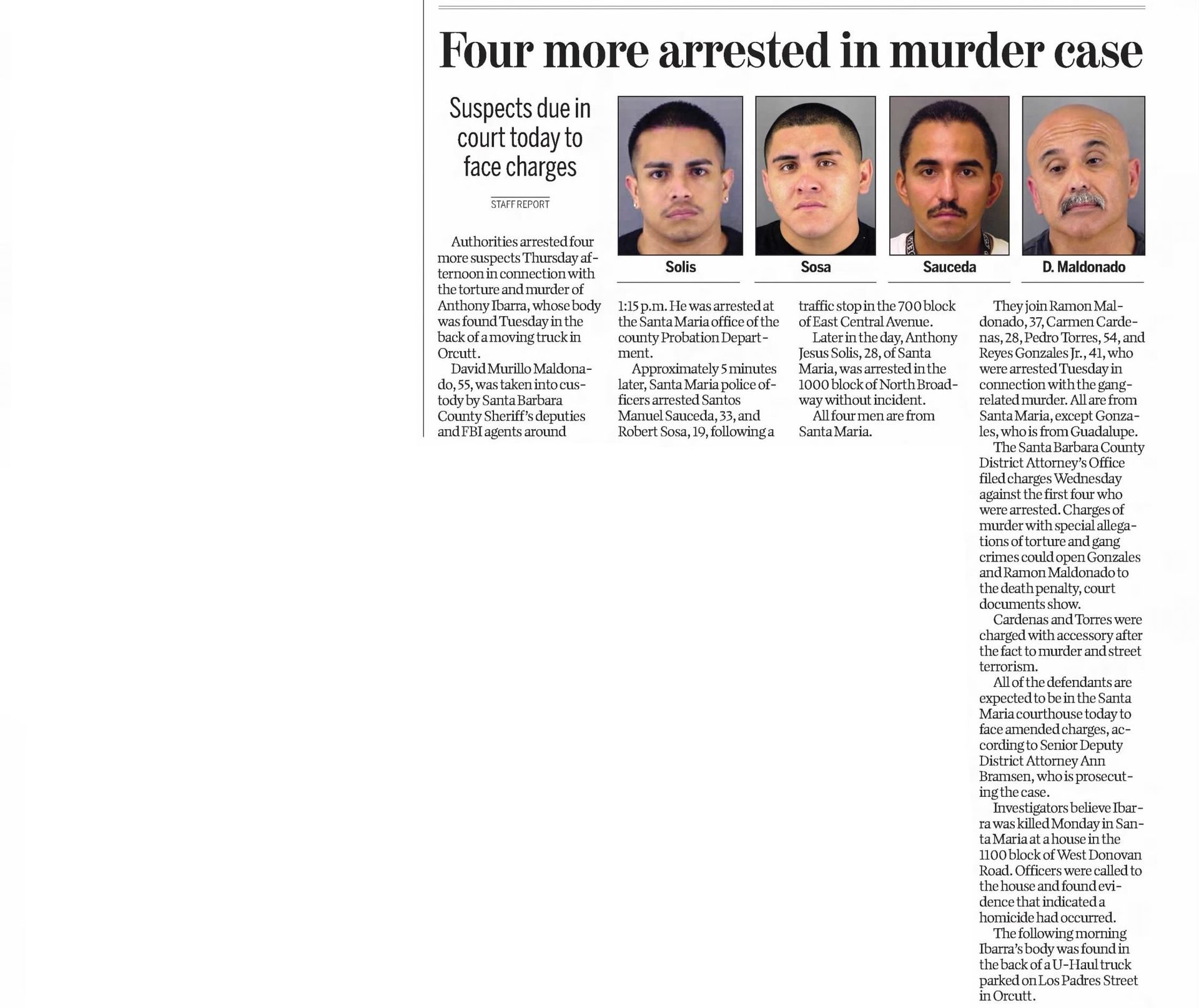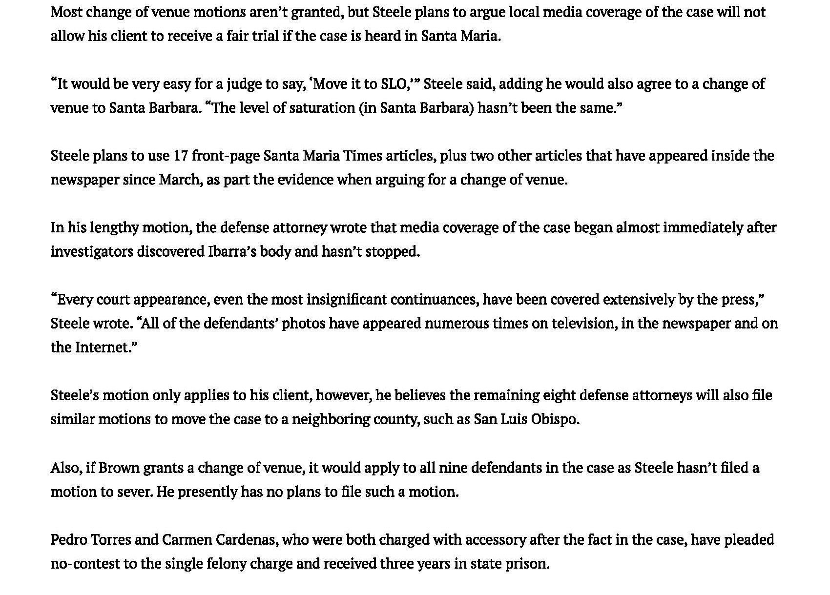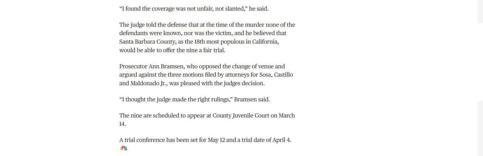 This was a particularly long and grueling murder trial. The press dubbed the case "The U-Haul Murder Trial" because the decedent's body was discovered in an abandoned U-Haul truck with his blood dripping out of the back of the truck. There were originally 13 co-defendants, not all of which were charged with murder. The plea negotiations parred it down to six co-defendants, all charged with murder, all with special circumstances that included torture and gang murder. All six defendants were facing LWOPP sentences. It was largest number of co-defendants in a murder trial ever in Santa Barbara County, and probably the state. There wasn't a courtroom in the county large enough for the trial. The largest courtroom in the county is at the Juvenile Court in Santa Maria, however it didn't have a jury box because juveniles do not have a right to a jury trial. The courtroom was modified by having a jury box built in it. However, even that was far too small for jury selection because of the several hundreds of prospective jurors would need to be called.