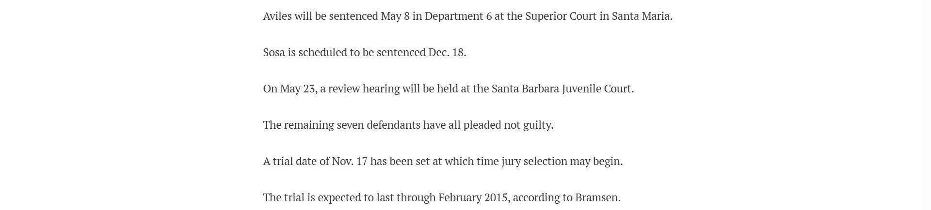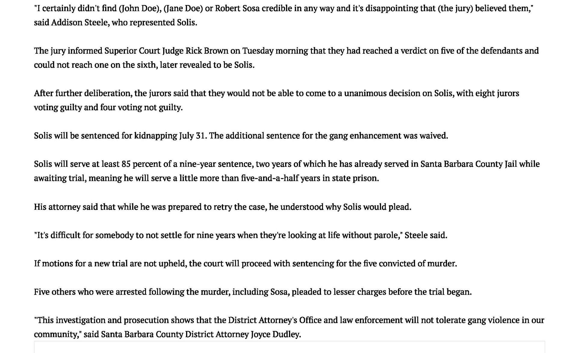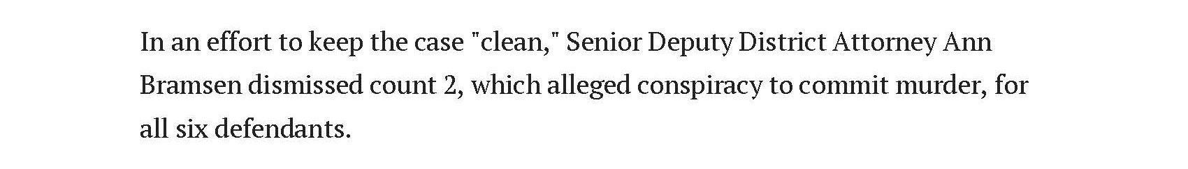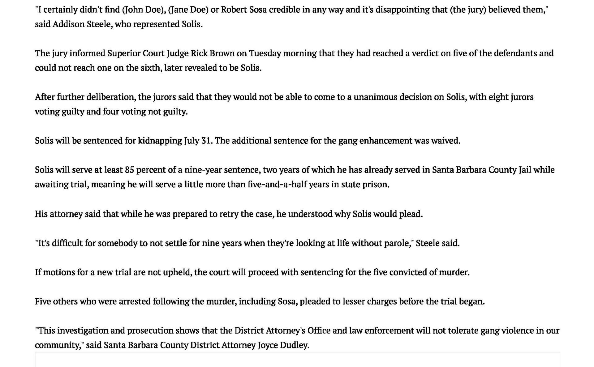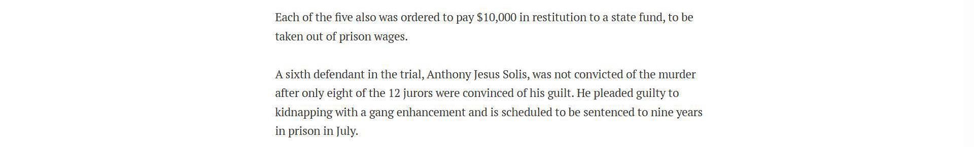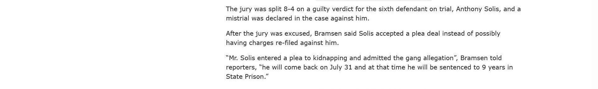 The jury found the other five co-defendants guilty and found at least one special circumstance true, which meant that they all would have mandatory LWOPP sentences. But that wasn't the case for A.J. It was a hung jury on all counts for A.J. It looked like A.J. and Addison were going to have to do the trial again. The risk was getting the same LWOPP sentence that his co-defendants got, but the potential gain was to maybe go home after a second trial. In the end A.J. resolved the case for a plea to kidnapping and nine years in prison, but it had taken so long to get to trial that he had almost half of that already served. A.J. is home now. He's the only one of the six that's home.