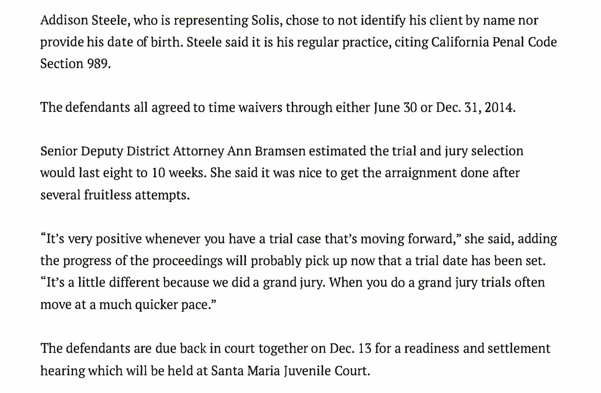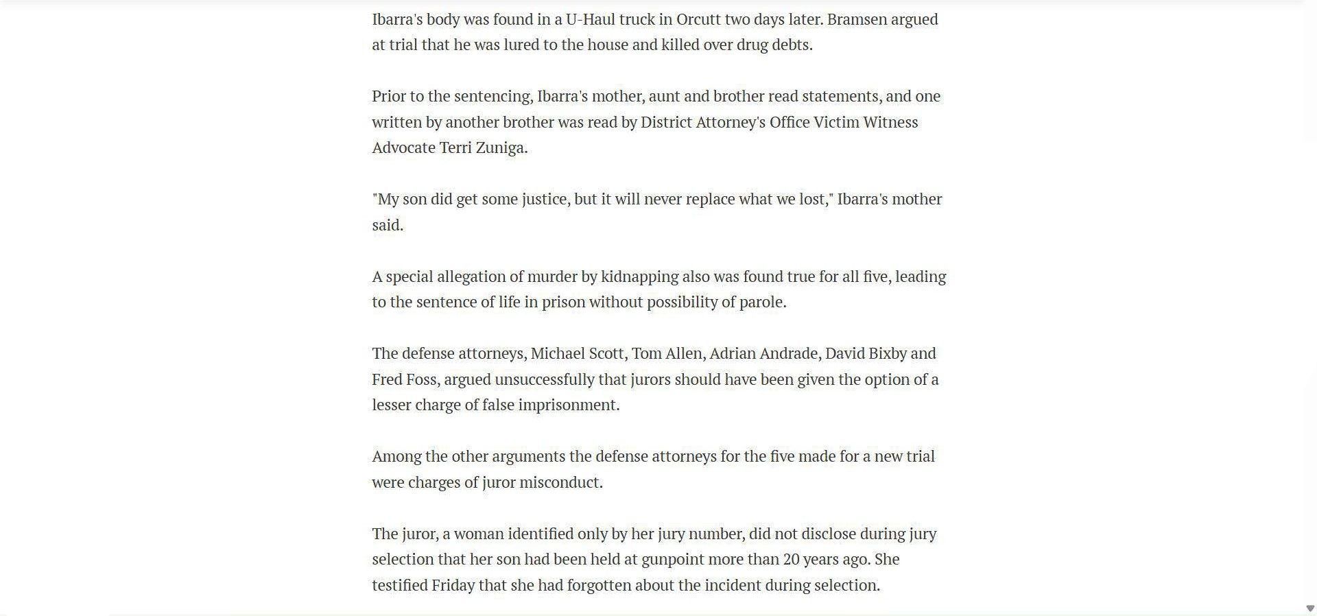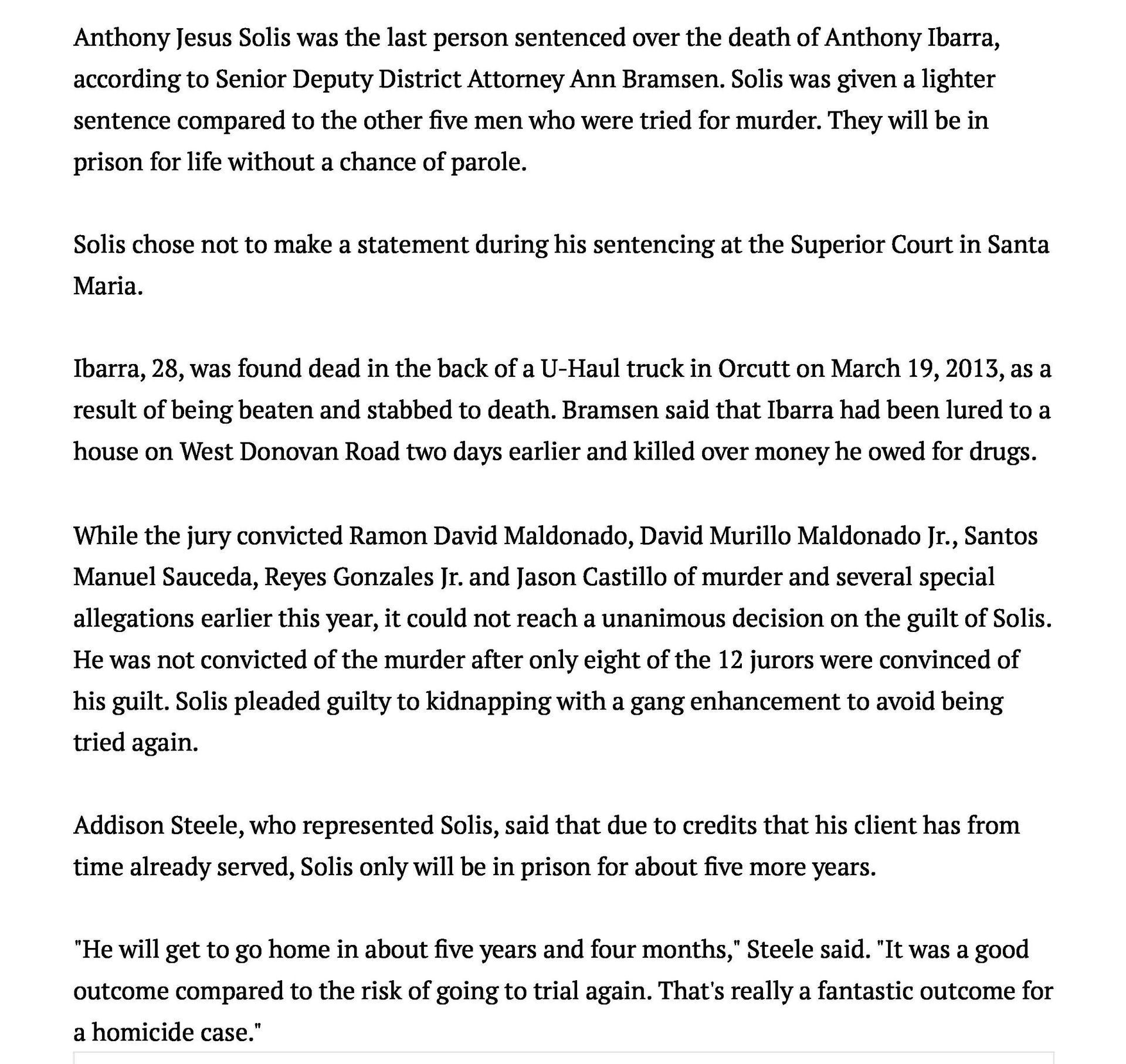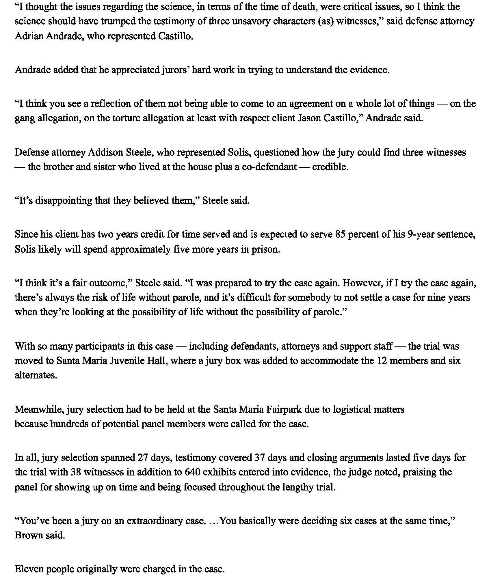 The jury found the other five co-defendants guilty and found at least one special circumstance true, which meant that they all would have mandatory LWOPP sentences. But that wasn't the case for A.J. It was a hung jury on all counts for A.J. It looked like A.J. and Addison were going to have to do the trial again. The risk was getting the same LWOPP sentence that his co-defendants got, but the potential gain was to maybe go home after a second trial. In the end A.J. resolved the case for a plea to kidnapping and nine years in prison, but it had taken so long to get to trial that he had almost half of that already served. A.J. is home now. He's the only one of the six that's home.