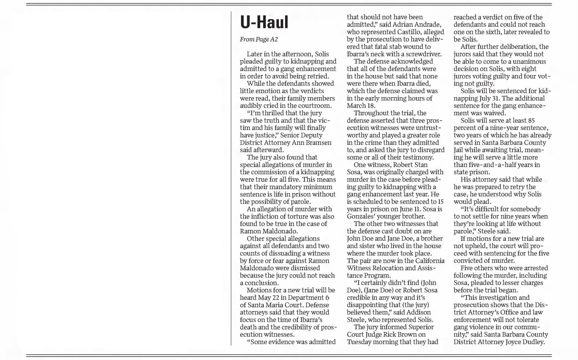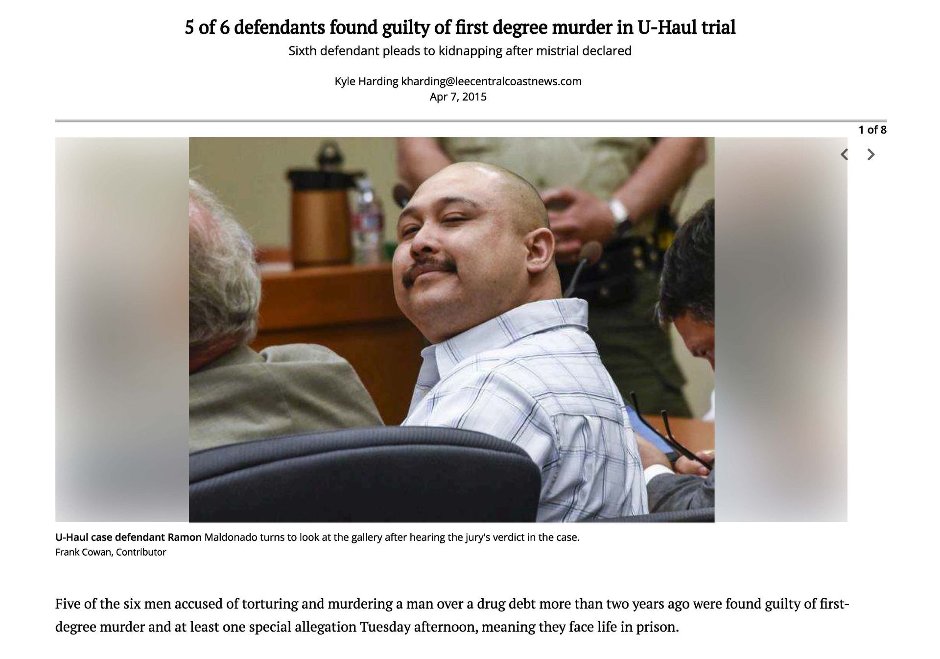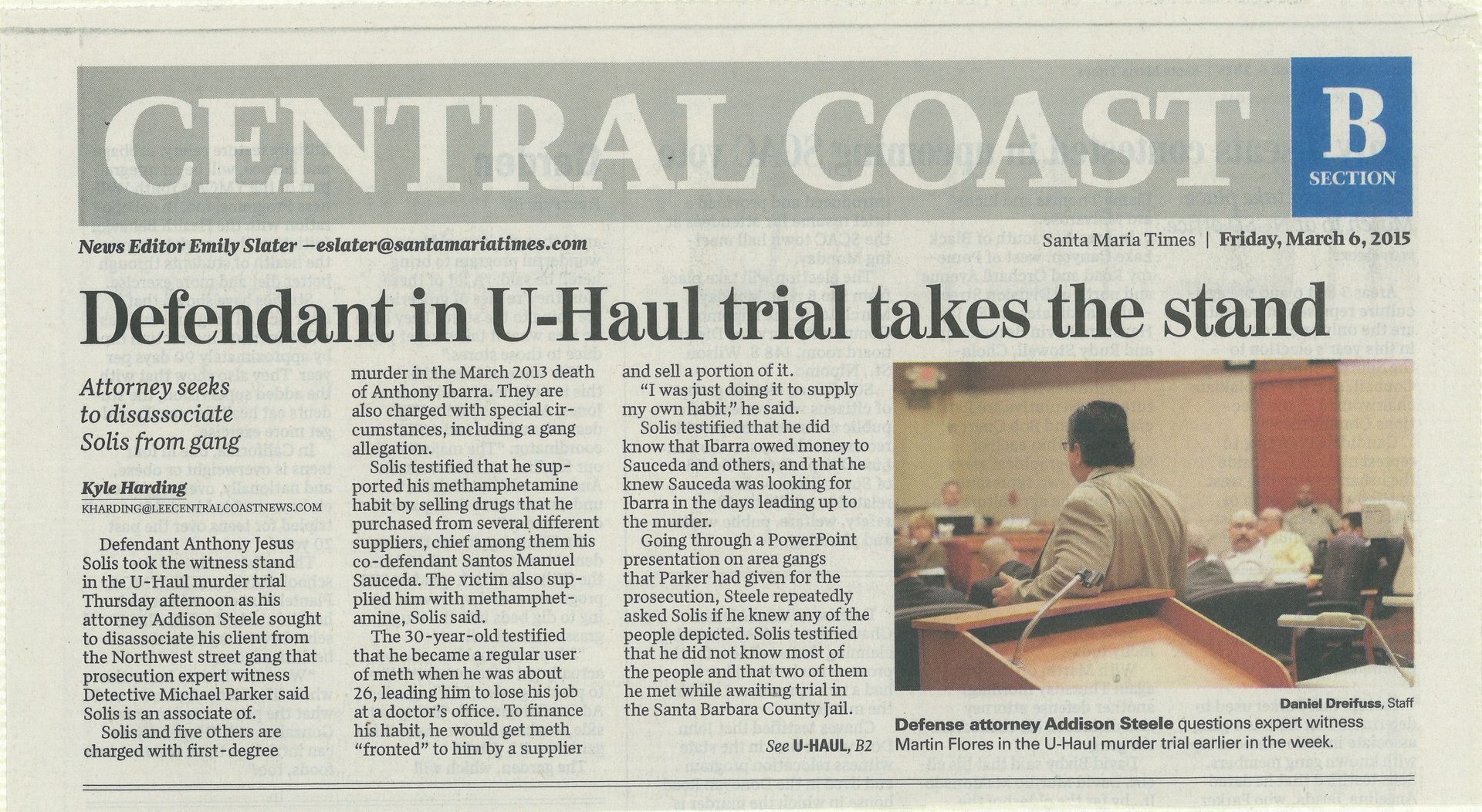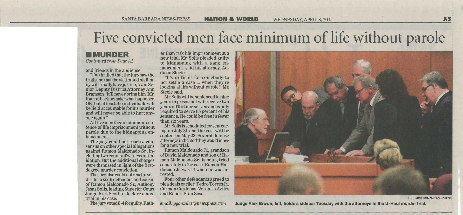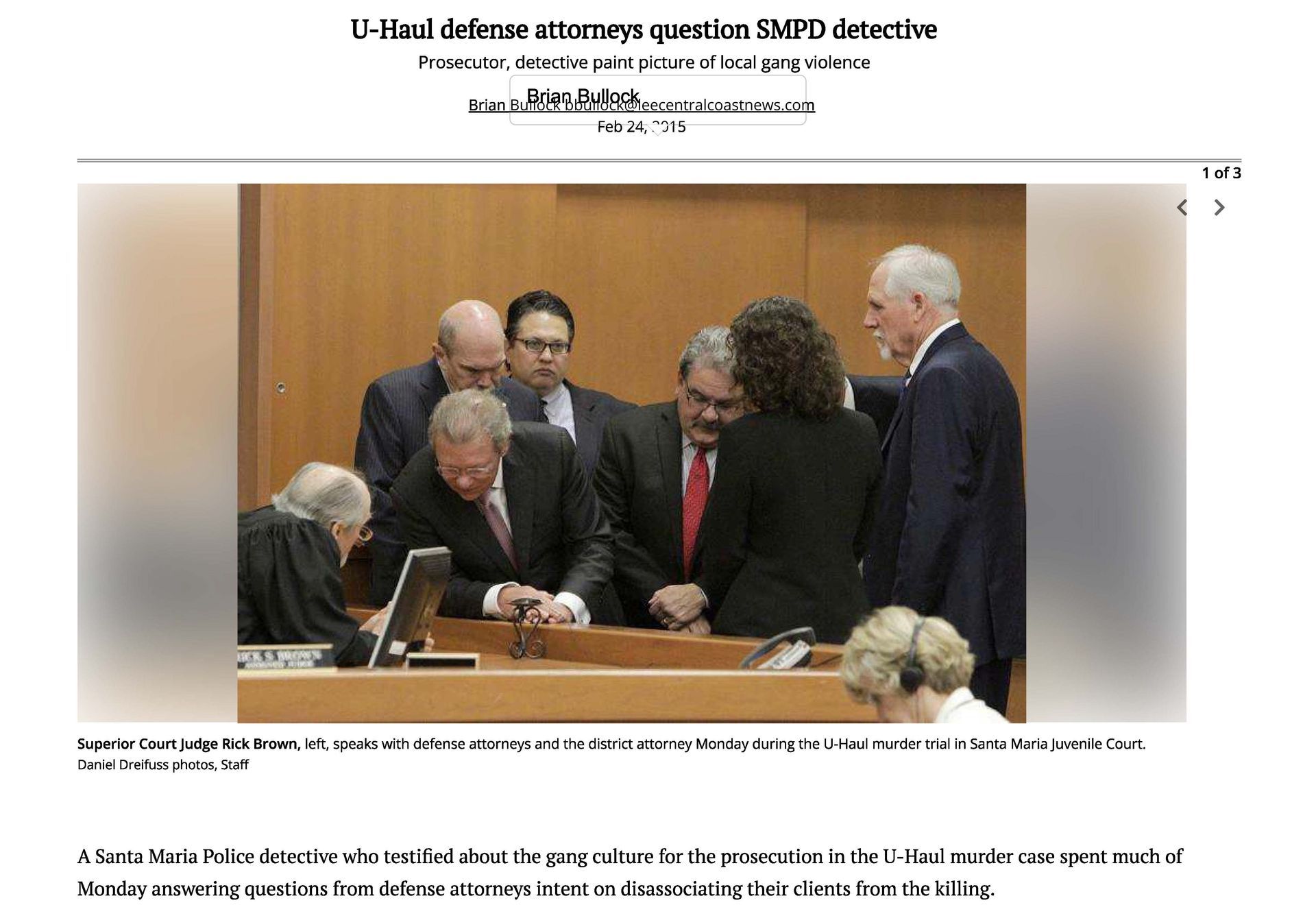 This was the "U-Haul Murder Trial," as the press called it, Addison's client was the only one of the six co-defendants that has gone home, The other five co-defendants were convicted of charges that resulted in life without the possibility of Parole (LWOPP) There was a hung jury on Addison's client's portion on the case, the case then resolved for a kidnapping charge