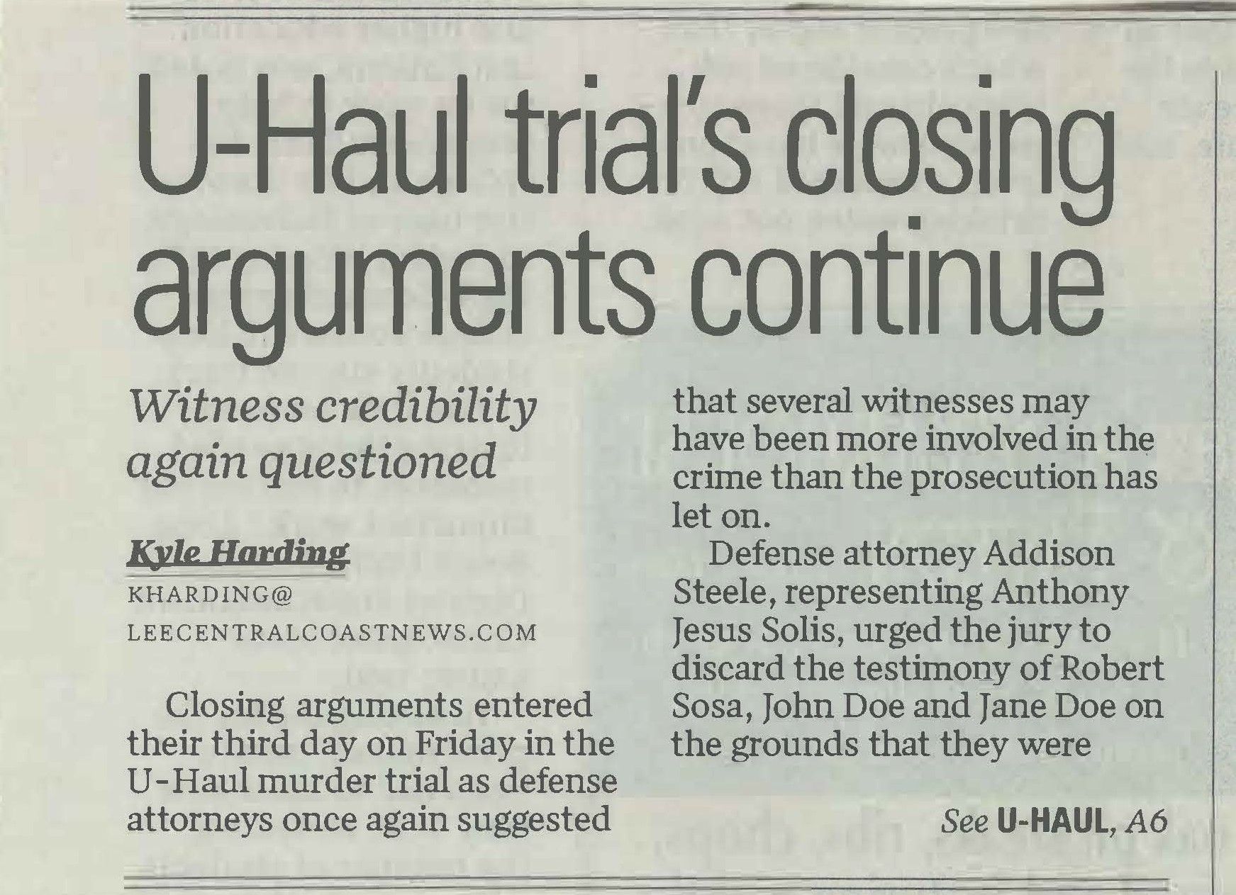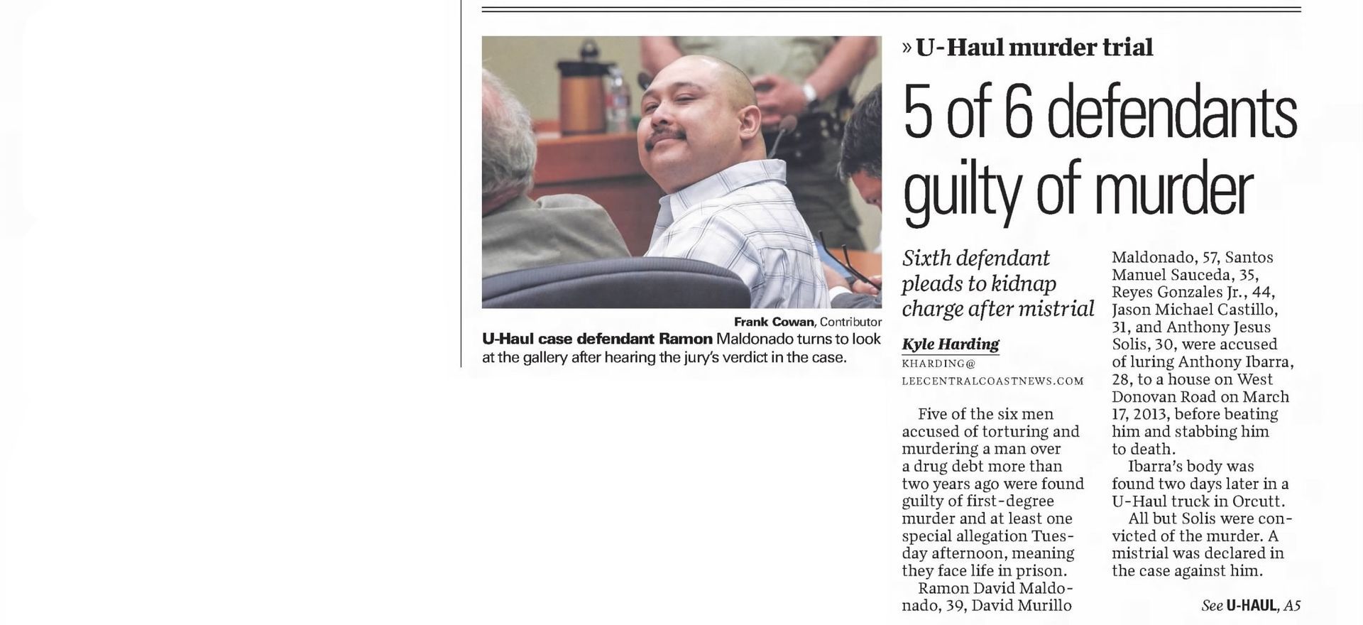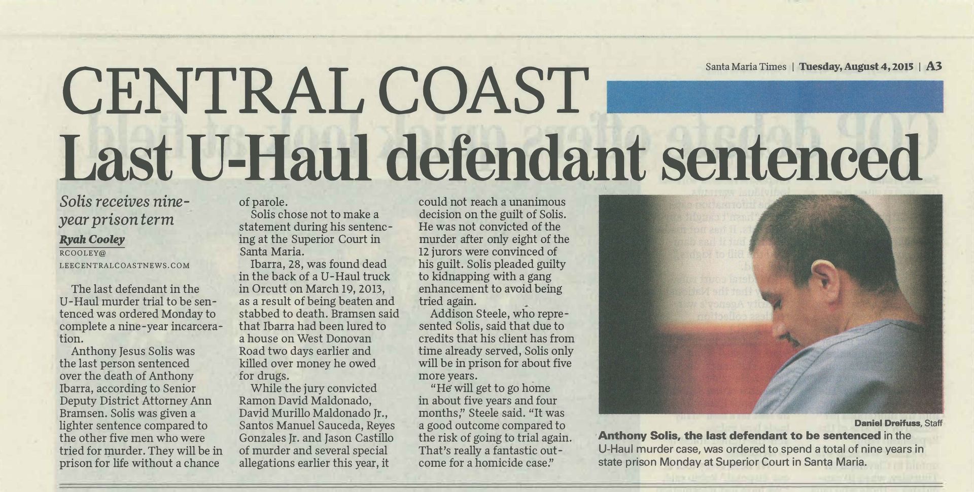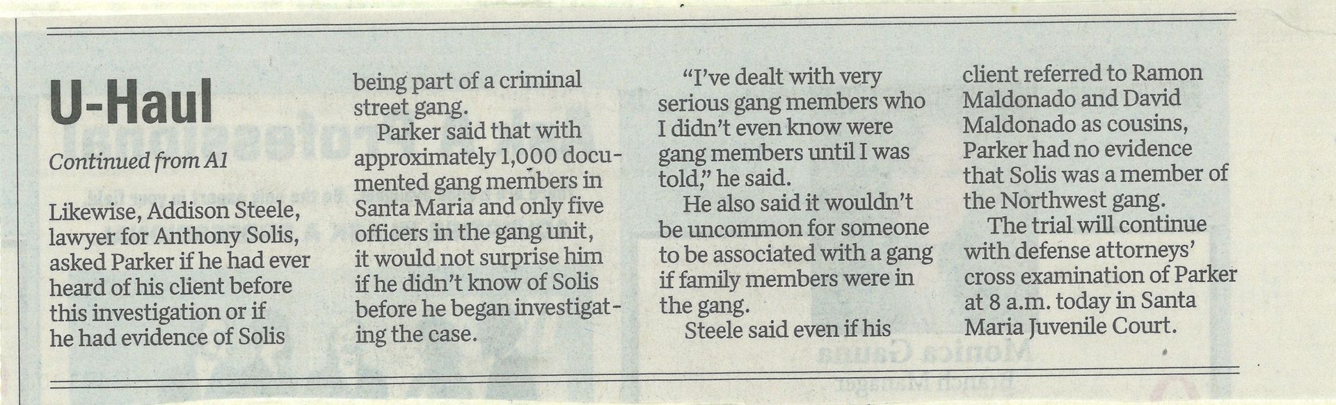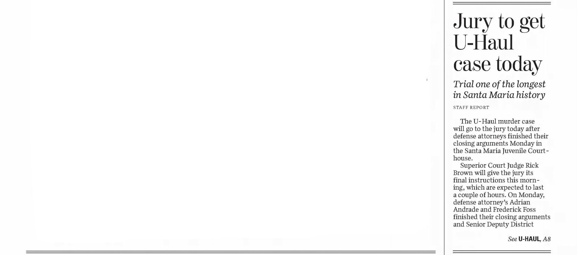 This was the "U-Haul Murder Trial," as the press called it, Addison's client was the only one of the six co-defendants that has gone home, The other five co-defendants were convicted of charges that resulted in life without the possibility of Parole (LWOPP) There was a hung jury on Addison's client's portion on the case, the case then resolved for a kidnapping charge