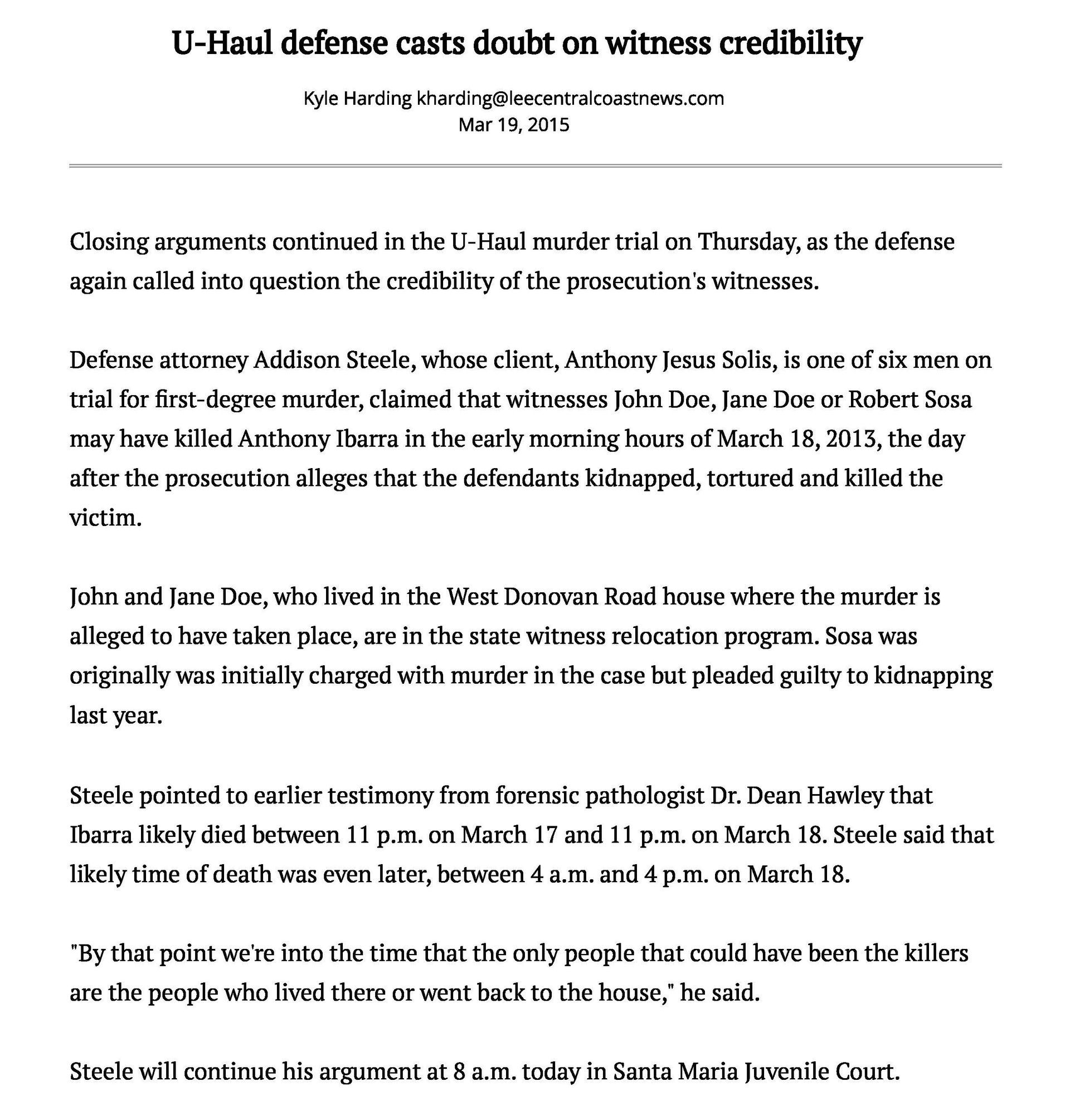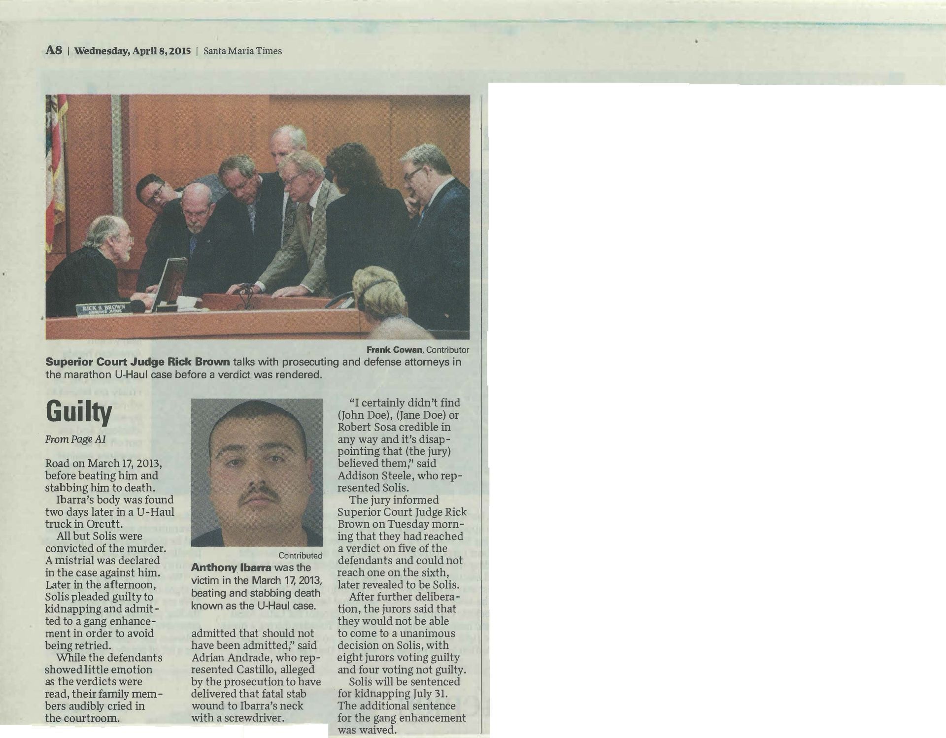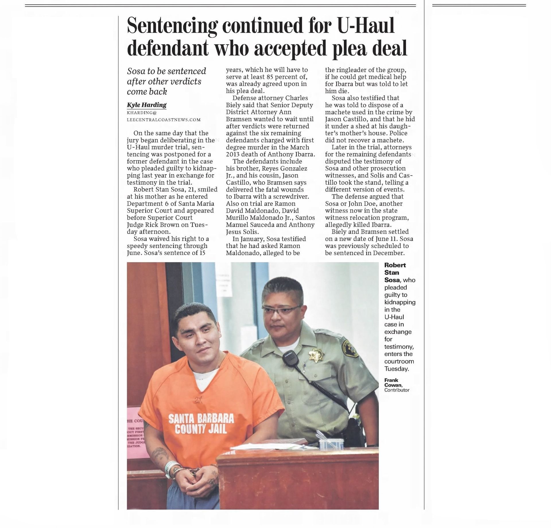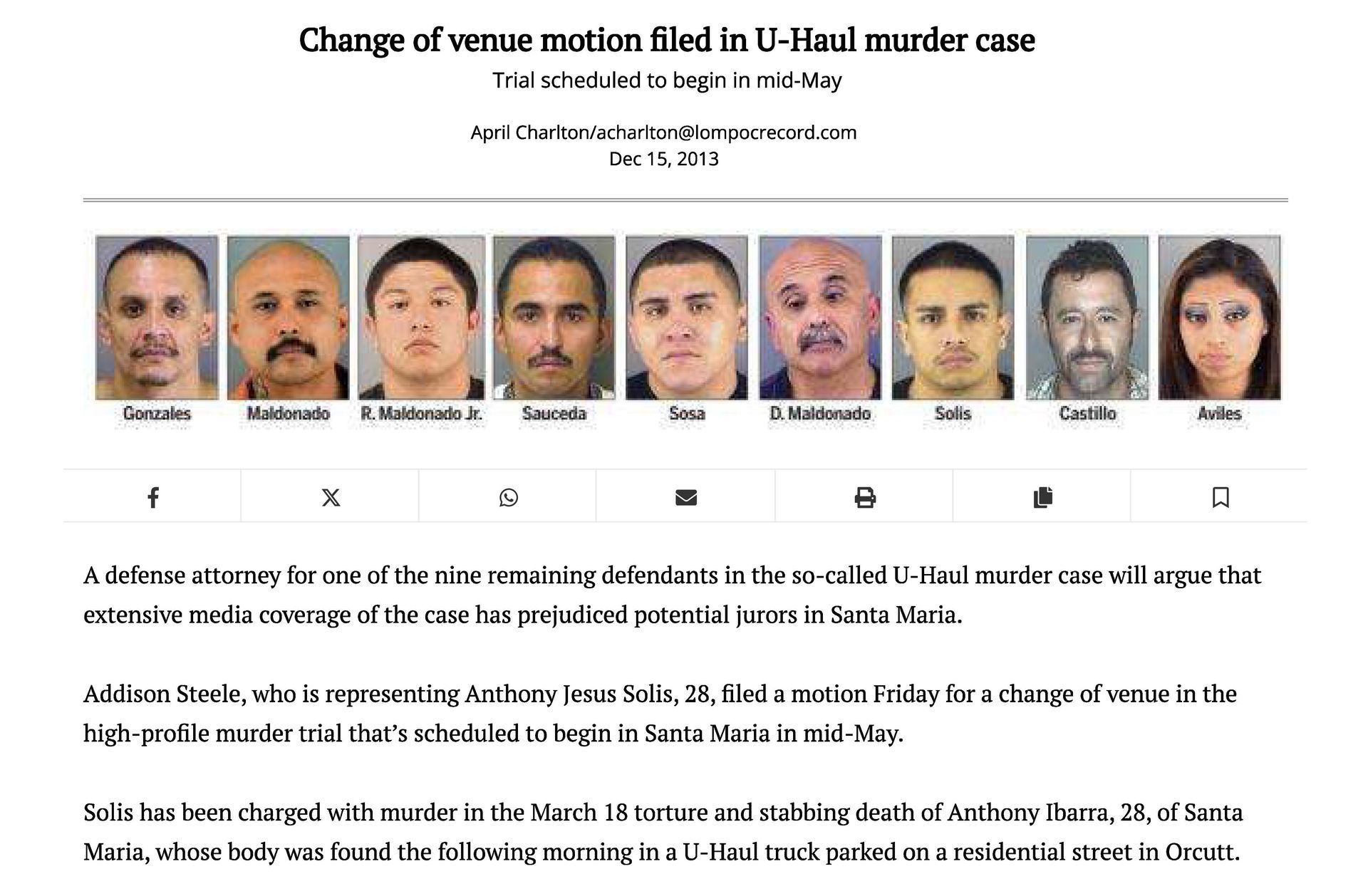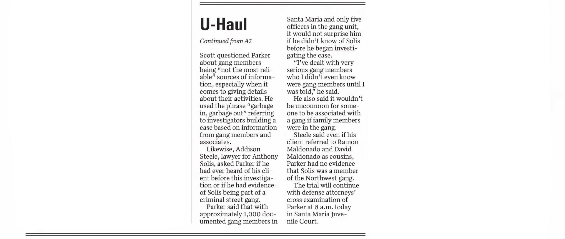 This was the "U-Haul Murder Trial," as the press called it, Addison's client was the only one of the six co-defendants that has gone home, The other five co-defendants were convicted of charges that resulted in life without the possibility of Parole (LWOPP) There was a hung jury on Addison's client's portion on the case, the case then resolved for a kidnapping charge
