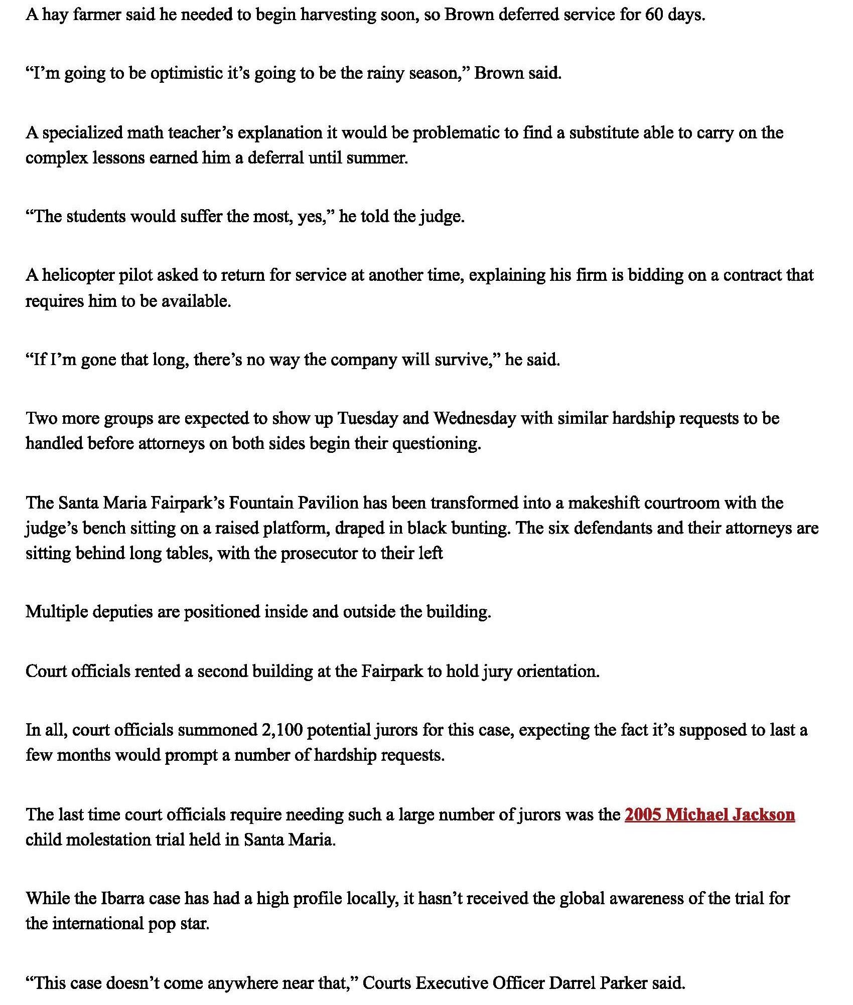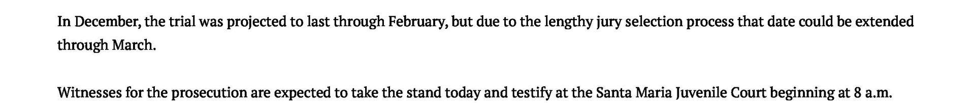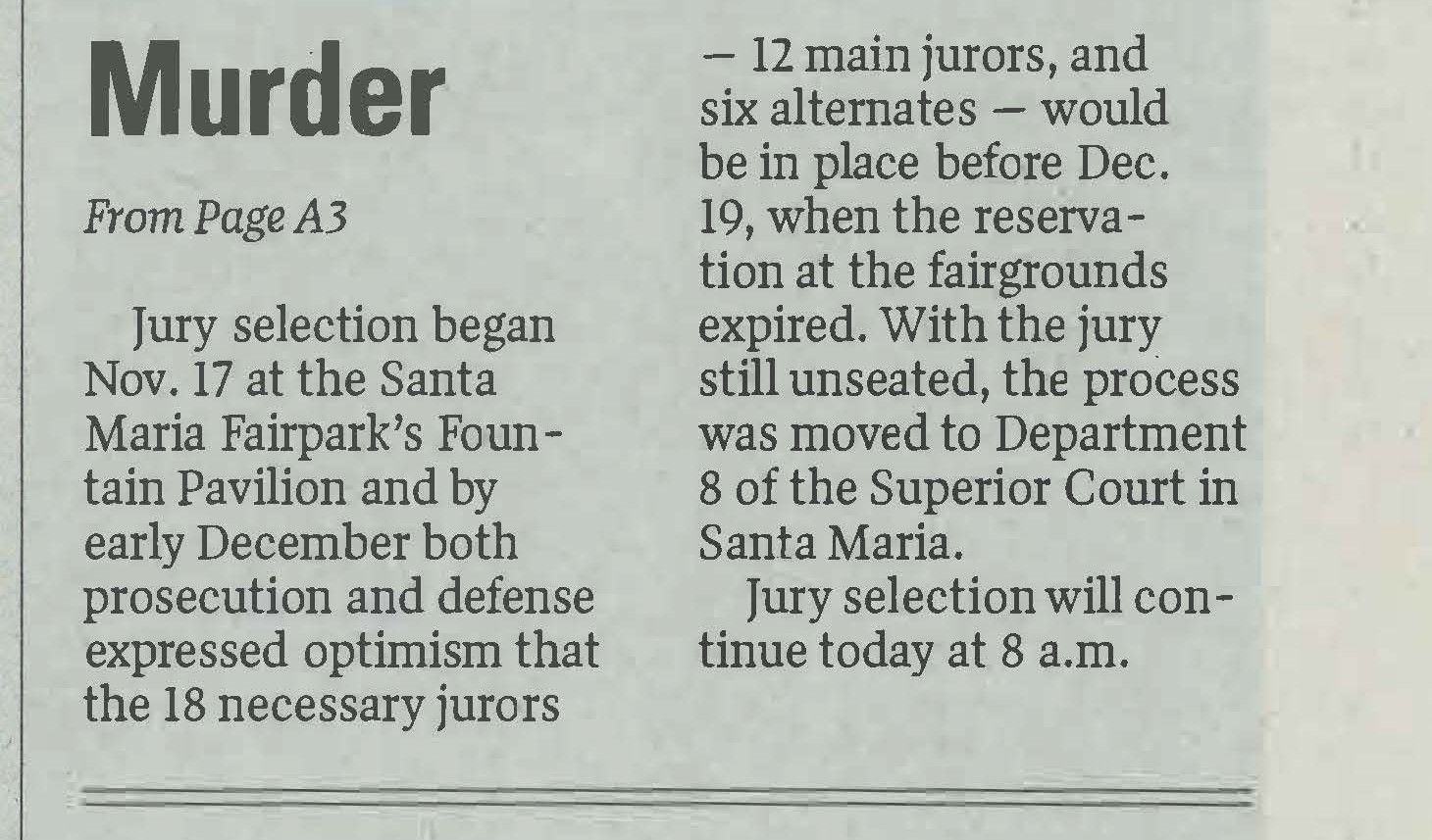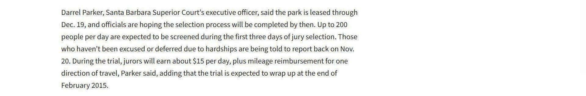 In a one defendant non-life sentence exposure case, the typical jury trial, there are a total of twenty pre-emptory challenges allowed, and typically a panel of 80 to 100 prospective jurors are called, depending on the type of case. In this case there were 140 pre-emptory challenges allowed. Many hundreds of potential jurors were called in. The courts rented a warehouse on the Santa Maria Fairgrounds to conduct the jury selection. Normally jury trials go four days a week, or even three days a week, so the judge can conduct other court business, that also allows the lawyers to work on the trial on the non-trial days as well, however this trial was specially assigned to a retired judge so the trial went five days a week, starting at 8:00 a.m. with a half hour lunch break and two fifteen minutes breaks, one in the morning and one in the afternoon, the trial was run on the same schedule that fast food workers experience, the lawyers had to scramble to handle their other matters, and had to work non-stop because of the lack of normal "down time," which isn't actually down time, it's time used for the trial. After 79 court days of trial, on a five days a week schedule held over several months, the jury came back with verdicts.