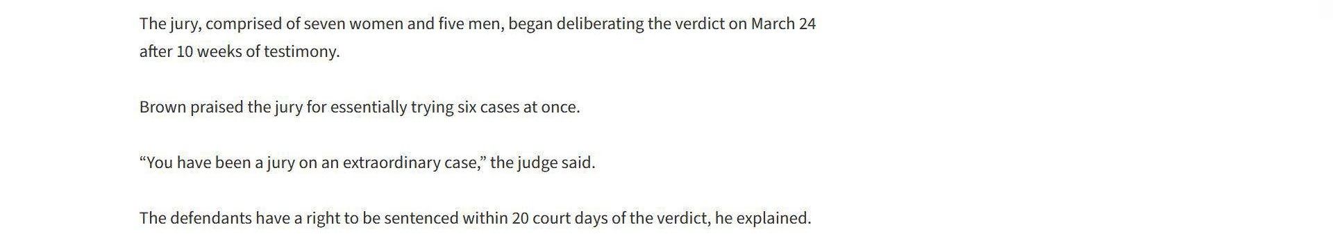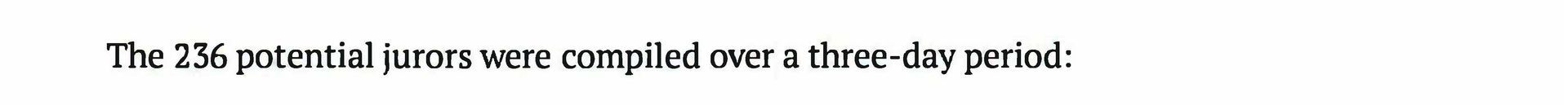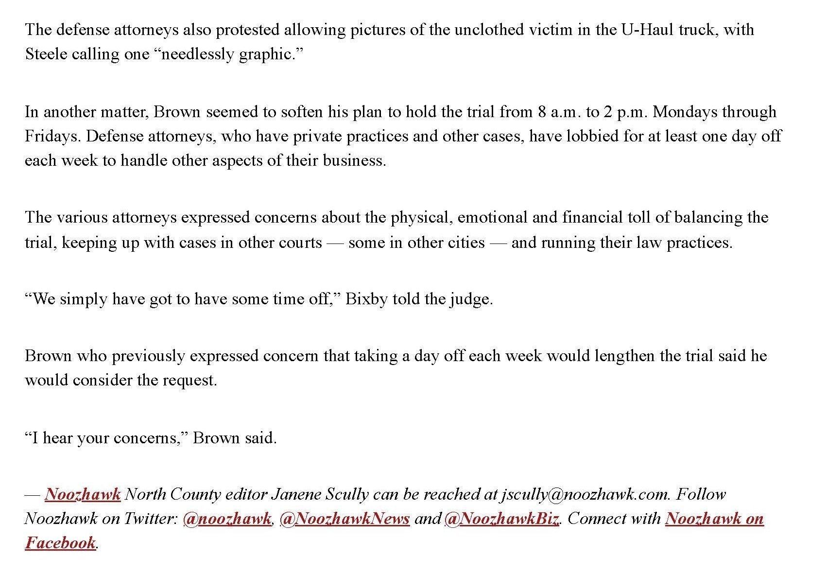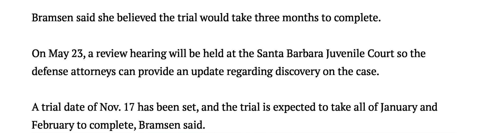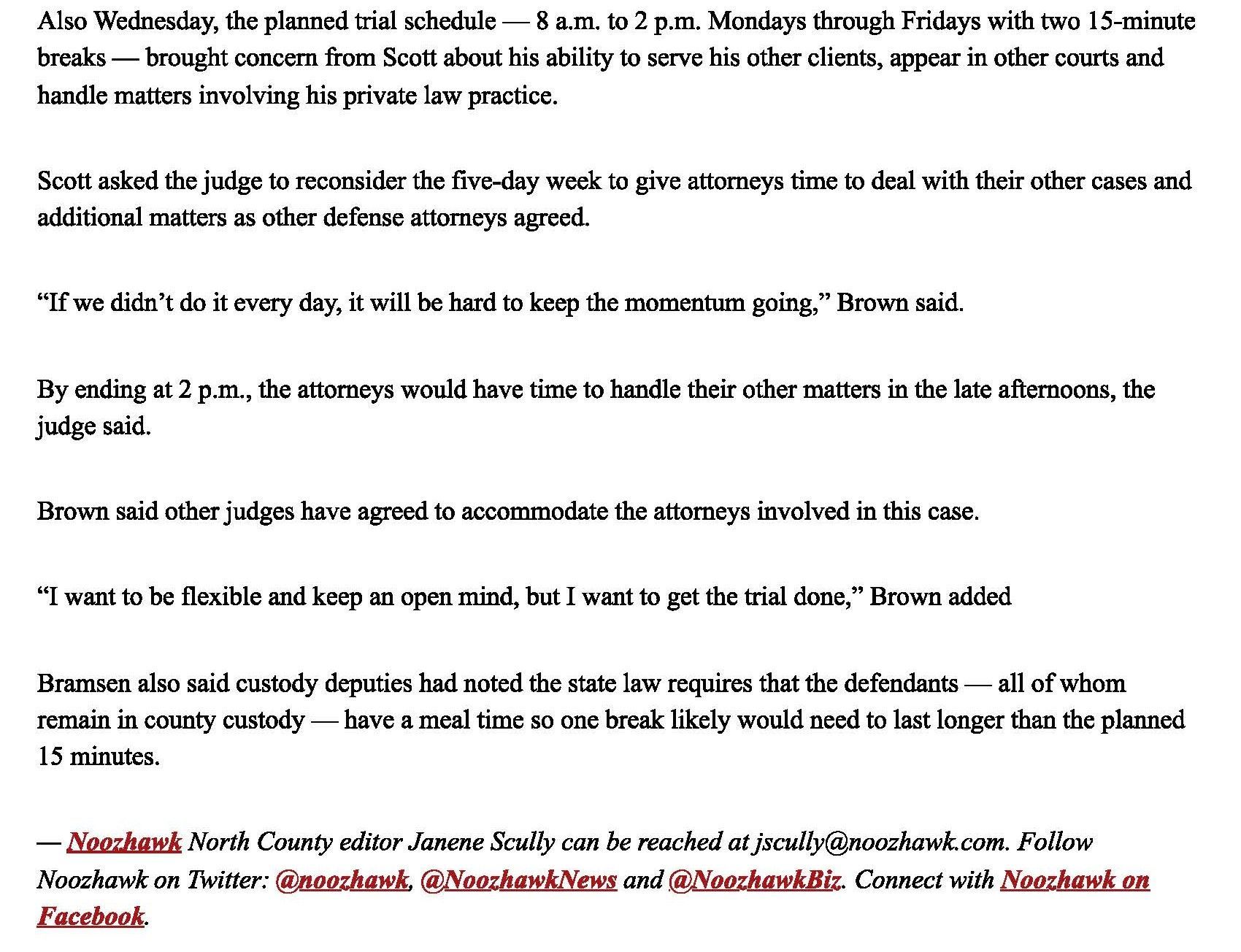 In a one defendant non-life sentence exposure case, the typical jury trial, there are a total of twenty pre-emptory challenges allowed, and typically a panel of 80 to 100 prospective jurors are called, depending on the type of case. In this case there were 140 pre-emptory challenges allowed. Many hundreds of potential jurors were called in. The courts rented a warehouse on the Santa Maria Fairgrounds to conduct the jury selection. Normally jury trials go four days a week, or even three days a week, so the judge can conduct other court business, that also allows the lawyers to work on the trial on the non-trial days as well, however this trial was specially assigned to a retired judge so the trial went five days a week, starting at 8:00 a.m. with a half hour lunch break and two fifteen minutes breaks, one in the morning and one in the afternoon, the trial was run on the same schedule that fast food workers experience, the lawyers had to scramble to handle their other matters, and had to work non-stop because of the lack of normal "down time," which isn't actually down time, it's time used for the trial. After 79 court days of trial, on a five days a week schedule held over several months, the jury came back with verdicts.