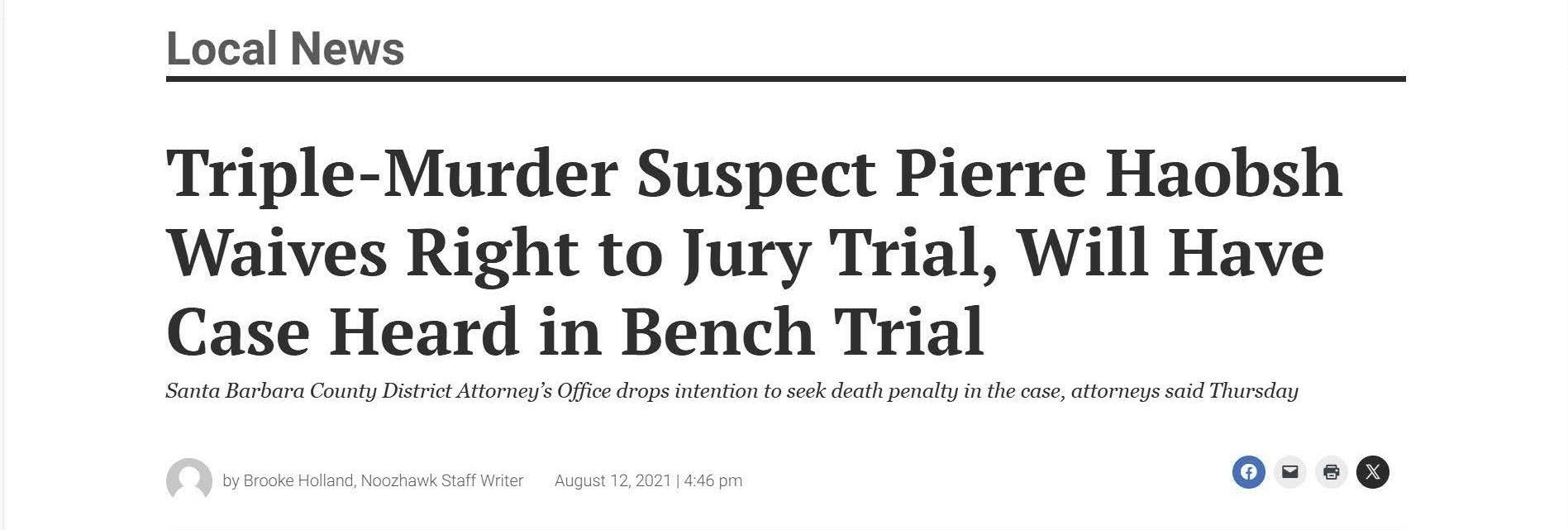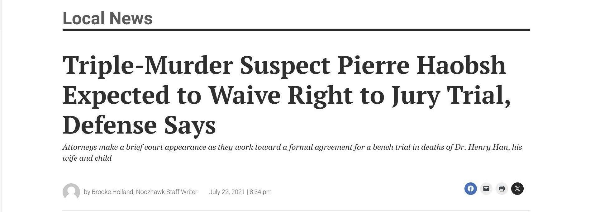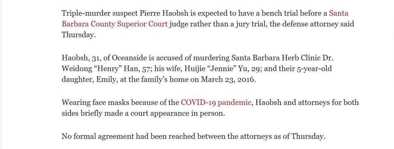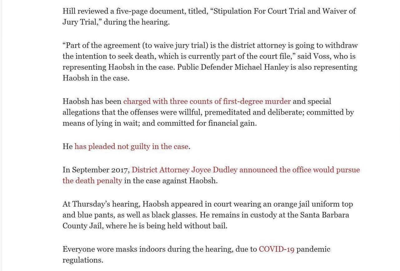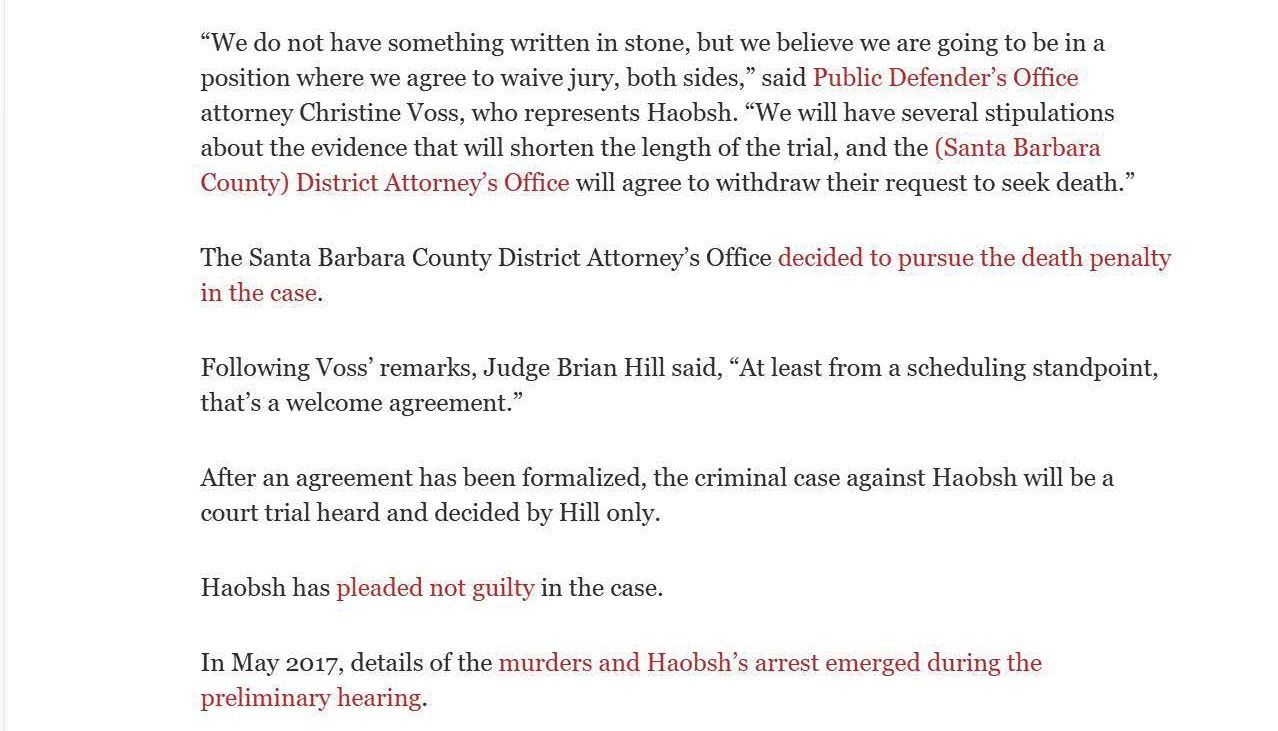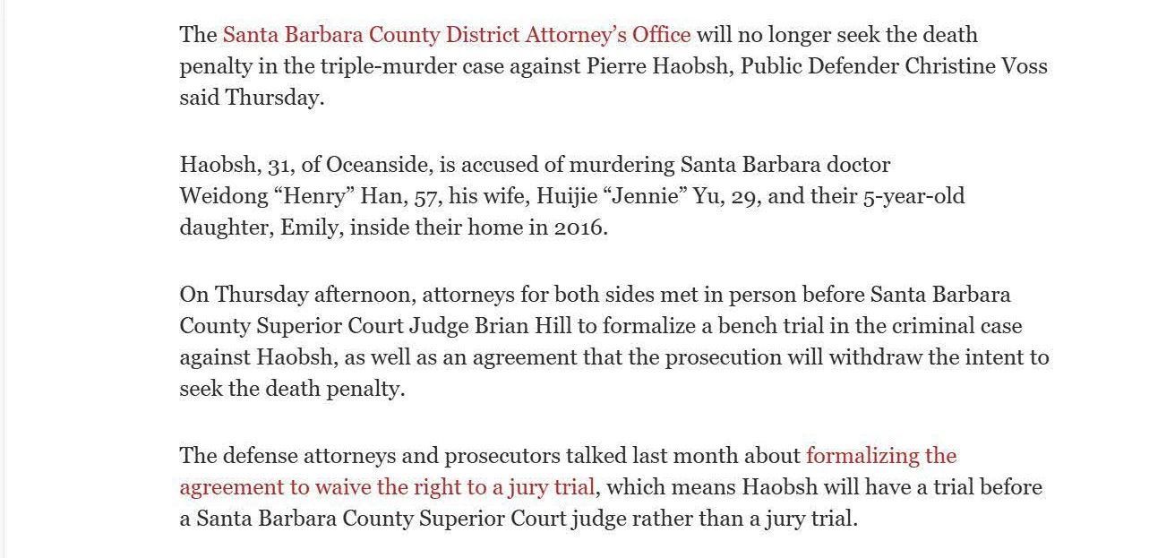 This is the press from Christine won the Haobsh case by agreeing to have a court trial (a trial just with the judge), instead of a jury trial, in exchange for the removal of the death penalty from the case. Removing the risk of a death sentence is an overwhelming victory for the defense.