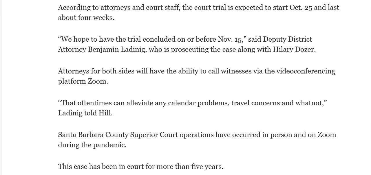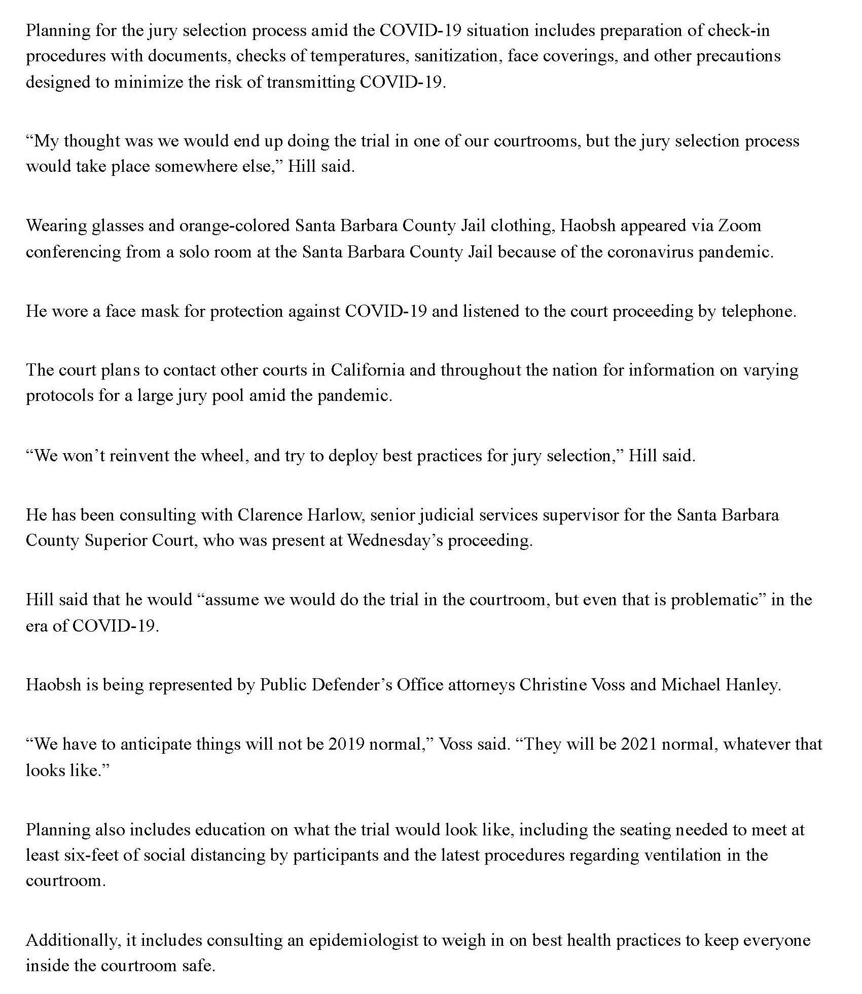 This was a true pandemic trial. It was one of the first in Santa Barbara County after the courts were shut down by the pandemic in March of 2020. All the participants wore masks, which puts the defense at a tremendous disadvantage because the client and lawyer cannot see the jurors' facial expressions during jury selection and during the trial. Addison litigated the issue and made a motion for transparent masks for the jurors. That motion was denied. The witness box was enclosed in a transparent barrier and the was a large transparent barrier between the defense and prosecution sides of the counsel table. The majority of the jurors did not sit in the jury box. Only three jurors sat in the jury box spaced six feet apart. The rest of the jurors and the alternates were seated in the gallery, behind the lawyers, spaced six feet apart. There was only one bench in the very back for the public. Again this was a huge disadvantage to the defense because Addison could not see the jury to gauge their reactions during the trial. However no amount of making motions or objecting could change the way the trial was conducted in pandemic conditions. There was one advantage, the jury selection was conducted very small groups, so it was almost individual voir dire, something that is normally only granted in capital murder cases, and even then rarely, This is called Hovey voir dire (Hovey v. Super Court (1980) 28 Cal.3d 1) and is advantageous to defense.