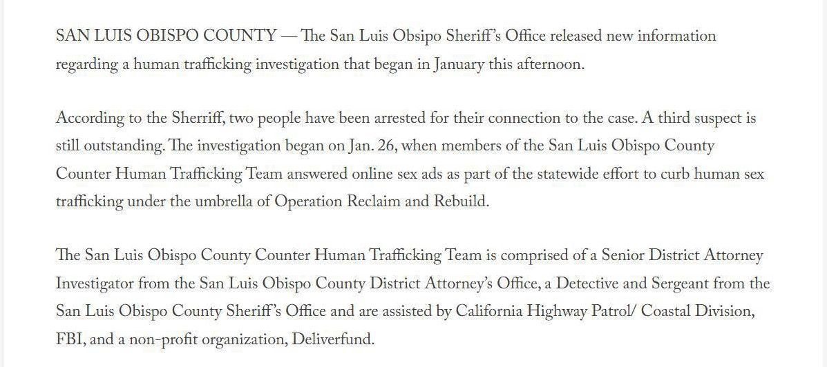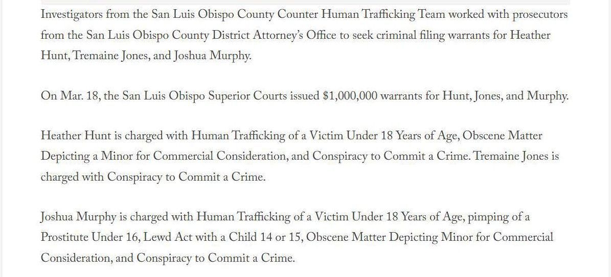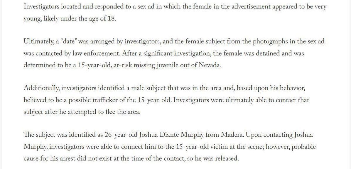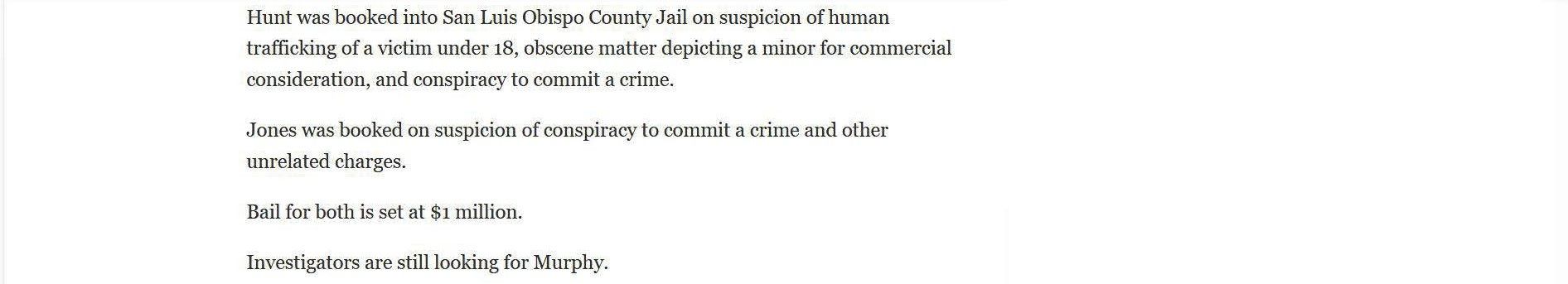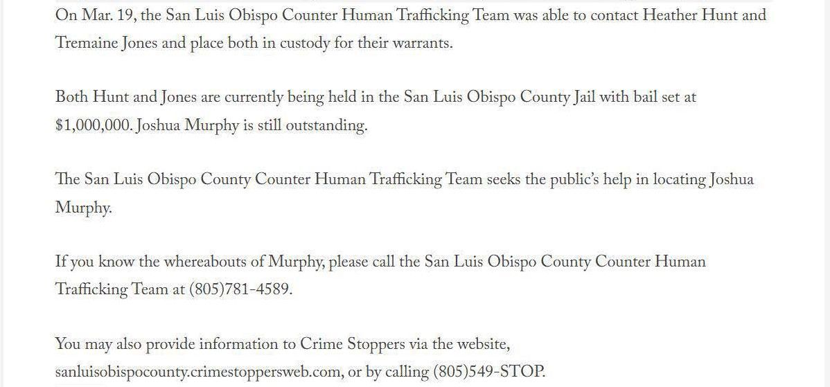 The article below illustrates the biased reporting that resulted from the San Luis Obispo County District Attorney's press release. The article doesn't mention that for two of the defendants the outcome was a tremendous victory. They were both saved from serving life in prison sentences. It also implies that Joshua Murphy was in possession of a cache of child pornography, which is not true. Joshua had a copy of the sex advertisements that Jazmin Doe had used to get prostitution customers. The evidence presented at the trial by Jazmin Doe was that she placed online ads. The article fails to mention that Jazmin Doe testified that she held herself out to be twenty years old in the dating application where Joshua and she met, and that she told co-defendant Heather Hunt that she was nineteen years old. The article does not mention that Joshua testified that he believed that Jazmin Doe was twenty years old and that any reasonable person that saw the photos of Jazmin Doe at the time would have believed that she was twenty years old, if not older. The article also say that Jazmin Doe was "lured" from her home in Nevada, when in fact Jazmin Doe testified that she went with the defendants voluntarily.
