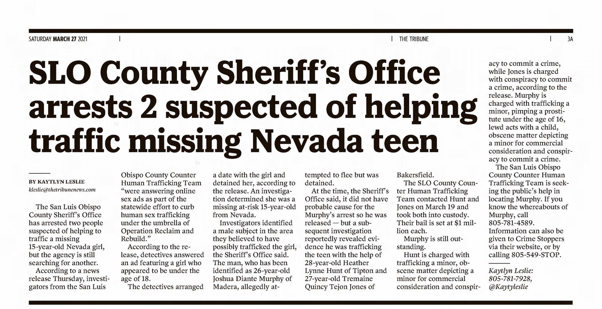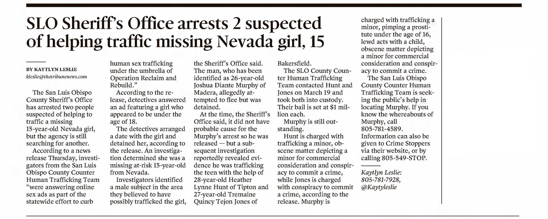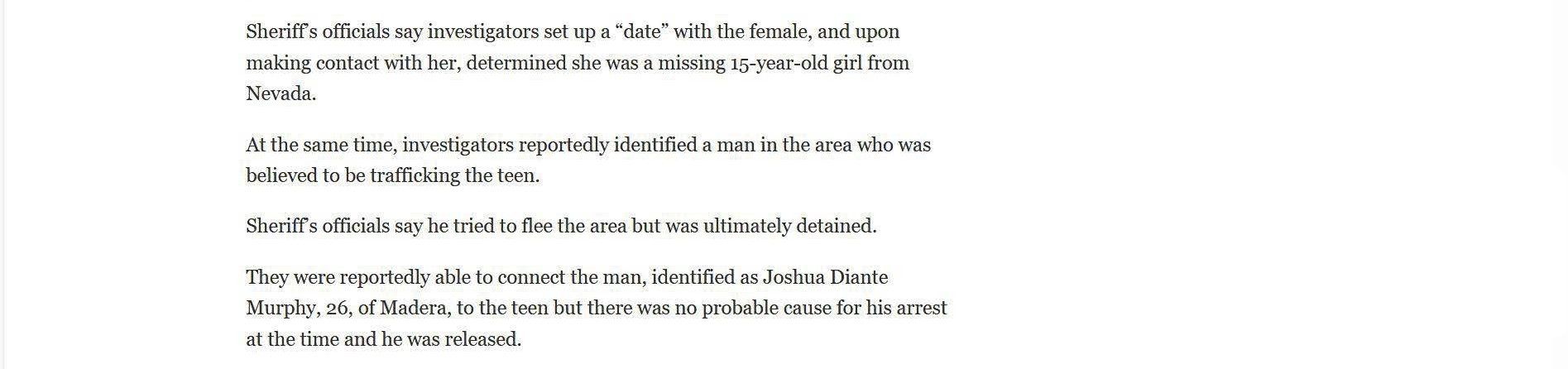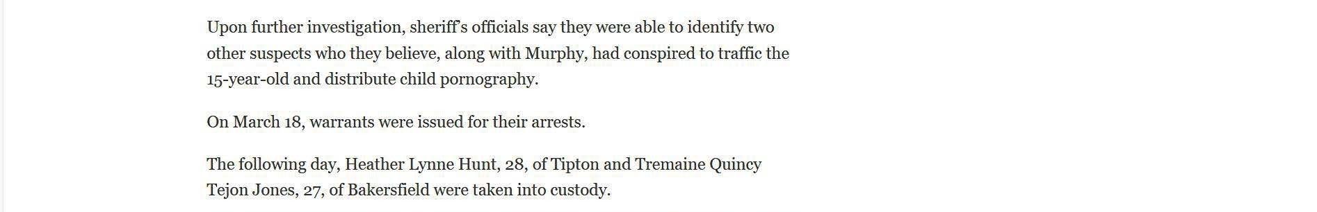 The article below illustrates the biased reporting that resulted from the San Luis Obispo County District Attorney's press release. The article doesn't mention that for two of the defendants the outcome was a tremendous victory. They were both saved from serving life in prison sentences. It also implies that Joshua Murphy was in possession of a cache of child pornography, which is not true. Joshua had a copy of the sex advertisements that Jazmin Doe had used to get prostitution customers. The evidence presented at the trial by Jazmin Doe was that she placed online ads. The article fails to mention that Jazmin Doe testified that she held herself out to be twenty years old in the dating application where Joshua and she met, and that she told co-defendant Heather Hunt that she was nineteen years old. The article does not mention that Joshua testified that he believed that Jazmin Doe was twenty years old and that any reasonable person that saw the photos of Jazmin Doe at the time would have believed that she was twenty years old, if not older. The article also say that Jazmin Doe was "lured" from her home in Nevada, when in fact Jazmin Doe testified that she went with the defendants voluntarily.