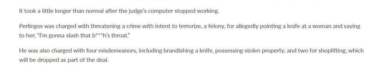 - Charges: Dissuading a witness (Penal Code § 136.1(b)(1)) with a special allegation of force or threat (Penal Code § 136.1(c)(1)), vandalism (Penal Code § 594(b)(1) and shoplifting (Penal Code § 459.5(a)).