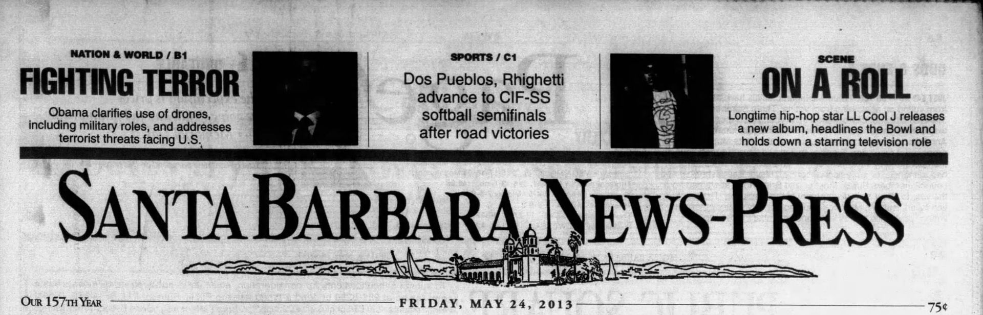 What Were Noozhawk's 16 Most-Read Stories of 2016?: Carnage, killings, wildfires and court cases captivated readers during a tumultuous year | December 30, 2016 | Noozhawk | Tom Bolton and Giana Magnoli Man Gets Seven Years in Domestic Violence Case | December 21, 2016 | Santa Barbara Independent | Kelsey Brugger Santa Maria youth basketball coach to face trial on molestation charges | December 20, 2016 | San Luis Obispo Tribune | Janene Scully Santa Maria Youth Basketball Coach Will Face Trial on Molestation Charges | December 19, 2016 | Noozhawk | Janene Scully Tentative April Trial Date Set for Goleta-Area Quadruple Murder Case: Nicolas Holzer has entered an insanity plea to charges he murdered his parents and two sons in August of 2014 | December 15, 2016 | Noozhawk | Giana Magnoli Han family murder suspect sent letter to DA after alleged crimes | December 6, 2016 | News Channel 12-3-11 | News Channel 3-12 Basketball coach charged with lewd acts pleads not guilty | December 5, 2016 | Santa Maria Times | Gina Kim Preliminary Hearing Date Delayed for Santa Barbara-Area Triple-Murder Suspect | November 15, 2016 | Noozhawk | Giana Magnoli Han Family Murder Suspect Appears Appears in Santa Barbara Court Tuesday | August 9, 2016 | News Channel 12-3-11 | News Channel 3-12 Hearing Delayed for Suspect in Han Family Triple Murder Case | August 9, 2016 | Noozhawk | Brooke Holland Former youth pastor charged with sex abuse sentenced to 8 years | July 6, 2016 | Santa Maria Times | Gina Kim Haobsh Claims Innocence in Han Family Murders: Not Guilty Plea Pushes Case Forward | May 5, 2016 | Santa Barbara Independent | Lena Garcia Triple-Murder Suspect Pleads Not Guilty in Santa Barbara Superior Court | May 5, 2016 | Noozhawk | Giana Magnoli Operation Matador defendants will wait to set preliminary hearing: Suspects linked to MS-13 will return to court in July | April 29, 2016 | Santa Maria Times | Gina Kim Attorneys Subpoena Mental-Health Records in Goleta-Area Quadruple Murder Case: Nicolas Holzer has entered an insanity plea for killing of his parents and 2 children in 2014 | April 26, 2016 | Noozhawk | Giana Magnoli Arraignment for SM man accused of sex abuse continued | April 25, 2016 | Santa Maria Times | April Charlton Haobsh Denied Access to Public Defender; Attorney Not Allowed in County Jail, Calls Block "Unprecedented" | April 14, 2016 | Santa Barbara Independent | Lena Garcia Pierre Haobsh Makes Second Court Appearance | April 13, 2016 | YouTube | News Channel 3-12 Arraignment Delayed Again For Triple-A Suspect Pierre Haobsh: Man accused of killing Dr. Weidong "Henry" Han, his wife and daughter ordered to return to Santa Barbara Superior Court on May 5 | April 12, 2016 | Noozhawk | Giana Magnoli Inside the Han Family Murders: The Investigation, and Legacy of Dr. Henry Han | March 30, 2016 | Santa Barbara Independent | Lena Garcia Triple-Homicide Suspect Appears in Court to Face First-Degree Murder Charges: Pierre Haobsh is also accused of special allegations that could lead to death penalty in slayings of 3 Han family members | March 28, 2016 | Noozhawk | Sam Goldman MS-13 Gang Arraignment | March 18, 2016 | YouTube | Santa Maria Times