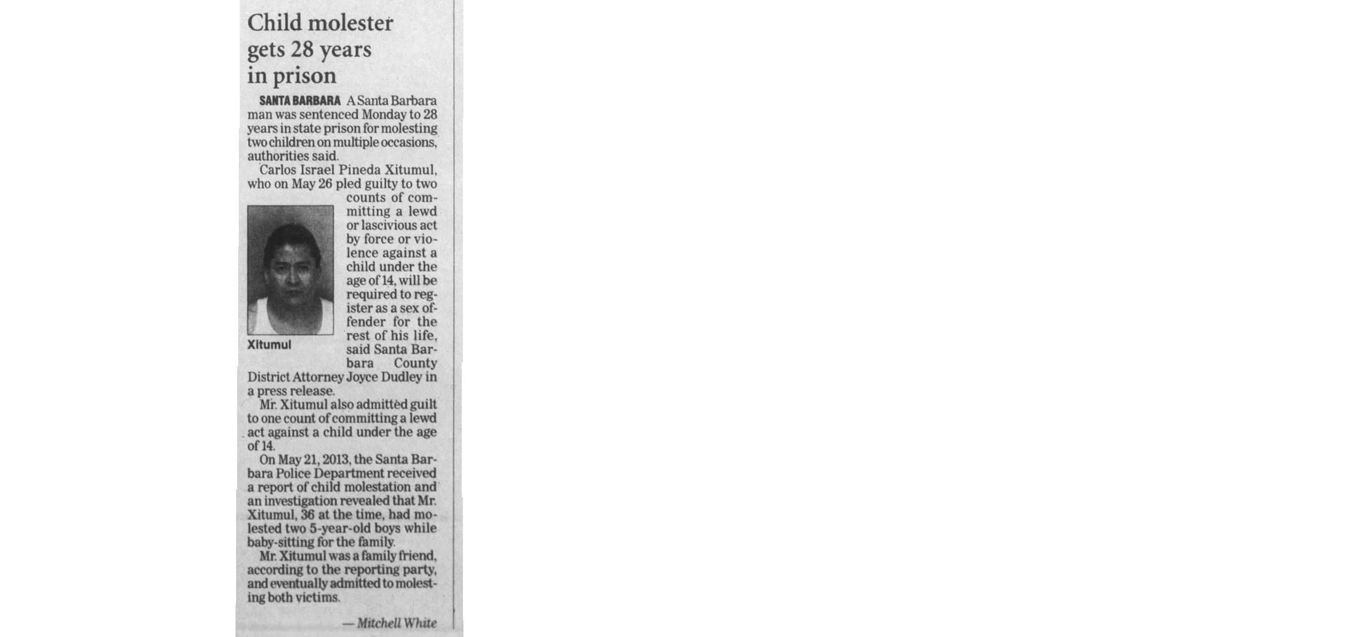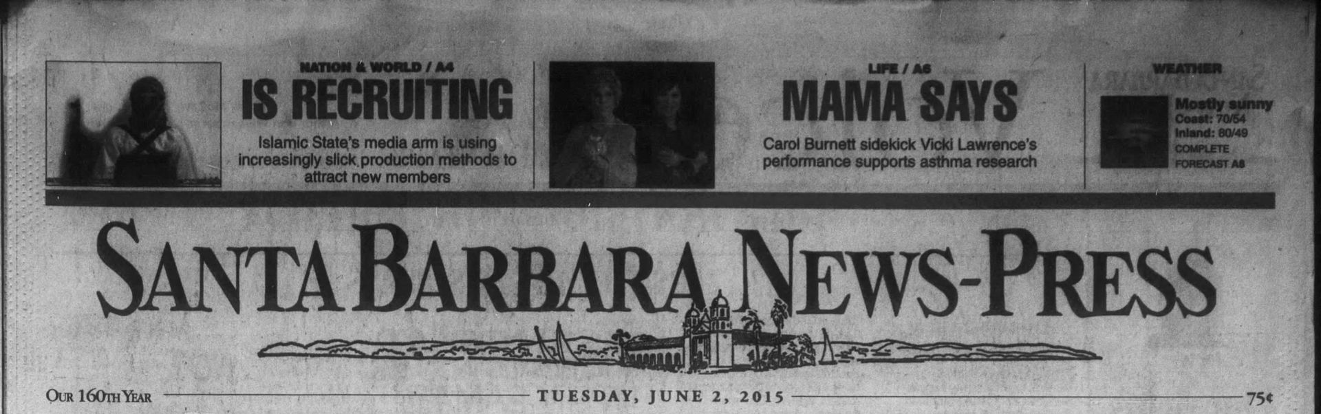 Defendants In Marilyn Pharis's Death Make Brief Court Appearance | November 19, 2015 | Noozhawk | Janene Scully Goleta-Area Man Accused of Killing His Family Enters Not Guilty by Reason of Insanity | October 21, 2015 | Noozhawk | Lara Cooper Arraignment Delayed for Former Hancock College Basketball Players Charged With Murder | October 19, 2015 | Noozhawk | Janene Scully At a Glance: Santa Maria: Arraignment continued again in Lompoc murder case | September 30, 2015 | Lompoc Record Men accused in Marilyn Pharis attack in court, case continued: New attorney on board as Public Defender's Office prepares for potential death penalty defense | September 17, 2015 | Santa Ynes Valley News | Kyle Harding Men accused in Marilyn Pharis attack in court, case continued: New attorney on board as Public Defender's Office prepares for potential death penalty defense | September 17, 2015 | Santa Maria Times | Kyle Harding Psychiatric Search Narrows in Holzer Case: Five Forensic Experts Considered to Perform Evaluation | September 16, 2015 | Santa Barbara Independent | Kelsey Knorp Prosecution in Lompoc murder case focuses on social media activity | September 1, 2015 | Santa Maria Times | Kenny Lindberg Inept Inmate Care by Corizon? Supervisors Must Decide Path for County Inmates' Health | August 20, 2015 | Santa Barbara Independent | Kelsey Brugger Defense continues cross-examination of boy, 14 | August 20, 2015 | Santa Barbara Times | Kenny Lindberg Man Accused of Murdering Family May Enter Insanity Plea in Santa Barbara Court | August 11, 2015 | Noozhawk | Lara Cooper Last U-Haul defendant sentenced | August 3, 2015 | Santa Ynez Valley News | Ryah Cooley Last U-Haul defendant sentenced | August 3, 2015 | Santa Maria Times | Ryah Cooley Man accused of ordering murder from behind bars appears in court: Three others enter not-guilty pleas, will proceed to trial | July 21, 2015 | Santa Maria Times | Kyle Harding Judge Rules Former Allan Hancock College Basketball Players to Be Tried on Murder, Other Charges | June 24, 2015 | Noozhawk | Janene Scully Preliminary Hearing Begins for Former Hancock College Basketball Players Charged with Murder: Ali Mohammed and Lavell White are accused of the fatal shooting of a 23-year-0ld man in Santa Maria during an alleged drug deal | June 23, 2015 | Noozhawk | Janene Scully Preliminary hearing set in robbery and carjacking case | May 27, 2015 | Santa Maria Times | Kyle Harding Five Men Sentenced to Life in Prison Without Parole for Torture-Murder of Anthony Ibarra: Judge rules on numerous motions during the hearing, during which family members of Ibarra speak out about 'the nightmare that will never end | May 22, 2015 | Noozhawk | Janene Scully Trio Held to Answer on Charges Related to Guadalupe Homicide | May 16, 2015 | Lompoc Record | Kyle Harding State Prison Inmate Accused of Orchestrating Murder of Santa Maria Man: Judge rules three other defendants should stand trial in the shooting of Javier Limon | May 15, 2015 | Noozhawk | Janene Scully 5 of 6 Defendants Found Guilty of First Degree Murder in U-Haul Trial: Sixth defendant pleads to kidnapping after mistrial declared | April 7, 2015 | Santa Maria Times | Kyle Harding 5 of 6 Defendants Found Guilty of First Degree Murder in U-Haul Trial: Sixth defendant pleads to kidnapping after mistrial declared | April 7, 2015 | Santa Ynez Valley News | Kyle Harding 5 Men Found Guilty in Santa Maria Torture-Murder Case: Jury in Ibarra case returns guilty verdicts against five of the six defendants | April 7, 2015 | Noozhawk | Janene Scully U-Haul juror dismissed, deliberations start over | March 31, 2015 | Santa Maria Times | Kyle Harding Jury Begins Deliberating in Santa Maria Torture-Murder Trial | March 24, 2015 | Noozhawk | Janene Scully U-Haul closing arguments continue | March 20, 2015 | Santa Maria Times | Kyle Harding U-Haul defense casts doubt on witness credibility | March 19, 2015 | Santa Maria Times | Kyle Harding County Lines: Santa Maria: U-Haul defense casts doubt on witness credibility | March 19, 2015 | Santa Maria Times No hearing yet for Hancock College basketball players | March 16, 2015 | Santa Maria Times | Staff Report Sentencing Hearing an Explosive Ending to Santa Barbara County's First Human Trafficking Trial: Brannon Lawrence Pitcher, found guilty by a jury of prostituting a teen girl, is kicked out of the courtroom for shouting at the judge | March 13, 2015 | Noozhawk | Lara Cooper Second Defendant Testifies in Ibarra Murder Trial | March 13, 2015 | Noozhawk | Janene Scully Second U-Haul Defendant Testifies, Counters Allegations | March 12, 2015 | Lompoc Record | Kyle Harding Sentencing Delayed in Human Trafficking Case | March 8, 2015 | Santa Barbara Independent | Colleen Flaherty Cameron Oliver Arraigned on Murder Charges is Drunk Driving Crash | March 8, 201 5 | News Channel 12-3-11 | News Channel 3-12 Week 8: Santa Maria Ibarra Murder Trial | March 7, 2015 | New Channel 12-3-11 | News Channel 3-12 Defendant testifies he was not present when Anthony Ibarra died | March 6, 2015 | Santa Maria Times | Kyle Harding U-Haul Defendant Takes the Stand | March 5, 2015 | Santa Maria Times | Kyle Harding Defendant Takes Witness Stand in Own Defense in Ibarra Murder Trial: Anthony "AJ" Solis denies gang membership during testimony | March 5, 2015 | Noozhawk | Janene Scully Defense Expert Testifies About Phrase 'Gang Associate' During Ibarra Murder Trial | March 3, 2015 | Noozhawk | Janene Scully Prosecution Rests in Santa Maria Trial of Six Defendants Charged in Ibarra Murder: Defense attorneys ask the judge to acquit their clients, accused of the gang-related torture-slaying of Anthony Ibarra in March 2013 | February 27, 2015 | Noozhawk | Janene Scully U-Haul defense continues cross-examination of SMPD gang detective | February 26, 2015 | Santa Maria Times | Kyle Harding U-Haul defense attorneys question SMPD detective: Prosecutor, detective paint picture of local gang violence | February 24, 2015 | Santa M